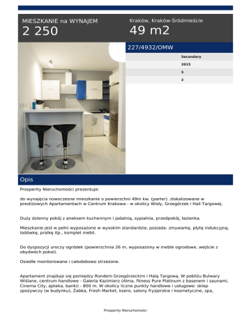 Kraków, Kraków-Śródmieście MIESZKANIE na WYNAJEM 49 m2 2 250 227/4932/OMW Secondary 2015 5 2 Opis Prosperity Nieruchomości prezentuje: do wynajęcia nowoczesne mieszkanie o powierzchni 49m kw. (parter). zlokalizowane w prestiżowych Apartamentach w Centrum Krakowa - w okolicy Wisły, Grzegórzek i Hali Targowej. Duży dzienny pokój z aneksem kuchennym i jadalnią, sypialnia, przedpokój, łazienka. Mieszkanie jest w pełni wyposażone w wysokim standardzie, posiada: zmywarkę, płytę indukcyjną, lodówkę, pralkę itp., komplet mebli. Do dyspozycji uroczy ogródek (powierzchnia 26 m, wyposażony w meble ogrodowe, wejście z obydwóch pokoi). Osiedle monitorowane i całodobowo strzeżone. Apartament znajduje się pomiędzy Rondem Grzegórzeckim i Halą Targową. W pobliżu Bulwary Wiślane, centrum handlowe - Galeria Kazimierz (Alma, fitness Pure Platinum z basenem i saunami, Cinema City, apteka, banki) - 800 m. W okolicy liczne punkty handlowe i usługowe: sklep spożywczy (w budynku), Żabka, Fresh Market, ksero, salony fryzjerskie i kosmetyczne, spa, Prosperity Nieruchomości przychodnie, apteki, restauracje, bankomaty. Do Rynku Głównego - 2 km. W niedalekiej odległości uczelnie wyższe - Uniwersytet Ekonomiczny, Politechnika Krakowska, Collegium Medicum UJ, Akademia Krakowska, Akademia Sztuk Pięknych. W niedalekiej odległości zielone tereny bulwarów wiślanych z trasami rowerowymi i do biegania. W sąsiedztwie stylowa dzielnica - Kazimierz, z licznymi restauracjami i kawiarniami. Dogodna lokalizacja oferuje mieszkańcom komfort życia w ścisłym centrum miasta. Okolica bardzo dobrze skomunikowana z resztą miasta - autobusy i tramwaje. Cena: 2250 zł dla właściciela + opłaty administracyjne 370zł (czynsz, ogrzewanie, ciepła i zimna woda, ścieki,śmieci) + prąd wg zużycia. Istnieje także możliwość wynajęcia miejsca w garażu podziemnym (250zł). Polecam i zapraszam do kontaktu, Bartosz 795 00 10 10 Prosperity Nieruchomości ul. Bandurskiego 24/1 31-515 Kraków www.prosperitynieruchomosci.pl www.prosperity-group.pl Bartosz Nowacki tel. +48 795001010 email: [email protected] Prosperity Nieruchomości Powered by TCPDF (www.tcpdf.org)