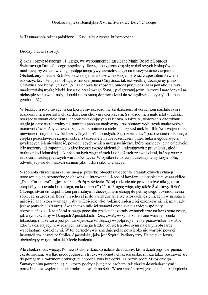 Orędzie Papieża Benedykta XVI na Światowy Dzień Chorego © Tłumaczenie tekstu polskiego – Katolicka Agencja Informacyjna Drodzy bracia i siostry, Z okazji przypadającego 11 lutego, we wspomnienie liturgiczne Matki Bożej z Lourdes Światowego Dnia Chorego wspólnoty diecezjalne zgromadzą się wokół swych biskupów na modlitwę, by zastanowić się i podjąć inicjatywy uwrażliwiające na rzeczywistość cierpienia. Obchodzony obecnie Rok św. Pawła daje nam stosowną okazję, by wraz z apostołem Pawłem rozważyć fakt, że: „jak obfitują w nas cierpienia Chrystusa, tak też wielkiej doznajemy przez Chrystusa pociechy” (2 Kor 1,5). Duchowa łączność z Lourdes przywodzi nam ponadto na myśl macierzyńską troskę Matki Jezusa o braci swego Syna, „pielgrzymującymi jeszcze i narażonymi na niebezpieczeństwa i trudy, dopóki nie zostaną doprowadzeni do szczęśliwej ojczyzny” (Lumen gentium, 62). W bieżącym roku uwagę naszą kierujemy szczególnie ku dzieciom, stworzeniom najsłabszym i bezbronnym, a pośród nich ku dzieciom chorym i cierpiącym. Są wśród nich małe istoty ludzkie, noszące w swym ciele skutki chorób wywołujących kalectwo, a także te, walczące z chorobami ciągle jeszcze nieuleczalnymi, pomimo postępu medycyny oraz pomocy wybitnych naukowców i pracowników służby zdrowia. Są dzieci zranione na ciele i duszy wskutek konfliktów i wojen oraz niewinne ofiary nienawiści bezmyślnych osób dorosłych. Są „dzieci ulicy” pozbawione rodzinnego ciepła i pozostawione samym sobie, a także nieletni zbezczeszczeni przez ludzi niegodziwych, gwałcących ich niewinność, powodujących w nich uraz psychiczny, która naznaczy je na całe życie. Nie możemy też zapomnieć o niezliczonej rzeszy nieletnich umierających z pragnienia, głodu, braku opieki lekarskiej, jak też o małych wygnańcach i uchodźcach ze swej ziemi, którzy wraz z rodzicami szukają lepszych warunków życia. Wszystkie te dzieci podnoszą niemy krzyk bólu, odwołujący się do naszych sumień jako ludzi i jako wierzących. Wspólnota chrześcijańska, nie mogąc pozostać obojętna wobec tak dramatycznych sytuacji, poczuwa się do przemożnego obowiązku interwencji. Kościół bowiem, jak napisałem w encyklice „Deus Caritas est” – „jest rodziną Bożą w świecie. W tej rodzinie nie powinno być nikogo, kto cierpiałby z powodu braku tego, co konieczne” (25,b). Pragnę więc, aby także Światowy Dzień Chorego stwarzał wspólnotom parafialnym i diecezjalnym okazję do pełniejszego uświadomienia sobie, że są „rodziną Bożą” i zachęcał je do uwidaczniania we wioskach, dzielnicach i w miastach miłości Pana, która wymaga, „aby w Kościele jako rodzinie żaden z jej członków nie cierpiał, gdy jest w potrzebie” (tamże). Świadectwo miłości stanowi część życia każdej wspólnoty chrześcijańskiej. Kościół od samego początku przekładał zasady ewangeliczne na konkretne gesty, jak o tym czytamy w Dziejach Apostolskich. Dziś, zważywszy na zmienione warunki opieki lekarskiej, odczuwana jest potrzeba jeszcze ściślejszej współpracy między pracownikami służby zdrowia działającymi w różnych instytucjach zdrowotnych a obecnymi na danym obszarze wspólnotami kościelnymi. W tej perspektywie znajduje pełne potwierdzenie wartość pewnej instytucji związanej ze Stolicą Apostolską, jaką jest Szpital Pediatryczny Dzieciątka Jezus, obchodzący w tym roku 140-lecie istnienia. Ale chodzi o coś więcej. Ponieważ chore dziecko należy do rodziny, która dzieli jego cierpienia, często znosząc wielkie niedogodności i trudy, wspólnoty chrześcijańskie muszą także poczuwać się do pomagania rodzinom dotkniętym chorobą syna lub córki. Za przykładem Miłosiernego Samarytanina potrzebni są ci, którzy pochylają się nad osobami tak ciężko doświadczanymi i potrzebne jest wspieranie ich konkretną solidarnością. W ten sposób przyjęcie i dzielenie cierpienia przekłada się na użyteczne wsparcie dla rodzin chorych dzieci, tworząc wśród nich klimat pogody i nadziei, aby odczuwały one wokół siebie obecność szerszej rodziny braci i sióstr w Chrystusie. Współczucie Jezusa dla płaczu wdowy z Nain (por Łk 7,12-17) i błagalnej modlitwy Jaira (por Łk 8,41-56) stanowią między innymi niektóre pożyteczne punkty odniesienia, aby uczyć się udziału w chwilach udręk fizycznych i moralnych tak wielu doświadczanych rodzin. Wszystko to zakłada miłość bezinteresowną i hojną, odzwierciedlenie i znak miłosiernej miłości Boga, który nigdy nie porzuca swoich dzieci w godzinie próby, lecz nieustannie dostarcza im niezwykłej mocy serca i umysłu, by mogły odpowiednio stawić czoła trudnościom życia. Codzienne poświęcenie i nieustanne zaangażowanie w służbie chorych dzieci stanowią wymowne świadectwo umiłowania ludzkiego życia, zwłaszcza życia osób słabych i całkowicie uzależnionych od innych. Z całą mocą trzeba mianowicie potwierdzić bezwzględną i najwyższą godność każdego ludzkiego życia. Z upływem czasu nie zmienia się nauczanie nieustannie głoszone przez Kościół, że ludzkie życie jest piękne i należy je przeżywać w pełni także wtedy, gdy jest słabe i otoczone tajemnicą cierpienia. Nasz wzrok powinniśmy skierować ku Ukrzyżowanemu Jezusowi: umierając na Krzyżu chciał On dzielić cierpienie całej ludzkości. W Jego cierpieniu w imię miłości dostrzegamy najwyższy współudział w bólu chorych maleństw i ich rodziców. Mój czcigodny poprzednik, Jan Paweł II, który zwłaszcza u schyłku swego życia dał wspaniały przykład cierpliwego przyjmowania cierpienia napisał: „Na Krzyżu znajduje się «Odkupiciel człowieka», Człowiek boleści, który przyjął na siebie cierpienia fizyczne i moralne ludzi wszystkich czasów, aby w miłości mogli odnaleźć zbawczy sens swych cierpień i wartościowe odpowiedzi na wszystkie swe pytania