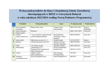 Wykaz podręczników do klasy I Zasadniczej Szkoły Zawodowej obowiązujących w BZSZ w Ustrzykach Dolnych w roku szkolnym 2013/2014 według Nowej Podstawy Programowej Tytuł podręcznika Lp Przedmiot 1. Język angielski zawodowy Język niemiecki Język rosyjski Chemia Zakres podstawowy Matura Prime Time 5. 6. Język polski Historia Odkrywamy na nowo Cz. I „Poznać przeszłość wiek XX” 7. 8. WOS Matematyka „W centrum uwagi” „Matematyka Cz I” Podręcznik dla Zasadniczych Szkół Zawodowych „Odkryć fizykę” Zakres podstawowy Zarys przedsiębiorczości 2. 3. 4. 9. Fizyka 10. Podstawy przedsiębiorczości Autor Virgina Evans Jenny Dooley MEN 355/1/2011 Wydawnictwo MEN: 459/1/2012 Express Publishing Nowa Era Romuald Hassa Aleksandra, Janusz Mrzigod Jolanta Kusiak Stanisław Roszak Jarosław Kłaczkow Arkadiusz Janicki Wojciech Babiański Karolina Wej MEN:438/2012 Nowa Era Nr 526/1/2012 MEN 438/2012 Operon Nowa Era MEN 505/2012 Nowa Era Nowa Era Marcin Braun, Weronika Śliwa Jacek Musiałkiewicz 447/2012 Nowa Era 608/2012 Ekonomik Welttour 1 ” To jest chemia” podręcznik dla szkół ponadgimnazjalnyh Nr dopuszczenia MEN537/1/2012 11. Informatyka „ Żyję i działam bezpiecznie” edukacja dla bezpieczeństwa Jarosław Słoma 14. Technologia gastronomiczna z towaroznawstwem uczy Agata Czysty „Technologia gastronomiczna z towaroznawstwem” Cz.1 Małgorzata Konarzewska, 15. Geografia Seria "Odkrywamy na nowo" Geografia - podręcznik 12. Edukacja dla bezpieczeństwa 462/12 Nowa Era 13. Technologia gastronomiczna z towaroznawstwem uczy Katarzyna Korniat 16. Towar jako przedmiot handlu Organizowanie sprzedaży cz.1 Towar jako przedmiot handlu Sławomir Kurek D. Andrzejczak A. Mikina M.D. Wajgner REA MEN 429/2012 OPERON WSIP 17. Organizacje i techniki sprzedaży Organizowanie sprzedaży cz.2 Organizacja i techniki sprzedaży D. Andrzejczak A. Mikina M.D. Wajgner WSIP 18. Biologia Biologia na czasie Emilia Bonar, MEN 450/2012 Weronika KrzeszowiecJeleń, Stanisław Czachorowski NOWA ERA Wykaz podręczników do klasy I Technikum obowiązujących w BZSZ w Ustrzykach Dolnych w roku szkolnym 2013/2014według Nowej Podstawy Programowej Lp Przedmiot Tytuł podręcznika 1. Język angielski poziom podstawowy Matura Prime Time English File - elementary Autor Virgina Evans, Jenny Dooley. Cristina LothamKoenig Trish Stott Rod Revelle Nr dopuszczenia Wydawnictwo MEN 335/1/2011 Express Publishing Oxford MEN 499/2/2012 2. Język angielski zawodowy Technik hotelarz Highly RecommendedEnglish for the hotel and catering industry 3. Język angielski zawodowy Technik handlowiec Język angielski zawodowy TŻUG Język angielski rozszerzony TŻUG Język angielski zawodowy Technik kelner Język niemiecki poziom podstawowy Język niemiecki poziom rozszerzony Business focus David Grant John Hughes Oxford Ready to Order Anne Baude Anna Inesta Tim Falla Longman Trish Stott Rod Revelle Oxford 4. 5. 6. 7. 8. New Matura Solution Highly RecommendedEnglish for the hotel and catering industry EXAKT 1 Giorgio Motta Oxford Oxford MEN: 368/1/2011 Lektor Klett 13. Język niemiecki zawodowy Technik hotelarz Język niemiecki zawodowy TŻUG Język niemiecki zawodowy Technik kelner Chemia Zakres podstawowy Język polski 14. Historia „Poznać przeszłość wiek XX” 15. WOS „W centrum uwagi” 16. Matematyka Zakres podstawowy 17. Matematyka Zakres rozszerzony 18. Fizyka 19. Podstawy przedsiębiorczości WOK Matematyka. Zakres podstawowy. Podręcznik dla szkół ponadgimnazjalnych. Matematyka. Zakres podstawowy i rozszerzony. Podręcznik dla szkół ponadgimnazjalnych. „Odkryć fizykę” Zakres podstawowy „Zarys przedsiębiorczości” 9. 10. 11. 12. 20. DEUTSCH FÜR PROFIS dla kl. II (w sklepach w sierpniu ’13) Mit Beruf auf Deutsch ” To jest chemia” podręcznik dla szkół ponadgimnazjalnych Odkrywamy na nowo Cz. I Odkrywamy na nowo Cz. II Lipiec ‘13 Lektor Klett Praca zbiorowa Sierpień ‘13 Nowa Era Romuald Hassa Aleksandra Mrzigod Urszula Jagiełło Renata Janicka-Szyszko Magdalena StebleckaJankowska Stanisław Roszczak Jarosław Kłaczkow Arkadiusz Janicki MEN:438/2012 Nowa Era MEN:444/1/2012 MEN:444/2/2012 Operon MEN 505/2012 Nowa Era MEN 505/2012 Nowa Era Lech Chańko, Dorota Ponczek MEN 378/1/2011 Nowa Era Lech Chańko, Dorota Ponczek MEN 360/1/2011 Nowa Era Marcin Braun, Weronika Śliwa Jacek Musiałkiewicz 447/2012 Nowa Era 608/2012 Ekonomik Praca zbiorowa 21. Organizacja pracy w hotelarstwie „Organizacja pracy w hotelarstwie” podręcznik do nauki zawodu cz.1 i 2. Joanna Orłowska, Małgorzata Tkaczyk 25/2008 Rea 22. Podstawy psychologii "Podstawy psychologii", Katarzyna Hamer 2009 Format AB 23. Obsługa informatyczna w hotelarstwie Technologia informacyjna Technika pracy biurowej "Obsługa informatyczna w hotelarstwie" Informatyka „Odkrywamy na nowo” "Technika pracy biurowej”cz.2 „Technika biura cz.1- obsługa klawiatury” „ Żyję i działam bezpiecznie” Mariola Milewska, Andrzej Stasiak Arkadiusz Gawełek MEN 31/2010 WSIP 452/2012 OPERON Ewa Stefaniak-Piasek Nr 8/03 WSIP Andrzej Komos 11/02 Ekonomik Jarosław Słoma 426/12 Nowa Era „Biologia na czasie” Podręcznik dla szkół ponadgimnazjalnych - zakres podstawowy Emilia Bonar, Weronika Krzeszowiec – Jeleń Stanisław Czadorowski MEN: 450/2012 Nowa Era Technologia gastronomiczna z towaroznawstwem Geografia Klasa I Technologia gastronomiczna z towaroznawstwem cz. I Małgorzata Konarzewska MEN: 26/2007 REA "Odkrywamy na nowo" Geografia - podręcznik Sławomir Kurek MEN 429/2012 OPERON Geografia (dla maturzysty) Klasa II Geografia dla maturzysty cz. 1 Piotr Czubla, Elżbieta Papińska 610/1/2012 WSZ PWN 24. 25. 26. 27. 28. 29. 30. Edukacja dla bezpieczeństwa Biologia 31. Informatyka "Odkrywamy na nowo" Informatyka - podręcznik Arkadiusz Gawełek MEN 452/2012 OPERON