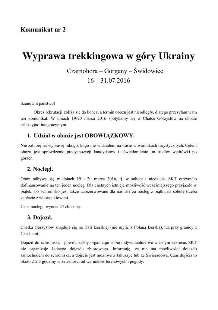 Komunikat nr 2 Wyprawa trekkingowa w góry Ukrainy Czarnohora – Gorgany – Świdowiec 16 – 31.07.2016 Szanowni państwo! Okres rekrutacji zbliża się do końca, a termin obozu jest nieodległy, dlatego przesyłam wam ten komunikat. W dniach 1920 marca 2016 spotykamy się w Chatce Górzystów na obozie selekcyjnointegracyjnym. 1. Udział w obozie jest OBOWIĄZKOWY. Nie zabiorę na wyprawę nikogo, kogo nie widziałem na trasie w warunkach turystycznych. Celem obozu jest sprawdzenie predyspozycji kandydatów i uświadomienie im trudów wędrówki po górach. 2. Noclegi. Obóz odbywa się w dniach 19 i 20 marca 2016, tj. w sobotę i niedzielę. SKT otrzymało dofinansowanie na ten jeden nocleg. Dla chętnych istnieje możliwość wcześniejszego przyjazdu w piątek, bo schronisko jest także zarezerwowane dla nas, ale za nocleg z piątku na sobotę trzeba zapłacić z własnej kieszeni. Cena noclegu wynosi 25 zł/osobę. 3. Dojazd. Chatka Górzystów znajduje się na Hali Izerskiej (nie mylić z Polaną Izerską), tuż przy granicy z Czechami. Dojazd do schroniska i powrót każdy organizuje sobie indywidualnie we własnym zakresie. SKT nie organizuje żadnego dojazdu zbiorowego. Informuję, że nie ma możliwości dojazdu samochodem do schroniska, a dojście jest możliwe z Jakuszyc lub ze Świeradowa. Czas dojścia to około 22,5 godziny w zależności od warunków terenowych i pogody. NIKT NIE POWINIEN IŚĆ SAM, ZWŁASZCZA NOCĄ! Dotyczy to zwłaszcza tych, którzy będą szli do Chatki Górzystów po raz pierwszy, dlatego radzę abyście spróbowali się skontaktować ze sobą poprzez stronę SKT na facebooku. W razie trudności proszę o kontakt telefoniczny, mój telefon to 661356276 . Gdyby ktoś nie znalazł sobie nikogo do towarzystwa na czas dojścia do Chatki, to proszę o wcześniejszą informację spróbujemy go dołączyć do jakiejś grupy. 4. Sprawy organizacyjne. W Chatce warunki są prawdziwie turystyczne, dlatego należy zabrać ze sobą śpiwór, karimatę, odpowiednią odzież i buty turystyczne. W schronisku nie ma elektryczności, należy więc zabrać także latarkę. Istnieje możliwość zakupu wyżywienia w bufecie prowadzonym przez gospodarzy schroniska, polecam zwłaszcza słynne naleśniki z jagodami lub pieczarkami. 5. Plan pobytu. Sobota 19 marca ● ● ● ● dojazd do godz.11.00. 11.00 wyjście na kilkugodzinną wycieczkę w góry pod kierunkiem przewodników. 15.00 – 17.00 – obiad we własnym zakresie (np. w bufecie). 17.00 – zebranie informacyjnoszkoleniowe. Omówimy trasę wyprawy wakacyjnej, ekwipunek, regulamin, finanse. ● 19.00 – kolacja i spotkanie integracyjne, połączone z pieczeniem kiełbasek, degustacją grzańca oraz śpiewem przy kominku, dlatego przewidujemy składkę w wysokości 10 zł na konsumpcję, płatne na miejscu. WAŻNE! Proszę sprawdzić w internecie warunki dojazdu do Jakuszyc lub Świeradowa i spróbować zorganizować się w większe grupy. Nie jest rozsądne indywidualne chodzenie po nieznanych górach, zwłaszcza nocą. Poddaję to pod rozwagę zwłaszcza osobom, które pierwszy raz wybierają się do Chatki Górzystów. Z turystycznym pozdrowieniem Zbigniew Kłos kierownik wyprawy Dane kontaktowe do kierownika wyprawy: • • email: [email protected] tel: 661 356 276