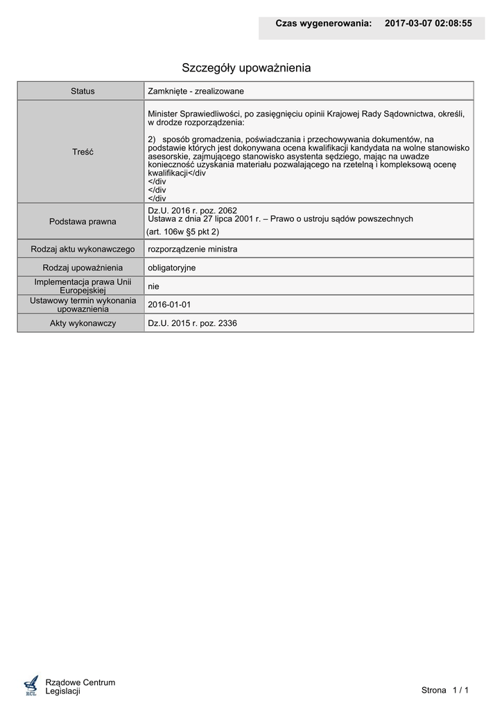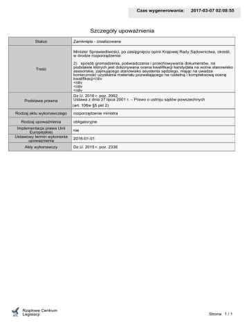 Czas wygenerowania: 2017-03-07 02:08:55 Szczegóły upoważnienia Status Zamknięte - zrealizowane Minister Sprawiedliwości, po zasięgnięciu opinii Krajowej Rady Sądownictwa, określi, w drodze rozporządzenia: Treść Podstawa prawna 2) sposób gromadzenia, poświadczania i przechowywania dokumentów, na podstawie których jest dokonywana ocena kwalifikacji kandydata na wolne stanowisko asesorskie, zajmującego stanowisko asystenta sędziego, mając na uwadze konieczność uzyskania materiału pozwalającego na rzetelną i kompleksową ocenę kwalifikacji</div </div </div </div Dz.U. 2016 r. poz. 2062 Ustawa z dnia 27 lipca 2001 r. – Prawo o ustroju sądów powszechnych (art. 106w §5 pkt 2) Rodzaj aktu wykonawczego Rodzaj upoważnienia Implementacja prawa Unii Europejskiej Ustawowy termin wykonania upowaznienia Akty wykonawczy Rządowe Centrum Legislacji rozporządzenie ministra obligatoryjne nie 2016-01-01 Dz.U. 2015 r. poz. 2336 Strona 1 / 1