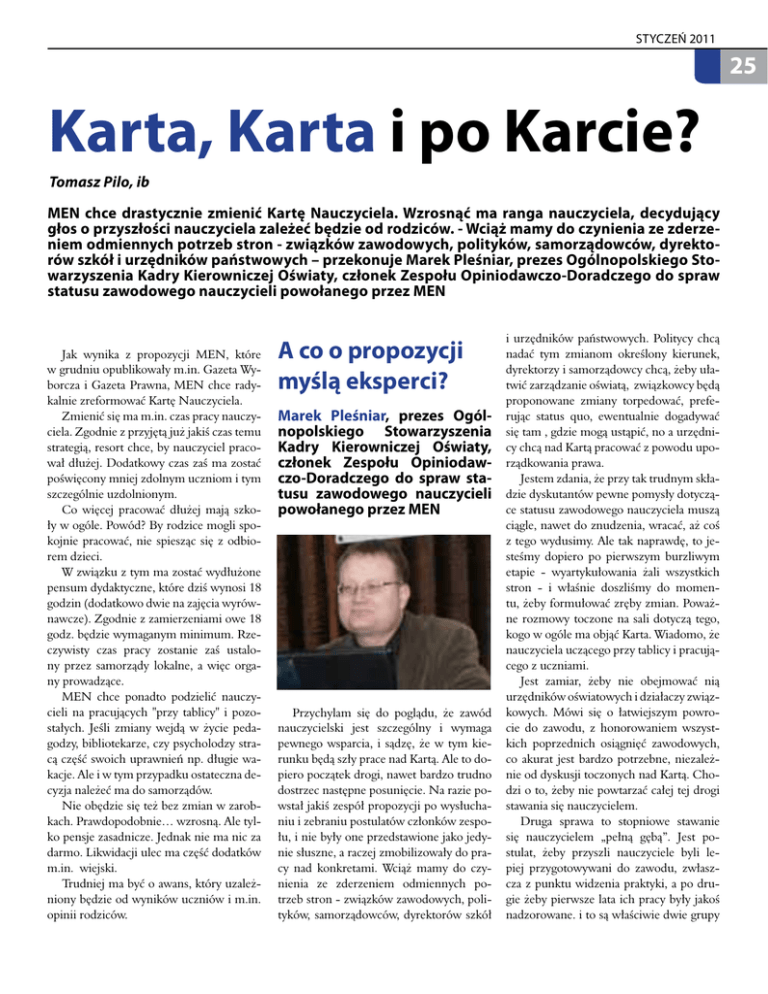 styczeń 2011 25 Karta, Karta i po Karcie? Tomasz Pilo, ib MEN chce drastycznie zmienić Kartę Nauczyciela. Wzrosnąć ma ranga nauczyciela, decydujący głos o przyszłości nauczyciela zależeć będzie od rodziców. - Wciąż mamy do czynienia ze zderzeniem odmiennych potrzeb stron - związków zawodowych, polityków, samorządowców, dyrektorów szkół i urzędników państwowych – przekonuje Marek Pleśniar, prezes Ogólnopolskiego Stowarzyszenia Kadry Kierowniczej Oświaty, członek Zespołu Opiniodawczo-Doradczego do spraw statusu zawodowego nauczycieli powołanego przez MEN Jak wynika z propozycji MEN, które w grudniu opublikowały m.in. Gazeta Wyborcza i Gazeta Prawna, MEN chce radykalnie zreformować Kartę Nauczyciela. Zmienić się ma m.in. czas pracy nauczyciela. Zgodnie z przyjętą już jakiś czas temu strategią, resort chce, by nauczyciel pracował dłużej. Dodatkowy czas zaś ma zostać poświęcony mniej zdolnym uczniom i tym szczególnie uzdolnionym. Co więcej pracować dłużej mają szkoły w ogóle. Powód? By rodzice mogli spokojnie pracować, nie spiesząc się z odbiorem dzieci. W związku z tym ma zostać wydłużone pensum dydaktyczne, które dziś wynosi 18 godzin (dodatkowo dwie na zajęcia wyrównawcze). Zgodnie z zamierzeniami owe 18 godz. będzie wymaganym minimum. Rzeczywisty czas pracy zostanie zaś ustalony przez samorządy lokalne, a więc organy prowadzące. MEN chce ponadto podzielić nauczycieli na pracujących "przy tablicy" i pozostałych. Jeśli zmiany wejdą w życie pedagodzy, bibliotekarze, czy psycholodzy stracą część swoich uprawnień np. długie wakacje. Ale i w tym przypadku ostateczna decyzja należeć ma do samorządów. Nie obędzie się też bez zmian w zarobkach. Prawdopodobnie… wzrosną. Ale tylko pensje zasadnicze. Jednak nie ma nic za darmo. Likwidacji ulec ma część dodatków m.in. wiejski. Trudniej ma być o awans, który uzależniony będzie od wyników uczniów i m.in. opinii rodziców. A co o propozycji myślą eksperci? Marek Pleśniar, prezes Ogólnopolskiego Stowarzyszenia Kadry Kierowniczej Oświaty, członek Zespołu Opiniodawczo-Doradczego do spraw statusu zawodowego nauczycieli powołanego przez MEN Przychylam się do poglądu, że zawód nauczycielski jest szczególny i wymaga pewnego wsparcia, i sądzę, że w tym kierunku będą szły prace nad Kartą. Ale to dopiero początek drogi, nawet bardzo trudno dostrzec następne posunięcie. Na razie powstał jakiś zespół propozycji po wysłuchaniu i zebraniu postulatów członków zespołu, i nie były one przedstawione jako jedynie słuszne, a raczej zmobilizowały do pracy nad konkretami. Wciąż mamy do czynienia ze zderzeniem odmiennych potrzeb stron - związków zawodowych, polityków, samorządowców, dyrektorów szkół i urzędników państwowych. Politycy chcą nadać tym zmianom określony kierunek, dyrektorzy i samorządowcy chcą, żeby ułatwić zarządzanie oświatą, związkowcy będą proponowane zmiany torpedować, preferując status quo, ewentualnie dogadywać się tam , gdzie mogą ustąpić, no a urzędnicy chcą nad Kartą pracować z powodu uporządkowania prawa. Jestem zdania, że przy tak trudnym składzie dyskutantów pewne pomysły dotyczące statusu zawodowego nauczyciela muszą ciągle, nawet do znudzenia, wracać, aż coś z tego wydusimy. Ale tak naprawdę, to jesteśmy dopiero po pierwszym burzliwym etapie - wyartykułowania żali wszystkich stron - i właśnie doszliśmy do momentu, żeby formułować zręby zmian. Poważne rozmowy toczone na sali dotyczą tego, kogo w ogóle ma objąć Karta. Wiadomo, że nauczyciela uczącego przy tablicy i pracującego z uczniami. Jest zamiar, żeby nie obejmować nią urzędników oświatowych i działaczy związkowych. Mówi się o łatwiejszym powrocie do zawodu, z honorowaniem wszystkich poprzednich osiągnięć zawodowych, co akurat jest bardzo potrzebne, niezależnie od dyskusji toczonych nad Kartą. Chodzi o to, żeby nie powtarzać całej tej drogi stawania się nauczycielem. Druga sprawa to stopniowe stawanie się nauczycielem „pełną gębą”. Jest postulat, żeby przyszli nauczyciele byli lepiej przygotowywani do zawodu, zwłaszcza z punktu widzenia praktyki, a po drugie żeby pierwsze lata ich pracy były jakoś nadzorowane. i to są właściwie dwie grupy edufakty 26 propozycji poważnie traktowane przez uczestników zespołu. W tym zespole OSKKO pilnuje konkretnych spraw, ponieważ przyjęło się, że każda strona przynosi tam swoje sprawy, albo te, na których najbardziej się zna, albo dlatego, że najbardziej czegoś potrzebuje. Dla nas ważna jest przede wszystkim sfera związana z awansem zawodowym, zmiana filozofii tego awansu oraz dobór, selekcja do zawodu, wychowanie kadr dobrze przygotowanych do zawodu. Naszym zdaniem bardzo ważne jest, żeby młodzi nauczyciele wchodzili do zawodu w inny sposób, żeby mieli wsparcie i możliwość kształtowania swoich umiejętności. Będziemy także proponować zmiany zapewniające elastyczność zarówno w zatrudnieniu, jak i zwalnianiu nauczycieli. W styczniu 2011 roku zaplanowane jest kolejne spotkanie, na którym zamierzamy przedstawić nasze stanowiska we wszystkich istotnych naszym zdaniem kwestiach. Na początku przyszłego roku powinny być znane propozycje trzech organizacji samorządowych oraz OSKKO. Marek Wein, przez 21 lat dyrektor I LO w Lesznie. Od stycznia samorządowiec. Należę do tych, którzy od lat głośno mówią, że Kartę Nauczyciela należy zmienić. Pracuję od 33 lat w oświacie. Dziwię się, że przez ten czas żaden rząd tego nie zrobił. Osobą decydującą o awansie nauczyciela powinien być tylko i wyłącznie dyrektor szkoły. a tym, którzy powiadają, że dyrektorzy bywają różni, mówię: władza samorządowa jest od tego, żeby słabych dyrektorów eliminować. Przez 21 lat byłem dyrektorem I LO w Lesznie i nie miałem możliwości docenienia naprawdę do- brych nauczycieli 