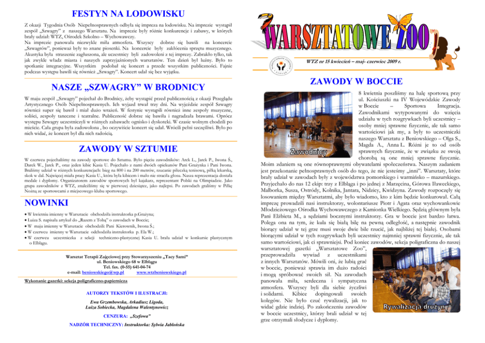 FESTYN NA LODOWISKU Z okazji Tygodnia Osób Niepełnosprawnych odbyła się impreza na lodowisku. Na imprezie wystąpił zespół „Szwagry” z naszego Warsztatu. Na imprezie były różnie konkurencje i zabawy, w których brały udział: WTZ, Ośrodek Szkolno – Wychowawczy. Na imprezie panowała niezwykle miła atmosfera. Wszyscy dobrze się bawili na koncercie „Szwagrów”, ponieważ były to znane piosenki. Na koncercie były zakłócenia sprzętu muzycznego. Akustyka była straszenie zagłuszona, ale uczestnicy byli zadowoleni z tej imprezy. Zabrakło tylko, tak jak zwykle władz miasta i naszych zaprzyjaźnionych warsztatów. Ten dzień był luźny. Było to spotkanie integracyjne. Wszystkim podobał się koncert a przede wszystkim publiczności. Fajnie podczas występu bawili się również „Szwagry”. Koncert udał się bez wyjątku. NASZE „SZWAGRY” W BRODNICY W maju zespół „Szwagry” pojechał do Brodnicy, żeby wystąpić przed publicznością z okazji Przeglądu Artystycznego Osób Niepełnosprawnych. Ich wyjazd trwał trzy dni. Na wyjeździe zespół Szwagry również super się bawił i miał dużo wrażeń. W festynie wystąpili również inne zespoły muzyczne, soliści, zespoły taneczne i teatralne. Publiczność dobrze się bawiła i nagradzała brawami. Oprócz występu Szwagry uczestniczyli w różnych zabawach: ognisko i dyskoteki. W czasie wolnym chodzili po mieście. Cała grupa była zadowolona , bo oczywiście koncert się udał. Wrócili pełni szczęśliwi. Było po nich widać, że koncert był dla nich radością. ZAWODY W SZTUMIE W czerwcu pojechaliśmy na zawody sportowe do Sztumu. Było pięciu zawodników: Arek L., Jarek P., Iwona Ś., Darek W., Jarek P., oraz jeden kibic Kasia U. Pojechało z nami dwóch opiekunów Pani Grażynka i Pani Iwona. Braliśmy udział w różnych konkurencjach: bieg na 800 i na 200 metrów, rzucanie piłeczką tenisową, piłką lekarską, skok w dal. Najwięcej miała pracy Kasia U., która była kibicem i mało nie straciła głosu. Nasza reprezentacja dostała medale i dyplomy. Organizatorem zawodów sportowych był kajakarz, reprezentant Polski na Olimpiadzie. Jako grupa zawodników z WTZ, znaleźliśmy się w pierwszej dziesiątce, jako najlepsi. Po zawodach graliśmy w Piłkę Nożną ze sportowcami z miejscowego klubu sportowego. NOWINKI W kwietniu imienny w Warsztacie obchodziła instruktorka p.Grażyna; Luiza S. napisała artykuł do „Razem z Tobą” o zawodach w Boccie; W maju imienny w Warsztacie obchodzili: Pani Kierownik, Iwona Ś.; W czerwcu imienny w Warsztacie odchodziła instruktorka p. Ela W.; W czerwcu uczestniczka z sekcji techniczno-plastycznej Kasia U. brała udział w konkursie plastycznym o Elblągu. Warsztat Terapii Zajęciowej przy Stowarzyszeniu „Tacy Sami” ul. Beniowskiego 68 w Elblągu Tel. fax. (0-55) 641-04-74 e-mail: [email protected] www.wtzbeniowskiego.pl Wykonanie gazetki: sekcja poligraficzno-papiernicza AUTORZY TEKSTÓW I ILUSTRACJI: Ewa Grzembowska, Arkadiusz Ligoda, Luiza Sobiecka, Magdalena Walentynowicz CENZURA: „Szefowa” NADZÓR TECHNICZNY: Instruktorka: Sylwia Jabłońska WTZ nr 15 kwiecień – maj- czerwiec 2009 r. ZAWODY W BOCCIE 8 kwietnia poszliśmy na halę sportową przy ul. Kościuszki na IV Wojewódzkie Zawody w Boccie – Sportowa Integracja. Zawodnikami wytypowanymi do wzięcia udziału w tych rozgrywkach byli uczestnicy – osoby mniej sprawne fizycznie, ale tak samo wartościowi jak my, a były to uczestniczki naszego Warsztatu z Beniowskiego – Olga S., Magda A., Anna L. Różni je to od osób sprawnych fizycznie, że w związku ze swoją chorobą są one mniej sprawne fizycznie. Moim zdaniem są one równoprawnymi obywatelami społeczeństwa. Naszym zadaniem jest przekonanie pełnosprawnych osób do tego, że nie jesteśmy „inni”. Warsztaty, które brały udział w zawodach były z województwa pomorskiego i warmińsko – mazurskiego. Przyjechało do nas 12 ekip: trzy z Elbląga i po jednej z Marzęcina, Górowa Iławeckiego, Malborka, Susza, Ostródy, Kolnika, Jantara, Nidzicy, Kwidzyna. Zawody rozpoczęły się losowaniem między Warsztatmi, aby było wiadomo, kto z kim będzie konkurował. Całą imprezę prowadzili nasi instruktorzy, wolontariusze Piotr i Agata oraz wychowankowie Młodzieżowego Ośrodka Wychowawczego z Kamionka Wielkiego. Sędzią głównym była Pani Elżbieta M., a sędziami bocznymi instruktorzy. Gra w boccie jest bardzo łatwa. Polega ona na tym, że kula się białą bilę na pewną odległość, a następnie zawodnik biorący udział w tej grze musi swoje dwie bile rzucić, jak najbliżej tej białej. Osobami biorącymi udział w tych rozgrywkach byli uczestnicy najmniej sprawni fizycznie, ale tak samo wartościowi, jak ci sprawniejsi. Pod koniec zawodów, sekcja poligraficzna do naszej warsztatowej gazetki „Warsztatowe Zoo”, przeprowadziła wywiad z uczestnikami z innych Warsztatów. Mówili oni, że lubią grać w boccie, ponieważ sprawia im dużo radości i mogą spróbować swoich sił. Na zawodach panowała miła, serdeczna i sympatyczna atmosfera. Wszyscy byli dla siebie życzliwi i solidarni. Kibice dopingowali swoich kolegów. Nie było czuć rywalizacji, jak to widać gdzie indziej. Po zakończeniu zawodów w boccie uczestnicy, którzy brali udział w tej grze otrzymali słodycze i dyplomy. OLIMPIADA KOMPUTEROWA Dzisiaj od samego rana wielkie poruszenie – dlaczego? Pojechaliśmy do Marzęcina na Olimpiadę Komputerową. Dniem tym był 17 kwiecień 2009 rok. Była to VI z kolei Międzywojewódzka Olimpiada Komputerowa. Województwami biorącymi udział w rozgrywkach były: warmińsko-mazurskie i pomorskie. Miastami uczestniczącymi były: Susz, Malbork, Elbląg, Marzęcino, Jantar i inne. Powitani zostaliśmy serdecznie przez Pana kierownika Warsztatu w Marzęcinie. Życzył nam on dobrej zabawy i zaprosił do losowania, żeby móc się dowiedzieć jakie osoby, z których ekip będą brać udzi
