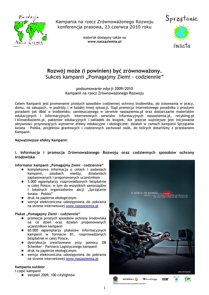 Kampania na rzecz Zrównoważonego Rozwoju konferencja prasowa, 23 czerwca 2010 roku materiał dostępny także na www.naszaziemia.pl Rozwój może (i powinien) być zrównoważony. Sukces kampanii „Pomagajmy Ziemi - codziennie” podsumowanie edycji 2009/2010 Kampanii na rzecz Zrównoważonego Rozwoju Celem Kampanii jest promowanie prostych sposobów codziennej ochrony środowiska, do stosowania w pracy, domu, na zakupach, w podróży i w każdej innej sytuacji. Stąd promocja internetowego poradnika z prostymi poradami jak dbać o środowisko, zamieszczonego w serwisie naszaziemia.pl oraz dostarczanie materiałów edukacyjnych i informacyjnych: internetowych serwisów informacyjnych naszaziemia.pl, recykling.pl i klimatdlaziemi.pl, pakietów edukacyjnych i zakładek do książek. Ale jeszcze ważniejsze jest inicjowanie aktywności przynoszących wymierne efekty edukacyjne i ekologiczne: działań w ramach kampanii Sprzątanie świata – Polska, projektów grantowych i codziennych zachowań osób, do których dotarliśmy z przesłaniem Kampanii. Najważniejsze efekty Kampanii: I. Informacja i promocja Zrównoważonego Rozwoju oraz codziennych sposobów ochrony środowiska Informator kampanii „Pomagajmy Ziemi - codziennie” kompleksowa informacja o celach i zadaniach kampanii, zasobach wiedzy, działaniach zaplanowanych i proponowanych uczestnikom 5.000 egzemplarzy rozprowadzonych bezpłatnie w całej Polsce, w tym do wszystkich samorządów i lokalnych organizatorów akcji „Sprzątanie świata – Polska” druk na papierze ekologicznym wersja elektroniczna udostępniona do pobrania na stronie internetowej www.naszaziemia.pl Plakat „Pomagajmy Ziemi - codziennie” promocja prostych sposobów ochrony środowiska na co dzień oraz działań proponowanych uczestnikom kampanii 60.000 egzemplarzy plakatów informacyjnych kampanii w formacie B1, rozprowadzonych bezpłatnie w całej Polsce, dystrybucja zrealizowana przy pomocy DB Schenker – Partnera Logistycznego kampanii druk na papierze ekologicznym wersja elektroniczna udostępniona do pobrania na stronie internetowej www.naszaziemia.pl Kampania outdoor I część kampanii sierpień 2009, 100 citylightów 1 temat „Stwórzmy dobry klimat, czyli jak dzięki tworzywom sztucznym chronisz klimat i oszczędzasz surowce naturalne nawet o tym nie wiedząc!” realizacja we współpracy i dzięki finansowaniu Fundacji PlasticsEurope Polska oraz dzięki wsparciu Clear Chanel Poland. II część kampanii marzec -czerwiec 2010, 1000 citylightów temat – promocja oszczędzania energii i poszanowania klimatu dwa plakaty przygotowane przez zespół agencji DDB pod kierownictwem dyrektora kreatywnego Dariusza Zatorskiego kreacje z prowokującym pytaniem „A tobie co nie pozawala... wyłączyć trybu stand-by (lub: wymienić żarówki na energooszczędną świetlówkę)?” z intrygującą grafiką, na której tłum ludzi przeszkadza w tych czynnościach grafiki wykorzystane w innych działaniach promocyjnych: kampanii bannerowej i na kartkach elektronicznych realizacja dzięki finansowaniu Narodowego Funduszu Ochrony Środowiska i Gospodarki Wodnej, Vattenfall Poland oraz dzięki wsparciu Clear Chanel Poland i agencji DDB Happeningi i konferencje prasowe cel: promocja prostych codziennych sposobów ochrony środowiska i informacja nt. kampanii przeprowadzono 6 happeningów, promujących (1) korzyści dla środowiska z racjonalnego wykorzystania tworzyw sztucznych, (2) nieśmiecenie i sprzątanie, (3) ochronę klimatu i oszczędność energii, (4) transport przyjaźniejszy środowisku i człowiekowi, (5) sadzenie drzew i krzewów – ochronę bioróżnorodności, (6) zrównoważony rozwój happeningi atrakcyjne dla mediów pod względem formy przekazu i z udziałem gości specjalnych (m.in. Ewelina Flinta) ponad 60 relacji i przekazów z happeningów przeprowadzono 5 konferencji prasowych konferencje relacjonowały kolejne etapy realizacji kampanii informacje-zaproszenia na happeningi i konferencje, materiały dla mediów i relacje z wydarzeń zamieszczone w serwisie kampanii www.naszaziemia.pl Kampania w mediach – telewizja, prasa, radio w celu promocji kampanii oraz informowania o jej przebiegu w mediach zorganizowano 5 konferencji prasowych i 6 happeningów dziennikarze byli systematycznie informowani o planach, Promujemy transport przyjaźniejszy przedsięwzięciach i efektach działań realizowanych w ramach dla środowiska i dla człowieka kampanii wszystkie materiały relacjonujące działania w ramach kampanii zostały zarchiwizowane i udostępniane dziennikarzom Telewizja: kilkadziesiąt relacji telewizyjnych i wiadomości w serwisach informacyjnych z akcji „Sprzątanie świata – Polska” i happeningów 15 wystąpień w programach informacyjnych i publicystycznych na antenach TVP 1, TVP 2, TVP 3, TVN, TVN 24, TVN CNBC Biznes, TVN Warszawa, Polsat, TV Biznes, Polsat News, Superstacja, Telewizja Internetowa EkoNews, przygotowano spot edukacyjny promujący transport przyjaźniejszy środowisku, odpowiedzialne zakupy i segregację odpadów oraz inne proste sposoby ochrony środowiska 150 emisji spotu na antenach ogólnopolskich. Spot dostarczony zostały do nieodpłatnej emisji do Ośrodków Regionalnych TVP i Telewizji Mini-Mini i Telewizji Zigzap, Telewizji Internetowej EkoNews spot udostępniony w internecie na stronie www.naszaziemia.pl produkcja spotu została sfinansowana przez Narodowy Fundusz Ochrony Środowiska i Gospodarki Wodnej Prasa: ponad 150 relacji i informacji o działaniach Fundacji w wydaniach papierowych oraz internetowych dzienników i magazynów przez całą edycję kampanii współpraca miesięczników „Recykling”, „Zielona Liga”, „Czysta Energia” Radio: ponad 60 wypowiedzi, wywiadów, relacji z działań Fundacji w różnych stacjach radiowych 2 W Internecie – zasoby wiedzy, kampania bannerowa i kartka elektroniczna najwygodniejsze medium informacyjne do kompleksowej informacji o celach i z