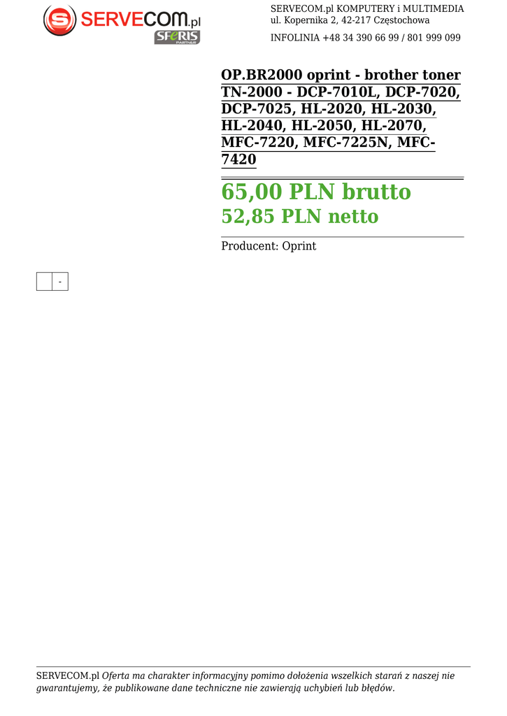 SERVECOM.pl KOMPUTERY i MULTIMEDIA ul. Kopernika 2, 42-217 Częstochowa INFOLINIA +48 34 390 66 99 / 801 999 099 OP.BR2000 oprint - brother toner TN-2000 - DCP-7010L, DCP-7020, DCP-7025, HL-2020, HL-2030, HL-2040, HL-2050, HL-2070, MFC-7220, MFC-7225N, MFC7420 65,00 PLN brutto 52,85 PLN netto Producent: Oprint - SERVECOM.pl Oferta ma charakter informacyjny pomimo dołożenia wszelkich starań z naszej nie gwarantujemy, że publikowane dane techniczne nie zawierają uchybień lub błędów.