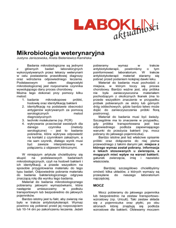 i c ś o n l a u t ak Mikrobiologia weterynaryjna Justyna Janiszewska, Aneta Bieleniewicz-Kamińska Badania mikrobiologiczne są jednymi z głównych badań laboratoryjnych wykorzystywanych przez lekarzy weterynarii w celu postawienia prawidłowej diagnozy oraz wdroŜenia odpowiedniego leczenia. Podstawowym celem diagnostyki mikrobiologicznej jest rozpoznanie czynnika wywołującego dany proces chorobowy. MoŜna tego dokonać przy pomocy kilku metod: 1. badanie mikroskopowe próbki, hodowlę oraz identyfikację bakterii 2. identyfikację na podstawie obecności antygenów wykrywanych za pomocą serologicznych metod diagnostycznych 3. techniki molekularne (np. PCR) 4. wykrywanie przeciwciał swoistych dla danego czynnika (metody serologiczne) – jest to badanie pośrednie, które wykrywa odpowiedź na kontakt z czynnikiem zakaźnym, a nie sam czynnik, dlatego wynik musi być zawsze interpretowany w połączeniu z objawami klinicznymi. W niniejszym artykule chcielibyśmy się skupić na podstawowych badaniach mikrobiologicznych, czyli na hodowli bakterii i ich identyfikacji, a przede wszystkim na sposobie przygotowania materiału do tego typu badań. Odpowiednie pobranie materiału do badania bakteriologicznego odgrywa znaczącą rolę dla wyniku tego badania. Materiał do badania mikrobiologicznego pobieramy jałowymi wymazówkami, które następnie umieszczamy w podłoŜu transportowym lub bezpośrednio do jałowych pojemników. Bardzo istotny jest tu fakt, aby zwierzę nie było w trakcie antybiotykoterapii. Wymaz powinno się pobierać przed jej rozpoczęciem lub 10-14 dni po zakończeniu leczenia. JeŜeli pobieramy wymaz w trakcie antybiotykoterapii, powinniśmy o tym poinformować laboratorium. W trakcie antybiotykoterapii materiał staramy się pobrać przed podaniem kolejnej dawki leku. Materiał do badania musi pochodzić z miejsca, w którym toczy się proces chorobowy. Bardzo waŜne jest, aby próbka nie była zanieczyszczona materiałem pochodzącym z okolicznych tkanek (ma to przede wszystkim znaczenie w przypadku próbek pobieranych ze skóry lub górnych dróg oddechowych, gdzie bardzo łatwo moŜe dojść do zanieczyszczenia próbki florą postronną). Materiał do badania musi być świeŜy. Szczególnie ma to znaczenie w przypadku, gdy próbka transportowana jest bez odpowiedniego podłoŜa zapewniającego warunki do przeŜycia bakterii (np. mocz pobrany do jałowego pojemniczka). Bardzo istotne jest teŜ właściwe opisanie próbki oraz dołączenie do niej pisma przewodniego z takimi danymi jak: miejsce z którego wymaz został pobrany, informacja o lekach stosowanych u zwierzęcia, a mogących mieć wpływ na wzrost bakterii, gatunek zwierzęcia, imię i nazwisko właściciela. Bardziej szczegółowo chcielibyśmy omówić kilka układów, z których wymazy są przesyłane do naszego laboratorium najczęściej. MOCZ Mocz pobieramy do jałowego pojemnika lub bezpośrednio na zestaw transportowowzrostowy (np. Uricult). Taki zestaw składa się z pojemniczka oraz płytki, po obu stronach której znajdują się podłoŜa wzrostowe dla bakterii. Oblewamy moczem oba podłoŜa (moŜemy teŜ podstawić taką płytkę bezpośrednio pod strumień moczu oddawanego przez zwierzę), wkładamy do pojemniczka i zamykamy szczelnie. Bardzo waŜne jest, aby w pojemniczku nie zostawiać moczu. JeŜeli po opłukaniu płytek w pojemniczku jest jeszcze mocz, trzeba jego nadmiar usunąć. Zestaw taki jest bardzo dobrym rozwiązaniem w sytuacji gdy materiał jest dostarczany do laboratorium po dłuŜszym czasie, gdyŜ zbyt długi transport moczu pobranego do zwykłego jałowego pojemnika moŜe dać fałszywe wyniki, wskazujące na bakteriurię (mocz jest bardzo dobra poŜywką, na której bakterie szybko się namnaŜają). Mocz pobrany do pojemnika przechowujemy do momentu transportu w lodówce w temp +4oC. Mocz pobrany na Uricult przechowujemy w temperaturze +37oC, co umoŜliwia wzrost bakterii na podłoŜach. Mocz moŜna pobrać przez nakłucie pęcherza, przez cewnikowanie lub w trakcie swobodnego oddawania moczu przez zwierzę. Pobieranie moczu w trakcie mikcji wiąŜe się z duŜym prawdopodobieństwem jego zanieczyszczenia florą postronną, dlatego w warunkach ambulatoryjnych zalecane jest nakłucie nadłonowe pęcherza moczowego. Najczęściej jednak mocz jest pobierany przez właściciela zwierzęcia w trakcie mikcji. PoniewaŜ u zwierząt trudno jest spełnić zalecenia jakie są wymagane u ludzi przy pobieraniu próbki moczu (mycie okolicy cewki moczowej oraz pobieranie moczu ze środkowego strumienia), materiał moŜe być zanieczyszczony przez bakterie występujące w okolicy cewki moczowej lub w cewce moczowej, dlatego wprowadzono kilka zasad pomagających przy interpretacji wyniku badania bakteriologicznego moczu. U ludzi przyjmuje się, Ŝe zakaŜenie układu moczowego wywołuje zwykle jeden patogen (czasami dwa). Obecność trzech (lub więcej) róŜnych drobnoustrojów w posiewie moczu świadczy o niewłaściwym pobraniu materiału (zanieczyszczeniu próbki). Do stwierdzenia zakaŜenia układu moczowego, liczba bakterii musi przekraczać u kota 10.000 (104) / ml, a u psa 100.000 (105) / ml w przypadku pobrania do badania moczu wolno oddanego przez zwierzę. Przy takich mianach moŜemy mówić juŜ o bakteriurii. W moczu pobranym przez kateter o bakteriurii świadczy obecność bakterii w ilości >105 / ml u psa i >103 / ml u kota, a w moczu pobranym przez nakłucie pęcherza moczowego >103 / ml. Najczęstszym czynnikiem etiologicznym zakaŜenia układu moczowego są bakterie jelitowe. Stwierdzenie w posiewie moczu bakterii chorobotwórczych (tj.: Staphylococcus koagulazododatni, Streptococcus betahemolityczny) oraz droŜdŜaków z rodzaju Candida, niezaleŜnie od ich liczby, wskazuje na zakaŜenie układu moczowego czy moczowo-płciowego. Izolowanie monokultury bakterii w liczbie 104 / ml (lub większej) lub bakterii chorobotwórczych, jest wskazaniem do wykonania antybiogr