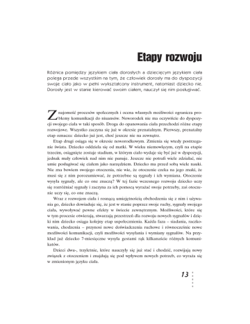 Etapy rozwoju Ró¿nica pomiêdzy jêzykiem cia³a doros³ych a dzieciêcym jêzykiem cia³a polega przede wszystkim na tym, ¿e cz³owiek doros³y ma do dyspozycji swoje cia³o jako w pe³ni wykszta³cony instrument, natomiast dziecko nie. Doros³y jest w stanie kierowaæ swoim cia³em, nauczy³ siê nim pos³ugiwaæ. Z najomość procesów społecznych i ocena własnych moŜliwości ogranicza problemy komunikacji do niuansów. Noworodek nie ma oczywiście do dyspozycji swojego ciała w taki sposób. Droga do opanowania ciała przechodzi róŜne etapy rozwojowe. Wszystko zaczyna się juŜ w okresie prenatalnym. Pierwszy, prenatalny etap oznacza: dziecko juŜ jest, choć jeszcze nie na zewnątrz. Etap drugi osiąga się w okresie noworodkowym. Zmienia się wtedy postrzeganie świata. Dziecko oddziela się od matki. W wieku niemowlęcym, czyli na etapie trzecim, osiągnięte zostaje stadium, w którym ciało wydaje się być juŜ w dyspozycji, jednak mały człowiek nad nim nie panuje. Jeszcze nie potrafi wiele zdziałać, nie umie posługiwać się ciałem jako narzędziem. Dziecko ma przed sobą wiele nauki. Nie zna bowiem swojego otoczenia, nie wie, Ŝe otoczenie czeka na jego znaki, Ŝe musi się z nim porozumiewać, Ŝe potrzebne są sygnały i ich wymiana. Otoczenie wysyła sygnały, ale co one znaczą? W tej fazie wczesnego rozwoju dziecko uczy się rozróŜniać sygnały i zaczyna za ich pomocą wyraŜać swoje potrzeby, zaś otoczenie uczy się, co one znaczą. Wraz z rozwojem ciała i rosnącą umiejętnością obchodzenia się z nim i uŜywania go, dziecko dowiaduje się, Ŝe jest w stanie poprzez swoje ruchy, sygnały swojego ciała, wywoływać pewne efekty w świecie zewnętrznym. MoŜliwości, które się w tym procesie otwierają, stwarzają przestrzeń dla rozwoju nowych sygnałów i dzięki nim dziecko osiąga kolejny etap uspołecznienia. KaŜda faza – siadania, raczkowania, chodzenia – przynosi nowe doświadczenia ruchowe i równocześnie nowe moŜliwości komunikacji, czyli moŜliwości wysyłania i wymiany sygnałów. Na przykład juŜ dziecko 7-miesięczne wysyła gestami rąk kilkanaście róŜnych komunikatów. Dzieci dwu-, trzyletnie, które nauczyły się juŜ stać i chodzić, rozwijają nowy związek z otoczeniem i znajdują się pod wpływem nowych potrzeb, co wyraŜa się w zmienionym języku ciała. 13 Dzieci cztero-, pięcioletnie jeszcze bardziej rozbudowują język ciała, gdyŜ rozwijające się i coraz bogatsze, zmienione związki ze światem zewnętrznym rodzą konieczność uŜywania nowych sygnałów. Kolejna faza obejmuje dzieci w wieku 7–10 lat; wtedy rosną zęby stałe (zastępujące zęby mleczne) i wzmacnia się siła gryzienia. Dzieci są w stanie przegryźć nawet twarde przedmioty, przeŜuć je i przyswoić. Jest interesujące, Ŝe równocześnie z tym rozdrabnianiem, przeŜuwaniem i przyswajaniem pojawia się myślenie analityczne. W tym samym czasie pozycja stojąca uzyskuje nową jakość. Stopa pewnie opiera się na podłoŜu. Stoimy twardo na ziemi, czyli: w rzeczywistości. Wraz z gruntownym przeŜuwaniem i stabilnością stania rozwija się zarówno zdolność do myślenia abstrakcyjnego, jak i poczucie rzeczywistości. W ten sposób pojawiają się nowe moŜliwości i nowe konieczności wyraŜania siebie językiem ciała. Wzmacnia się świadomość społeczna dzieci w wieku 7–10 lat. DuŜą, wcześniej nie tak wyraźną rolę odgrywa hierarchia, pojawia się myślenie ukierunkowane na reguły, a tym samym intensywne przyjmowanie roli społecznej. Świat jest postrzegany bardziej szczegółowo i pojmowany w sposób bardziej zróŜnicowany. W wieku około dziesięciu lat język ciała dzieci – pomijając pewne specyficzne grupy społeczne i wyjątki – upodabnia się do języka ciała dorosłych. Od tej pory moŜna brać pod uwagę normalny język ciała dorosłego i przenosić jego znaczenia z dorosłych na dzieci. Łzy u noworodka są wyrazem emocji i jednocześnie mają naturalną funkcję fizyczną. 14 Pierwszy krzyk po przyjściu na świat. Niemowlęta dobrze reagują na głaskanie. Delikatna dłoń matki i bezpośredni z nią kontakt uspokaja niemowlę i daje mu poczucie, Ŝe jest chronione. 15 Wszystkie opisy i przykłady dotyczą dzieci, których rozwój fizyczny i psychiczny nie jest powaŜnie zaburzony. Nie zajmuję się tutaj ani nadpobudliwością, ani chorobliwą biernością, poniewaŜ te symptomy moŜna oceniać i interpretować jedynie przy pomocy lekarza i uwzględniając konkretny przypadek. Ta ksiąŜka nie będzie zastępować opisu medycznego, ani tym bardziej porady lekarza. Błędem jest przekonanie, Ŝe dzieci głuche dysponują jakimś szczególnie bogatym językiem ciała. Często jest wręcz przeciwnie. PoniewaŜ muszą zaczynać od tego, Ŝe się ich nie rozumie, ich język znaków robi się często pośpieszny w związku z obawą, Ŝe inni się odwrócą i nie będą osiągalni. Dziecko głuche jest całkowicie zaleŜne od bezpośredniego kontaktu wzrokowego. Dla niemowlęcia istotny jest nie Brak mu głosu, za pomocą którego inne dzieci tylko kontakt poprzez dotyk skóry, ale takŜe zapach ojca. Fotografia mogą dotrzeć do matki, gdy ta się odwróci. pokazuje u dziecka archaiczny W tych okolicznościach musi powstać panika. odruch chwytny. Jednak język znaków przyśpieszony przez panikę robi się całkowicie niezrozumiały. Język sygnałów dziecka głuchego w Ŝadnym razie nie jest taki sam jak ten, który rozumiemy pod określeniem język ciała, i dla osób niewtajemniczonych pozostaje językiem obcym. Opisy zawarte w tej ksiąŜce odnoszą się w większości do dzieci zdrowych, zaś jej celem jest lepsza znajomość przeŜyć naszych dzieci, przejawiających się w języku ich ciała. Raz jeszcze zwracam uwagę, Ŝe podane przeze mnie przykłady dotyczą dzieci zdrowych, Ŝyjących w rodzinach, które moŜna określić jako normalne. Zdaję sobie sprawę, Ŝe wiele dzieci musi ro