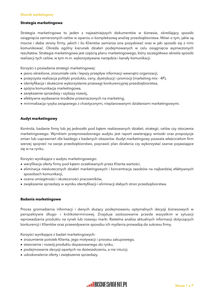 Słownik marketingowy Strategia marketingowa Strategia marketingowa to jeden z najważniejszych dokumentów w biznesie, określający sposób osiągnięcia zamierzonych celów w oparciu o kompleksową analizę przedsiębiorstwa. Mówi o tym, jakie są mocne i słabe strony firmy, jakich i ilu Klientów zamierza ona pozyskiwać oraz w jaki sposób się z nimi komunikować. Określa ogólny kierunek działań podejmowanych w celu osiągnięcia wyznaczonych rezultatów. Strategia marketingowa jest częścią planu marketingowego, który szczegółowo określa sposób realizacji tych celów, w tym m.in. wykorzystywane narzędzia i kanały komunikacji. Korzyści z posiadania strategii marketingowej: • jasno określone, zrozumiałe cele i lepszy przepływ informacji wewnątrz organizacji, • przejrzysta realizacja polityki produktu, ceny, dystrybucji i promocji (marketing mix - 4P), • identyfikacja i skuteczne wykorzystanie przewagi konkurencyjnej przedsiębiorstwa, • spójna komunikacja marketingowa, • zwiększenie sprzedaży i szybszy rozwój, • efektywne wydawanie środków przeznaczonych na marketing, • minimalizacja ryzyka związanego z chaotycznymi, nieplanowanymi działaniami marketingowymi. Audyt marketingowy Kontrola, badanie firmy lub jej jednostki pod kątem realizowanych działań, strategii, celów czy otoczenia marketingowego. Wynikiem przeprowadzonego audytu jest raport zawierający wnioski oraz propozycje zmian lub usprawnień dla każdego z badanych obszarów. Audyt marketingowy pozwala właścicielom firm szerzej spojrzeć na swoje przedsiębiorstwo, poprawić plan działania czy wykorzystać szanse pojawiające się w na rynku. Korzyści wynikające z audytu marketingowego: • weryfikacja oferty firmy pod kątem oczekiwanych przez Klienta wartości, • eliminacja nieskutecznych działań marketingowych i koncentracja zasobów na najbardziej efektywnych sposobach komunikacji, • ocena umiejętności i skuteczności pracowników, • zwiększenie sprzedaży w wyniku identyfikacji i eliminacji słabych stron przedsiębiorstwa. Badania marketingowe Proces gromadzenia informacji i danych służący podejmowaniu optymalnych decyzji biznesowych w perspektywie długo- i krótkoterminowej. Znajduje zastosowanie przede wszystkim w sytuacji wprowadzania produktu na rynek lub rozwoju marki. Rzetelna analiza aktualnych informacji dotyczących konkurencji i Klientów oraz przewidywanie sposobu ich myślenia prowadzą do sukcesu firmy. Korzyści wynikające z badań marketingowych: • zrozumienie potrzeb Klienta, jego motywacji i procesu zakupowego, • stworzenie i rozwój produktu dopasowanego do rynku, • podejmowanie decyzji opartych na doświadczeniu, a nie intuicji, • udoskonalenie oferty i zwiększenie sprzedaży. Strona 1 z 7 Słownik marketingowy Oferta biznesowa Kilkustronicowy dokument, przedstawiający firmę i jej usługi bądź produkty w skondensowanej formie drukowanej lub elektronicznej, najczęściej przy użyciu elementów tekstowych i graficznych. Jest niezbędną częścią składową w procesie nawiązywania wstępnej relacji biznesowej z potencjalnym kontrahentem. Zadaniem tego dokumentu jest przybliżenie przedsiębiorstwa, jego produktów lub usług, doświadczenia, sukcesów czy rekomendacji. Może być wykorzystany w pośrednim lub bezpośrednim kontakcie z partnerem biznesowym. Korzyści: • łatwiejsze i szybsze nawiązanie relacji biznesowej, • oszczędność czasu - szybka weryfikacja zainteresowanych kontrahentów, • transparentność przedsiębiorstwa, • wsparcie procesów sprzedażowych. Multimedialna prezentacja biznesowa Dokument elektroniczny, przedstawiający wybrany aspekt działania przedsiębiorstwa (np. ofertę biznesową) w atrakcyjny sposób, często z wykorzystaniem animacji, filmu, zdjęć czy danych statystycznych. Doskonale sprawdza się podczas spotkań biznesowych i stanowi przydatny element w sprzedaży bezpośredniej. Stworzenie profesjonalnej prezentacji wymaga umiejętności selekcji informacji, posługiwania się językiem korzyści i zdolności graficznych. Korzyści z tworzenia multimedialnych prezentacji biznesowych: • uniwersalność - możliwość zastosowania w wielu różnych sytuacjach, • atrakcyjne wsparcie procesów sprzedażowych i negocjacyjnych, • wpływ na profesjonalny wizerunek marki. Wsparcie działań sprzedażowych Ogół działań mających na celu zwiększenie sprzedaży poprzez angażowanie różnych grup odbiorców partnerów biznesowych, dystrybutorów, pracowników czy Klientów. Działania te obejmują m.in. tworzenie programów lojalnościowych, budowanie efektywnych relacji na poziomie dystrybucji (relacje typu WINWIN), merchandising, praktyki typu sampling (wysyłka próbek), tworzenie programów szkoleniowych czy motywacyjnych dla wykonawców i sprzedawców czy doskonalenie polityki cenowej. Wsparcie działań sprzedażowych może okazać się niezwykle istotne przy wprowadzaniu produktu na rynek lub zwiększaniu skali działalności. Korzyści wynikające ze wsparcia działań sprzedażowych: • zwiększenie motywacji i lojalności różnych grup odbiorców - Klientów, kontrahentów, dystrybutorów, • podnoszenie efektywności działań, • tworzenie świadomości marki, • wzrost sprzedaży. Strona 2 z 7 Słownik marketingowy Promocja i reklama Promocja to element komunikacji marketingowej służący aktywizacji procesu sprzedażowego. Obejmuje działania zwiększające świadomość Klientów na temat firmy, marki, oferty czy idei. Narzędziami wspierającymi promocję są: reklama, promocja sprzedaży, sprzedaż osobista, publicity czy public relations (PR). Reklama to wszelkie formy informowania o przedsiębiorstwie, jego usługach lub produktach, niezależnie od środka przekazu. Korzyści wynikające z promocji i reklamy: • wsparcie procesu sprzedażowego, • wzrost świadomości marki wśród Klientów, • zainteresowanie produktem lub usługą, • wytwor
