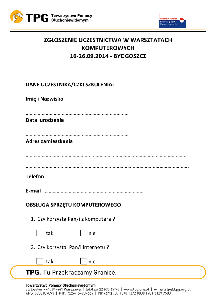 ZGŁOSZENIE UCZESTNICTWA W WARSZTATACH KOMPUTEROWYCH 16-26.09.2014 - BYDGOSZCZ DANE UCZESTNIKA/CZKI SZKOLENIA: Imię i Nazwisko …………………………………………………………………… Data urodzenia …………………………………………………………………… Adres zamieszkania ……………….………………………..…………………………….………………………………… …………………….……………………………………………………………………………………. Telefon ……………………………..………………………………… E-mail ………………………………………………………………… OBSŁUGA SPRZĘTU KOMPUTEROWEGO 1. Czy korzysta Pan/i z komputera ? tak nie 2. Czy korzysta Pan/i Internetu ? tak nie 3. Jak często korzysta Pan/i z komputera i Internetu? kilka razy dziennie raz dziennie raz w tygodniu rzadziej 4. Proszę odpowiedzieć na poniższe pytania dotyczące korzystania z komputera i Internetu: Czy potrafi Pan/i pisać na klawiaturze tak nie Czy potrafi Pan/i zapisać i odnaleźć plik tak nie Czy potrafi Pan/i napisać prosty tekst tak nie Czy potrafi Pan/i wyszukać informację w Internecie tak nie Czy posiada Pan/i własną pocztę elektroniczną tak nie Czy pracuje Pan/i w programie Excel tak nie 5. Z jakich programów korzysta Pan/i najczęściej obsługując komputer i Internet? …………………………………………………………………………………………………………… …………………………………………………………………………………………………………… ………………………………………………………………………………………………………….. 6. Czy brał/a Pan/Pani udział w szkoleniach komputerowych lub czy korzystał/a Pan/Pani z zajęć indywidualnych ? Jeśli tak czego się w ich czasie Pan/i nauczył/a? …………………………………………………………………………………………………………… …………………………………………………………………………………………………………… …………………………………………………………………………………………………………… …………………………………………………………………………………………………………… …………………………………………………………………………………………………………… 7. Dlaczego chce Pan/Pani wziąć udział w szkoleniu? …………………………………………………………………………………………………………… …………………………………………………………………………………………………………… …………………………………………………………………………………………………………… …………………………………………………………………………………………………………… …………………………………………………………………………………………………………… …………………………………………………………………………………………………………… …………………………………………………………………………………………………………… 8. Z jaką wiedzą chciałby/chciałaby pan/Pani wyjechać z warsztatów? …………………………………………………………………………………………………………… …………………………………………………………………………………………………………… …………………………………………………………………………………………………………… …………………………………………………………………………………………………………… …………………………………………………………………………………………………………… DANE DOTYCZĄCE FUNKCJONOWANIA 9. Sposób porozumiewania się z otoczeniem (prosimy podkreślić): a. mowa ustna odbierana drogą słuchową b. mowa odczytywana wzrokowo z ruchu ust c. język migowy odbierany dotykiem d. język migowy odbierany wzrokiem e. pismo brajla f. pismo powiększone g. alfabet Lorma h. łaciński alfabet kreślony do dłoni, i. znaki znane tylko najbliższemu otoczeniu, 10. Schorzenie narządu wzroku, schorzenie obu oczu, jednego oka, pole widzenia? .................................................................................................................. .................................................................................................................. .................................................................................................................. 11. Widzę: a. całkowicie nie widzę b. mam tylko poczucie światła c. tylko plamy i kontury d. obiekty: jeśli się do nich przybliżę jeśli zastosuję dodatkowe oświetlenie przy zastosowaniu pomocy optycznych (lupa, monookular, itp.) bez zastosowania żadnych pomocy, ułatwień 12. Schorzenie słuchu, ubytek jednostronny czy obustronny, ilość decybeli, aparaty słuchowe? .............................................................................................................. .............................................................................................................. .............................................................................................................. 13. Słyszę: a. całkowicie nie słyszę b. słyszę tylko niektóre dźwięki otoczenia w aparatach słuchowych c. słyszę drugą osobę w aparatach słuchowych d. słyszę drugą osobę bez aparatów słuchowych 14. Poruszam 