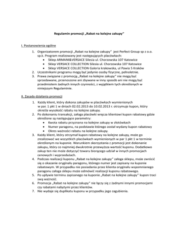 Regulamin promocji „Rabat na kolejne zakupy” I. Postanowienia ogólne 1. Organizatorem promocji „Rabat na kolejne zakupy” jest Perfect Group sp z o.o. sp.k. Program realizowany jest następujących placówkach: Sklep ARMANI&VERSACE Silesia ul. Chorzowska 107 Katowice Sklep VERSACE COLLECTION Silesia ul. Chorzowska 107 Katowice Sklep VERSACE COLLECTION Galeria krakowska, ul Pawia 5 Kraków 2. Uczestnikami programu mogą być jedynie osoby fizyczne, pełnoletnie. 3. Prawa związane z promocją „Rabat na kolejne zakupy” nie mogą być sprzedawane, przenoszone ani zbywane w inny sposób ani nie mogą być przedmiotem żadnych innych czynności, z wyjątkiem tych określonych w niniejszym Regulaminie. II. Zasady działania promocji 1. Każdy klient, który dokona zakupów w placówkach wymienionych w par. 1 pkt 1 w dniach 02.02.2013 do 10.02.2013 r. otrzymuje kupon, który określa wysokość rabatu na kolejne zakupy. 2. Po dokonaniu transakcji, załoga placówki wręcza klientowi kupon rabatowy gdzie określone są następujące parametry: Kwota rabatu przyznana na kolejne zakupy w złotówkach Numer paragonu, na podstawie którego został wydany kupon rabatowy Okres ważności rabatu na kolejne zakupy. 3. Każdy klient, który otrzymał kupon rabatowy na kolejne zakupy, może go zrealizować we wszystkich placówkach wymienionych w par 1 pkt 1 w terminie określonym na kuponie. Warunkiem skorzystania z promocji jest dokonanie zakupu, który co najmniej dwukrotnie przewyższa wartość kuponu. Dodatkowo zakup ten nie może dotyczyć towaru biorącego udział w innych promocjach cenowych i wyprzedażach. 4. Podczas realizacji kuponu „Rabat na kolejne zakupy” załoga sklepu, może zwrócić się o okazanie oryginału paragonu, którego numer jest zapisany na kuponie rabatowym. W przypadku nie posiadania przez klienta oryginału wspomnianego paragonu załoga sklepu może odmówić realizacji kuponu rabatowego. 5. Po upływie terminu zapisanego na kuponie „Rabat na kolejne zakupy” kupon traci swą ważność. 6. Promocja „Rabat na kolejne zakupy” nie łączy się z żadnymi innymi promocjami czy rabatami nabytymi przez klientów. 7. Nie wydaje się duplikatu kuponu w przypadku jego zagubienia. III. Reklamacje 1. Reklamacje związane z Programem lojalnościowym winny być składane na piśmie pod adres siedziby spółki 40-048 Katowice, ul. Kościuszki 24/14 lub mailowo na adres: [email protected] 2. Reklamacje rozpatrywane są w ciągu 14 dni roboczych od daty otrzymania pisma. IV. Postanowienia końcowe 1. Perfect Group sp z o.o. sp.k jest uprawniony do wprowadzania zmian, w formie pisemnej do niniejszego Regulaminu w każdym momencie. 2. W przypadku wprowadzenia zmian do niniejszego Regulaminu, o którym mowa w punkcie 3 , Perfect Group sp z o.o. sp.k. każdorazowo udostępni ujednolicony tekst zmienionego regulaminu Programu w punktach sprzedaży Perfect Group i na stronie internetowej www.perfect-group.pl 3. Regulamin wchodzi w życie z dniem podpisania.