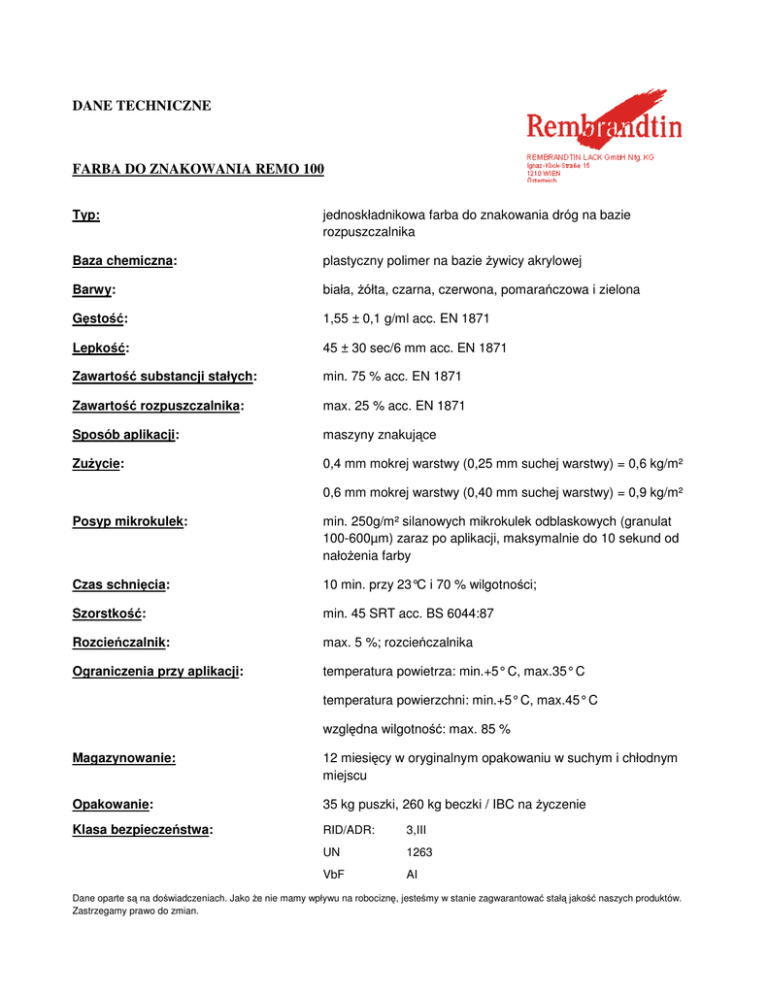 DANE TECHNICZNE FARBA DO ZNAKOWANIA REMO 100 Typ: jednoskładnikowa farba do znakowania dróg na bazie rozpuszczalnika Baza chemiczna: plastyczny polimer na bazie żywicy akrylowej Barwy: biała, żółta, czarna, czerwona, pomarańczowa i zielona Gęstość: 1,55 ± 0,1 g/ml acc. EN 1871 Lepkość: 45 ± 30 sec/6 mm acc. EN 1871 Zawartość substancji stałych: min. 75 % acc. EN 1871 Zawartość rozpuszczalnika: max. 25 % acc. EN 1871 Sposób aplikacji: maszyny znakujące Zużycie: 0,4 mm mokrej warstwy (0,25 mm suchej warstwy) = 0,6 kg/m² 0,6 mm mokrej warstwy (0,40 mm suchej warstwy) = 0,9 kg/m² Posyp mikrokulek: min. 250g/m² silanowych mikrokulek odblaskowych (granulat 100-600µm) zaraz po aplikacji, maksymalnie do 10 sekund od nałożenia farby Czas schnięcia: 10 min. przy 23°C i 70 % wilgotności; Szorstkość: min. 45 SRT acc. BS 6044:87 Rozcieńczalnik: max. 5 %; rozcieńczalnika Ograniczenia przy aplikacji: temperatura powietrza: min.+5° C, max.35° C temperatura powierzchni: min.+5° C, max.45° C względna wilgotność: max. 85 % Magazynowanie: 12 miesięcy w oryginalnym opakowaniu w suchym i chłodnym miejscu Opakowanie: 35 kg puszki, 260 kg beczki / IBC na życzenie Klasa bezpieczeństwa: RID/ADR: 3,III UN 1263 VbF AI Dane oparte są na doświadczeniach. Jako że nie mamy wpływu na robociznę, jesteśmy w stanie zagwarantować stałą jakość naszych produktów. Zastrzegamy prawo do zmian.