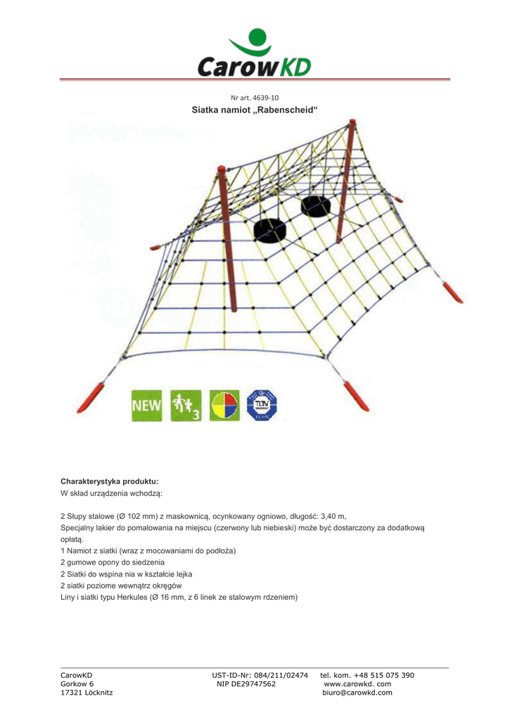 Nr art. 4639-10 Siatka namiot „Rabenscheid“ Charakterystyka produktu: W skład urządzenia wchodzą: 2 Słupy stalowe (Ø 102 mm) z maskownicą, ocynkowany ogniowo, długość: 3,40 m, Specjalny lakier do pomalowania na miejscu (czerwony lub niebieski) może być dostarczony za dodatkową opłatą. 1 Namiot z siatki (wraz z mocowaniami do podłoża) 2 gumowe opony do siedzenia 2 Siatki do wspina nia w kształcie lejka 2 siatki poziome wewnątrz okręgów Liny i siatki typu Herkules (Ø 16 mm, z 6 linek ze stalowym rdzeniem) CarowKD Gorkow 6 17321 Löcknitz UST-ID-Nr: 084/211/02474 NIP DE29747562 tel. kom. +48 515 075 390 www.carowkd. com [email protected] Dane techniczne: Wysokość urządzenia: 2,60 m Wymagana powierzchnia: 8,60 x 5,60 m Strefa bezpieczeństwa: 10,05 x 7,05 m Strefa ochrony przed upadkiem: 54 m2 Maksymalna wysokość upadku: 2,00 m Rodzaj podłoża: piasek, miał, kora drzewna CarowKD Gorkow 6 17321 Löcknitz UST-ID-Nr: 084/211/02474 NIP DE29747562 tel. kom. +48 515 075 390 www.carowkd. com [email protected]