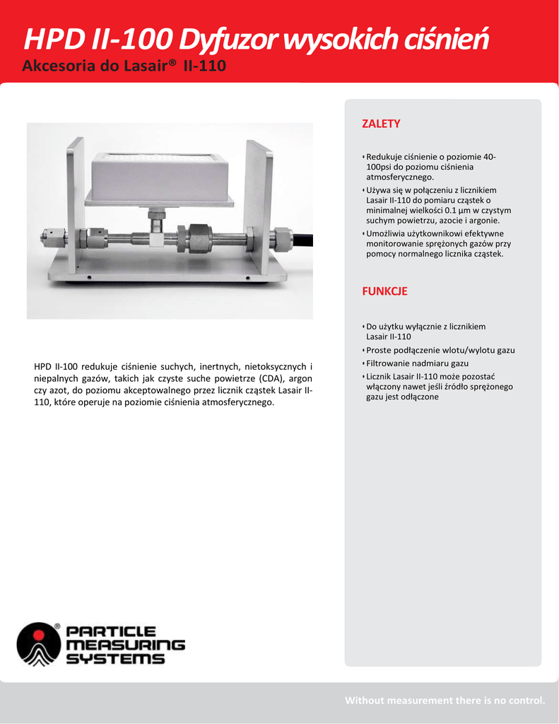 HPD II-100 Dyfuzor wysokich ciśnień Akcesoria do Lasair® II-110 ZALETY • Redukuje ciśnienie o poziomie 40100psi do poziomu ciśnienia atmosferycznego. • Używa się w połączeniu z licznikiem Lasair II-110 do pomiaru cząstek o minimalnej wielkości 0.1 µm w czystym suchym powietrzu, azocie i argonie. • Umożliwia użytkownikowi efektywne monitorowanie sprężonych gazów przy pomocy normalnego licznika cząstek. FUNKCJE HPD II-100 redukuje ciśnienie suchych, inertnych, nietoksycznych i niepalnych gazów, takich jak czyste suche powietrze (CDA), argon czy azot, do poziomu akceptowalnego przez licznik cząstek Lasair II110, które operuje na poziomie ciśnienia atmosferycznego. • Do użytku wyłącznie z licznikiem Lasair II-110 • Proste podłączenie wlotu/wylotu gazu • Filtrowanie nadmiaru gazu • Licznik Lasair II-110 może pozostać włączony nawet jeśli źródło sprężonego gazu jest odłączone Without measurement there is no control. HPD II-100 Dyfuzor wysokich ciśnień Akcesoria do Lasair® II-110 SPECYFIKACJA Zakres wielkości cząstek 0.1 µm – 1.0 µm Dopuszczalne gazy Suchy, inertny, nietoksyczny, niepalny (CDA, azot, argon) Ciśnienie gazu 40 – 100 psi Prędkość przepływu gazu 28.3 l/min Temperatura gazu 10 – 32 °C Wlot VCR-type, #4, 316-SS Wylot 3/8” ID z O-ringiem Wymiary 13 x 25 x 14 cm Waga 2.6 kg Lasair® is a registered trademark of Particle Measuring Systems, Inc. All other trademarks are the property of their respective owners. AUTHORIZED REPRESENTATIVE Przedstawiciel: UNI-EXPORT INSTRUMENTS POLSKA ul. Mickiewicza 48, 05-220 Zielonka © 2011 Particle Measuring Systems, Inc. All rights reserved. tel/fax (0-22) 771-86-01 e-mail: [email protected], www.uni-export.pl