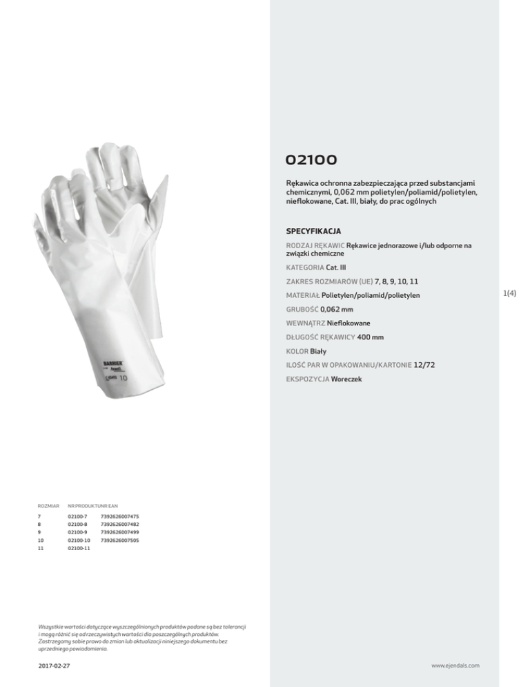 02100 Rękawica ochronna zabezpieczająca przed substancjami chemicznymi, 0,062 mm polietylen/poliamid/polietylen, nieflokowane, Cat. III, biały, do prac ogólnych SPECYFIKACJA RODZAJ RĘKAWIC Rękawice jednorazowe i/lub odporne na związki chemiczne KATEGORIA Cat. III ZAKRES ROZMIARÓW (UE) 7, 8, 9, 10, 11 1(4) MATERIAŁ Polietylen/poliamid/polietylen GRUBOŚĆ 0,062 mm WEWNĄTRZ Nieflokowane DŁUGOŚĆ RĘKAWICY 400 mm KOLOR Biały ILOŚĆ PAR W OPAKOWANIU/KARTONIE 12/72 EKSPOZYCJA Woreczek ROZMIAR NR PRODUKTUNR EAN 7 02100-7 7392626007475 8 02100-8 7392626007482 9 02100-9 7392626007499 10 02100-10 7392626007505 11 02100-11 Wszystkie wartości dotyczące wyszczególnionych produktów podane są bez tolerancji i mogą różnić się od rzeczywistych wartości dla poszczególnych produktów. Zastrzegamy sobie prawo do zmian lub aktualizacji niniejszego dokumentu bez uprzedniego powiadomienia. 2017-02-27 www.ejendals.com 02100 CECHY Ochrona przed substancjami chemicznymi PODSTAWOWA OCHRONA Zapobiega ryzyku:, ryzyko infekcji, kontakt z substancjami chemicznymi PODSTAWOWE ŚRODOWISKA UŻYTKOWANIA Środowiska z zagrożeniem chemicznym, środowiska z zagrożeniem mikrobiologicznym, środowiska niebezpieczne dla zdrowia, środowiska surowe PODSTAWOWE OBSZARY UŻYTKOWANIA Prace w przemyśle chemicznym, prace z zakresu technologii chemicznej, prace laboratoryjne PODSTAWOWE BRANŻE PRZEMYSŁOWE Chemical RODZAJE PRAC Średnie Cat. III EN 388:2003 1010 EN 374-2 EN 374-3 ABC ejendals ab Wszystkie wartości dotyczące wyszczególnionych produktów podane są bez tolerancji i mogą różnić się od rzeczywistych wartości dla poszczególnych produktów. Zastrzegamy sobie prawo do zmian lub aktualizacji niniejszego dokumentu bez uprzedniego powiadomienia. 2017-02-27 Box 7, SE-793 21 Leksand, Sweden Phone +46 (0) 247 360 00 Fax +46 (0) 247 360 10 [email protected] [email protected] www.ejendals.com 2(4) 02100 OPIS ZGODNOŚCI EN 420:2003 Rękawice ochronne - wymagania ogólne i metody badań Dyrektywa Rady 89/686/EWG (Dyrektywa PPE) EN 388:2003 Rękawice chroniące przed czynnikami mechanicznymi Osiągnięty poziom (Maksymalna skuteczność) A) Odporność na ścieranie (w cyklach) 1 (4) B) Odporność na przecięcie (współczynnik) 0 (5) C) Odporność na rozdarcie (w niutonach) 1 (4) D) Odporność na przekłucie (w niutonach) 0 (4) Właściwości 3(4) EN 388 – Testowanie (norma określa wymagania dotyczące poszczególnych poziomów bezpieczeństwa). Poziom ochrony Cat. III EN 388:2003 1010 EN 374-2 EN 374-3 ABC 1 2 3 4 A) Odporność na ścieranie (w cyklach) 100 500 2 000 8 000 B) Odporność na przecięcie (współczynnik) 1,2 2,5 5,0 10,0 C) Odporność na rozdarcie (w niutonach) 10 25 50 75 D) Odporność na przekłucie (w niutonach) 20 60 100 150 5 20,0 EN 374-3:2003 Rękawice chroniące przed substancjami chemicznymi i mikroorganizmami – Część 3: Wyznaczanie odporności na przenikanie substancji chemicznych ejendals ab Wszystkie wartości dotyczące wyszczególnionych produktów podane są bez tolerancji i mogą różnić się od rzeczywistych wartości dla poszczególnych produktów. Zastrzegamy sobie prawo do zmian lub aktualizacji niniejszego dokumentu bez uprzedniego powiadomienia. 2017-02-27 Box 7, SE-793 21 Leksand, Sweden Phone +46 (0) 247 360 00 Fax +46 (0) 247 360 10 [email protected] [email protected] www.ejendals.com 02100 Poziomy przenikania opierają się na czasie przebicia, jak poniżej Poziom przenikania 1 2 3 4 5 6 Minimalny czas przenikania (min) 10 30 60 120 240 480 Definicja czasu przenikania przez dłoń rękawicy (1 ugm/cm²/min) 4(4) Cat. III EN 388:2003 1010 EN 374-2 EN 374-3 ABC ejendals ab Wszystkie wartości dotyczące wyszczególnionych produktów podane są bez tolerancji i mogą różnić się od rzeczywistych wartości dla poszczególnych produktów. Zastrzegamy sobie prawo do zmian lub aktualizacji niniejszego dokumentu bez uprzedniego powiadomienia. 2017-02-27 Box 7, SE-793 21 Leksand, Sweden Phone +46 (0) 247 360 00 Fax +46 (0) 247 360 10 [email protected] [email protected] www.ejendals.com