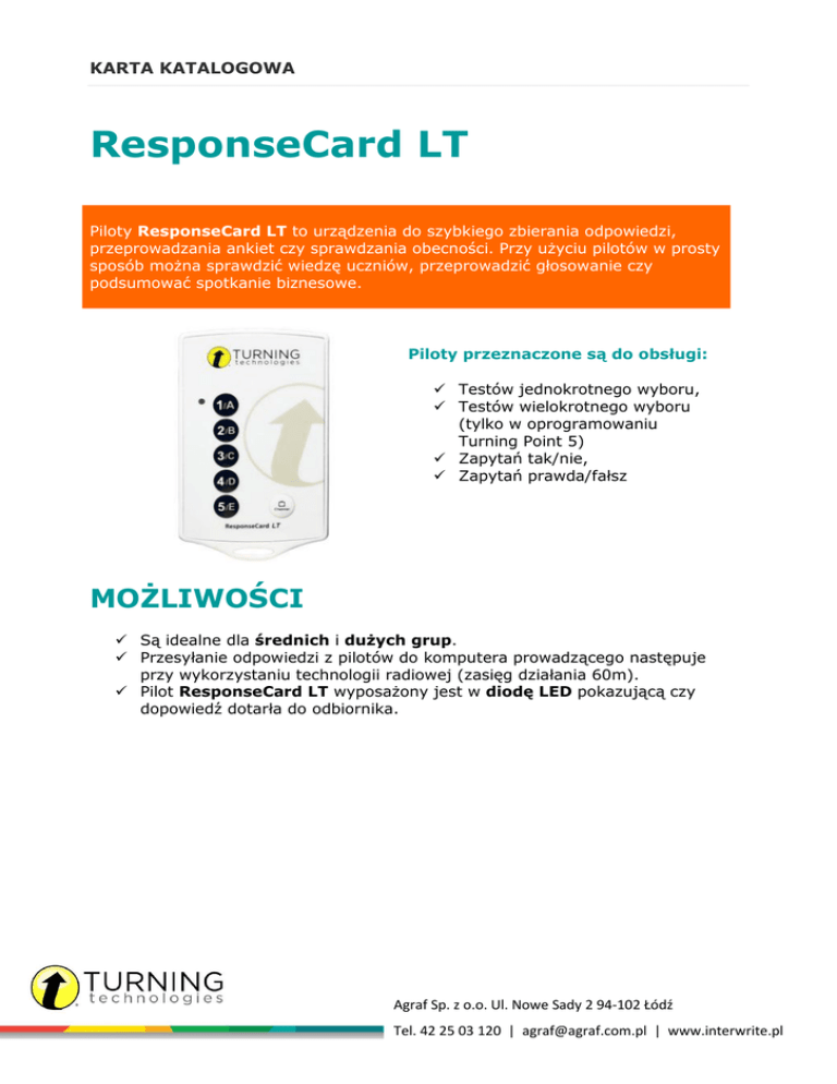 KARTA KATALOGOWA ResponseCard LT Piloty ResponseCard LT to urządzenia do szybkiego zbierania odpowiedzi, przeprowadzania ankiet czy sprawdzania obecności. Przy użyciu pilotów w prosty sposób można sprawdzić wiedzę uczniów, przeprowadzić głosowanie czy podsumować spotkanie biznesowe. Piloty przeznaczone są do obsługi: Testów jednokrotnego wyboru, Testów wielokrotnego wyboru (tylko w oprogramowaniu Turning Point 5) Zapytań tak/nie, Zapytań prawda/fałsz MOŻLIWOŚCI Są idealne dla średnich i dużych grup. Przesyłanie odpowiedzi z pilotów do komputera prowadzącego następuje przy wykorzystaniu technologii radiowej (zasięg działania 60m). Pilot ResponseCard LT wyposażony jest w diodę LED pokazującą czy dopowiedź dotarła do odbiornika. Agraf Sp. z o.o. Ul. Nowe Sady 2 94-102 Łódź Tel. 42 25 03 120 | [email protected] | www.interwrite.pl KARTA KATALOGOWA SPECYFIKACJA TECHNICZNA Wysokość: 74 mm Szerokość: 45 mm Grubość: 7 mm Waga: 19.8 grama 6 przycisków (1/A-5/E, Channel) Odpowiedzi przesyłane automatycznie Dioda LED - sygnalizująca odebranie odpowiedzi przez system 1 bateria CR2032 (3.0V) litowa Tryb uśpienia kiedy pilot jest nie używany Średnia żywotność baterii od 1 roku do 2 latach Wymiary i waga Przyciski Wyświetlacz Bateria i zasilanie Komunikacja Radio - zasięg działania 60 metrów System pozwala na uruchomienie 25 różnych sesji w bliskim sąsiedztwie bez zakłóceń. Nie zakłóca pracy innych urządzeń Pilot i odbiornik nie muszą znajdować się w polu wzajemnego widzenia. Certyfikaty CE, FCC, Industry Canada Certified Oprogramowanie Flow, TurningPoint Agraf Sp. z o.o. Ul. Nowe Sady 2 94-102 Łódź Tel. 42 25 03 120 | [email protected] | www.interwrite.pl