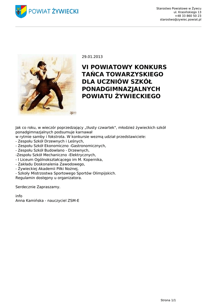Starostwo Powiatowe w Żywcu ul. Krasińskiego 13 +48 33 860 50 23 [email protected] 29.01.2013 VI POWIATOWY KONKURS TAŃCA TOWARZYSKIEGO DLA UCZNIÓW SZKÓŁ PONADGIMNAZJALNYCH POWIATU ŻYWIECKIEGO Jak co roku, w wieczór poprzedzający „tłusty czwartek", młodzież żywieckich szkół ponadgimnazjalnych podsumuje karnawał w rytmie samby i fokstrota. W konkursie wezmą udział przedstawiciele: - Zespołu Szkół Drzewnych i Leśnych, - Zespołu Szkół Ekonomiczno -Gastronomicznych, - Zespołu Szkół Budowlano - Drzewnych, -Zespołu Szkół Mechaniczno -Elektrycznych, - I Liceum Ogólnokształcącego im M. Kopernika, - Zakładu Doskonalenia Zawodowego, - Żywieckiej Akademii Piłki Nożnej, - Szkoły Mistrzostwa Sportowego Sportów Olimpijskich. Regulamin dostępny u organizatora. Serdecznie Zapraszamy. info Anna Kamińska - nauczyciel ZSM-E Strona 1/1 Powered by TCPDF (www.tcpdf.org)
