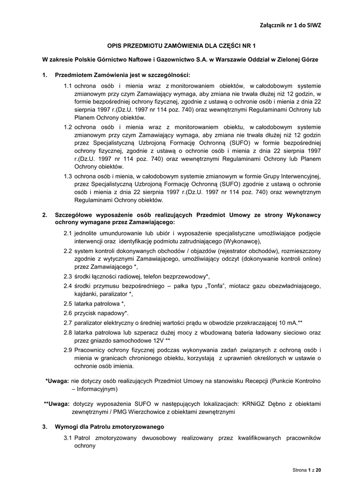 Załącznik nr 1 do SIWZ OPIS PRZEDMIOTU ZAMÓWIENIA DLA CZĘŚCI NR 1 W zakresie Polskie Górnictwo Naftowe i Gazownictwo S.A. w Warszawie Oddział w Zielonej Górze 1. Przedmiotem Zamówienia jest w szczególności: 1.1 ochrona osób i mienia wraz z monitorowaniem obiektów, w całodobowym systemie zmianowym przy czym Zamawiający wymaga, aby zmiana nie trwała dłużej niż 12 godzin, w formie bezpośredniej ochrony fizycznej, zgodnie z ustawą o ochronie osób i mienia z dnia 22 sierpnia 1997 r.(Dz.U. 1997 nr 114 poz. 740) oraz wewnętrznymi Regulaminami Ochrony lub Planem Ochrony obiektów. 1.2 ochrona osób i mienia wraz z monitorowaniem obiektu, w całodobowym systemie zmianowym przy czym Zamawiający wymaga, aby zmiana nie trwała dłużej niż 12 godzin przez Specjalistyczną Uzbrojoną Formację Ochronną (SUFO) w formie bezpośredniej ochrony fizycznej, zgodnie z ustawą o ochronie osób i mienia z dnia 22 sierpnia 1997 r.(Dz.U. 1997 nr 114 poz. 740) oraz wewnętrznymi Regulaminami Ochrony lub Planem Ochrony obiektów. 1.3 ochrona osób i mienia, w całodobowym systemie zmianowym w formie Grupy Interwencyjnej, przez Specjalistyczną Uzbrojoną Formację Ochronną (SUFO) zgodnie z ustawą o ochronie osób i mienia z dnia 22 sierpnia 1997 r.(Dz.U. 1997 nr 114 poz. 740) oraz wewnętrznym Regulaminami Ochrony obiektów. 2. Szczegółowe wyposażenie osób realizujących Przedmiot Umowy ze strony Wykonawcy ochrony wymagane przez Zamawiającego: 2.1 jednolite umundurowanie lub ubiór i wyposażenie specjalistyczne umożliwiające podjęcie interwencji oraz identyfikację podmiotu zatrudniającego (Wykonawcę), 2.2 system kontroli dokonywanych obchodów / objazdów (rejestrator obchodów), rozmieszczony zgodnie z wytycznymi Zamawiającego, umożliwiający odczyt (dokonywanie kontroli online) przez Zamawiającego *, 2.3 środki łączności radiowej, telefon bezprzewodowy*, 2.4 środki przymusu bezpośredniego – pałka typu „Tonfa”, miotacz gazu obezwładniającego, kajdanki, paralizator *, 2.5 latarka patrolowa *, 2.6 przycisk napadowy*. 2.7 paralizator elektryczny o średniej wartości prądu w obwodzie przekraczającej 10 mA.** 2.8 latarka patrolowa lub szperacz dużej mocy z wbudowaną bateria ładowany sieciowo oraz przez gniazdo samochodowe 12V ** 2.9 Pracownicy ochrony fizycznej podczas wykonywania zadań związanych z ochroną osób i mienia w granicach chronionego obiektu, korzystają z uprawnień określonych w ustawie o ochronie osób imienia. *Uwaga: nie dotyczy osób realizujących Przedmiot Umowy na stanowisku Recepcji (Punkcie Kontrolno – Informacyjnym) **Uwaga: dotyczy wyposażenia SUFO w następujących lokalizacjach: KRNiGZ Dębno z obiektami zewnętrznymi / PMG Wierzchowice z obiektami zewnętrznymi 3. Wymogi dla Patrolu zmotoryzowanego 3.1 Patrol zmotoryzowany dwuosobowy realizowany przez kwalifikowanych pracowników ochrony Strona 1 z 20 Załącznik nr 1 do SIWZ 3.2 W ramach Patrolu zmotoryzowanego Wykonawca będzie dysponował na każdym obiekcie objętym ochroną w formie Patrolu zmotoryzowanego oznakowanymi autami z napędem 4x4 wyposażonym w szperacz obrotowy 50-80 W (każdy pojazd), łańcuchy śniegowe (każdy pojazd). W przypadku awarii, serwisu pojazdu Wykonawca zapewni pojazd o tych samych parametrach. Patrol zmotoryzowany będzie dysponował radiostacją oraz telefonem komórkowym. Liczba aut przypisanych do obiektu w ramach Patrolu zmotoryzowanego 4. KRNiGZ Dębno z obiektami zewnętrznymi PMG Wierzchowice z obiektami zewnętrznymi 2 1 Wymogi dla Grupy Interwencyjnej 4.1 Grupa Interwencyjna (GI) – co najmniej dwóch kwalifikowanych, uzbrojonych pracowników ochrony fizycznej, którzy po uzyskaniu informacji (lub na wezwanie) lub sygnału z urządzeń lub systemów alarmowych, sygnalizujących zagrożenie chronionych osób lub mienia w formie bezpośredniej ochrony fizycznej podejmują działania na terenie chronionego obszaru, obiekt. 4.2 Grupy Interwencyjne będą wykorzystywały oznakowane pojazdy Wykonawcy. 4.3 Członkowie Grupy Interwencyjnych będą posiadać: a) jednolite umundurowanie i wyposażenie specjalistyczne, b) łączność radiową i komórkową (radiotelefon, tel. komórkowy), c) środki przymusu bezpośredniego, 4.4 Grupa Interwencyjna powinna być przygotowana do stosowania przymusu bezpośredniego z zachowaniem odpowiednich przepisów prawa (udokumentowane szkolenie w zakresie działalności grupy interwencyjnej) oraz podejmować działania adekwatne do zaistniałego zdarzenia zgodnie z procedurami wewnętrznymi obowiązującymi SUFO. 4.5 Wykonawca gwarantuje, że wyposażenie oraz skład Grup Interwencyjnych będą odpowiadać wymogom zapisanym w Rozporządzeniu Ministra Spraw Wewnętrznych i Administracji z dnia 21 października 2011roku. 4.6 Wykonawca gwarantuje, że Grupy Interwencyjne będą składać się z pracowników ochrony spełniających w szczególności poniższe wymagania: a) Kwalifikowany pracownik ochrony; b) Niekarany, c) Posiadający doświadczenie w pracy w ochronie 5. Procedura działania grupy interwencyjnej: 5.1 W następstwie otrzymania sygnału alarmowego z obiektu lub powiadomienia o napadzie, włamaniu, innym przestępstwie lub ich usiłowaniu, a także poważnym zakłóceniu porządku na terenie ochranianego obiektu, Pracownik ochrony lub pracownik PGNiG/ Pracownik ochrony monitorujący system alarmowy niezwłocznie wzywa Grupę Interwencyjną na miejsce zdarzenia. 5.2 Grupa Interwencyjna podjeżdża do obiektu w sposób nierzucający się w oczy. 5.3 Dojazd na miejsce zdarzenia Grupy Interwencyjnej wyposażonej w broń zgodną z ustawą z dnia 22 sierpnia 1997 r. o Ochronie Osób i Mienia (Dz. U. 1997 nr 114 poz. 740) oraz ewentualnymi zmianami i nowelizacjami, w składzie zapewniającym właściwe wzmocnienie ochranianego terenu w czasie: w terenie administracyjnym miasta maks. do 15 minut, poza terenem miasta maks. do 20 minut Strona 2 z 20 Załącznik nr 1 do SIWZ 5.4 Dowódca Grupy Interwen