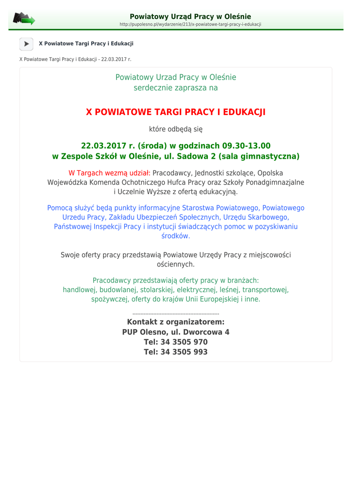 Powiatowy Urząd Pracy w Oleśnie http://pupolesno.pl/wydarzenie/213/x-powiatowe-targi-pracy-i-edukacji X Powiatowe Targi Pracy i Edukacji X Powiatowe Targi Pracy i Edukacji - 22.03.2017 r. Powiatowy Urzad Pracy w Oleśnie serdecznie zaprasza na X POWIATOWE TARGI PRACY I EDUKACJI które odbędą się 22.03.2017 r. (środa) w godzinach 09.30-13.00 w Zespole Szkół w Oleśnie, ul. Sadowa 2 (sala gimnastyczna) W Targach wezmą udział: Pracodawcy, Jednostki szkolące, Opolska Wojewódzka Komenda Ochotniczego Hufca Pracy oraz Szkoły Ponadgimnazjalne i Uczelnie Wyższe z ofertą edukacyjną. Pomocą służyć będą punkty informacyjne Starostwa Powiatowego, Powiatowego Urzedu Pracy, Zakładu Ubezpieczeń Społecznych, Urzędu Skarbowego, Państwowej Inspekcji Pracy i instytucji świadczących pomoc w pozyskiwaniu środków. Swoje oferty pracy przedstawią Powiatowe Urzędy Pracy z miejscowości ościennych. Pracodawcy przedstawiają oferty pracy w branżach: handlowej, budowlanej, stolarskiej, elektrycznej, leśnej, transportowej, spożywczej, oferty do krajów Unii Europejskiej i inne. ------------------------------------------------------ Kontakt z organizatorem: PUP Olesno, ul. Dworcowa 4 Tel: 34 3505 970 Tel: 34 3505 993