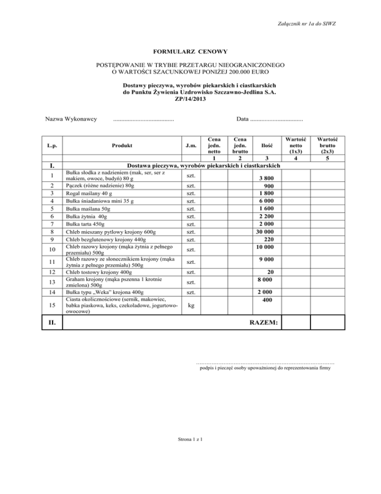 Załącznik nr 1a do SIWZ FORMULARZ CENOWY POSTĘPOWANIE W TRYBIE PRZETARGU NIEOGRANICZONEGO O WARTOŚCI SZACUNKOWEJ PONIŻEJ 200.000 EURO Dostawy pieczywa, wyrobów piekarskich i ciastkarskich do Punktu Żywienia Uzdrowisko Szczawno-Jedlina S.A. ZP/14/2013 Nazwa Wykonawcy L.p. I. 1 2 3 4 5 6 7 8 9 10 11 12 13 14 15 ...................................... Produkt Data ................................. J.m. Cena jedn. netto Cena jedn. brutto Ilość 1 2 3 Dostawa pieczywa, wyrobów piekarskich i ciastkarskich Bułka słodka z nadzieniem (mak, ser, ser z makiem, owoce, budyń) 80 g Pączek (różne nadzienie) 80g Rogal maślany 40 g Bułka śniadaniowa mini 35 g Bułka maślana 50g Bułka żytnia 40g Bułka tarta 450g Chleb mieszany pytlowy krojony 600g Chleb bezglutenowy krojony 440g Chleb razowy krojony (mąka żytnia z pełnego przemiału) 500g Chleb razowy ze słonecznikiem krojony (mąka żytnia z pełnego przemiału) 500g Chleb tostowy krojony 400g Graham krojony (mąka pszenna 1 krotnie zmielona) 500g Bułka typu „Weka” krojona 400g Ciasta okolicznościowe (sernik, makowiec, babka piaskowa, keks, czekoladowe, jogurtowoowocowe) szt. szt. 3 800 900 1 800 6 000 1 600 2 200 2 000 30 000 220 10 000 szt. 9 000 szt. 20 8 000 szt. szt. szt. szt. szt. szt. szt. szt. szt. Wartość netto (1x3) Wartość brutto (2x3) 4 5 2 000 400 szt. kg II. RAZEM: ……………………………………………………………………… podpis i pieczęć osoby upoważnionej do reprezentowania firmy Strona 1 z 1