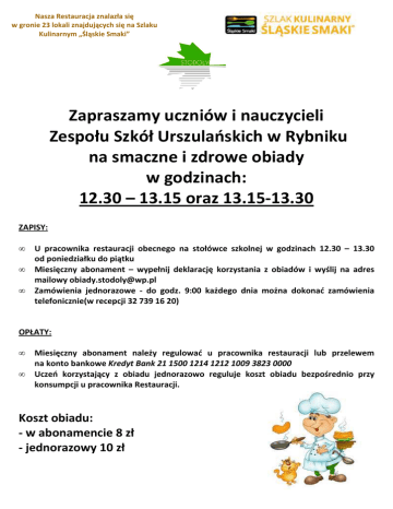 Nasza Restauracja znalazła się w gronie 23 lokali znajdujących się na Szlaku Kulinarnym „Śląskie Smaki” Zapraszamy uczniów i nauczycieli Zespołu Szkół Urszulańskich w Rybniku na smaczne i zdrowe obiady w godzinach: 12.30 – 13.15 oraz 13.15-13.30 ZAPISY: • • • U pracownika restauracji obecnego na stołówce szkolnej w godzinach 12.30 – 13.30 od poniedziałku do piątku Miesięczny abonament – wypełnij deklarację korzystania z obiadów i wyślij na adres mailowy [email protected] Zamówienia jednorazowe - do godz. 9:00 każdego dnia można dokonać zamówienia telefonicznie(w recepcji 32 739 16 20) OPŁATY: • • Miesięczny abonament należy regulować u pracownika restauracji lub przelewem na konto bankowe Kredyt Bank 21 1500 1214 1212 1009 3823 0000 Uczeń korzystający z obiadu jednorazowo reguluje koszt obiadu bezpośrednio przy konsumpcji u pracownika Restauracji. Koszt obiadu: - w abonamencie 8 zł - jednorazowy 10 zł