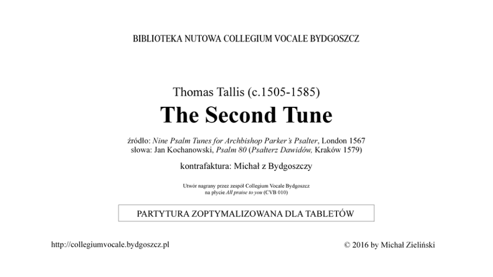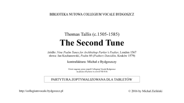 BIBLIOTEKA NUTOWA COLLEGIUM VOCALE BYDGOSZCZ Thomas Tallis (c.1505-1585) The Second Tune źródło: Nine Psalm Tunes for Archbishop Parker’s Psalter, London 1567 słowa: Jan Kochanowski, Psalm 80 (Psałterz Dawidów, Kraków 1579) kontrafaktura: Michał z Bydgoszczy Utwór nagrany przez zespół Collegium Vocale Bydgoszcz na płycie All praise to you (CVB 010) PARTYTURA ZOPTYMALIZOWANA DLA TABLETÓW http://collegiumvocale.bydgoszcz.pl © 2016 by Michał Zieliński b & b ˙˙ œ œ 1. Słysz, 2. Chciej 3. Są 4. A ? bb ˙ b œ &b œ 5 œœ œ œ Pa po sie my œ œ nœ œœ œœ œœ œ œ œœ œœ . œ œ œœ J œ œ œœ œ. œ. œ œœ œœ œ œ œ œ œ œ œ i - zra - el - ski, nasz głos ste - rzu ru - szyć si - ły swo - jej i swej dzi o łu - py na - sze zwa - dy ni - gdy z Two - jej świę -j tej dro - gi ry ja - ko przy - bądź nam nie - przy - ja nas bę - dziesz ? b œœ b œœ œœ sta u ciel ży œ œ œœ - œœ œ œ Jœ œœ œœ do wo - dzisz tra - pio - nym skie śmie - chy wił, a my œ œ œ œ œ œ na ry ża wzy œ œ - ród swój chło ku lu nam wać Cię œœ b œœ ˙˙ Œ œœ œ œ œœ # œœ œ ża - ło - ści zwy - kłej mo za - czy - na nie zej - dzie - œ œ œœ œ œ œ œ œ œ ˙ Œ œ ˙˙ Œ œ œ n œœ wła - ści po - mo do - da bę - dzie wy, Któcy A A ją, my; Ty - wy. O cy; Przyją. Przymy, Przy- ˙ œ ˙ Œ b & b œœ 9 każ wróć wróć wróć ? b b œœ b & b œœ œ œ się, nas nas nas œ œ 13 E każ każ każ ? b b œœ œœ œ œœ œœ œœ œœ któ - ry nad ku ła - sce ku ła - sce ku œ ła - sce lot - nym swo - jej, swo - jej, swo - jej, sie nie nie nie œœ œ œ œ œœ œœ œ œœ œ œ œœ œ œ œ œ œ œ fraj - mem, przed Ma - nas - sem, swą twarz, a wszy - tko się swą twarz, a wszy - tko się swą twarz, a wszy - tko się œœ œ œ œœ œœ œœ œœ œ œ œ œ przed nam nam nam œ œ œ - œ œ œ œ œ dzisz che zwal - czo zwal - czo zwal - czo œœ œœ - ˙˙ Œ œ œ œœ ru - bi - nem, Przed ny Pa - nie, O ny Pa - nie, Ony Pa - nie! O - œ œ œ œ œ œœ . œj œ œ # œ ˙ ˙ œ œ ˙ œ Be - ni po my po my po my - ja śli śli śli œ . œj œ œ œ ˙ œ ˙˙ ˙ œœ ˙ Œ mi - nem. sta - nie! sta - nie. sta - nie! ˙ ww w