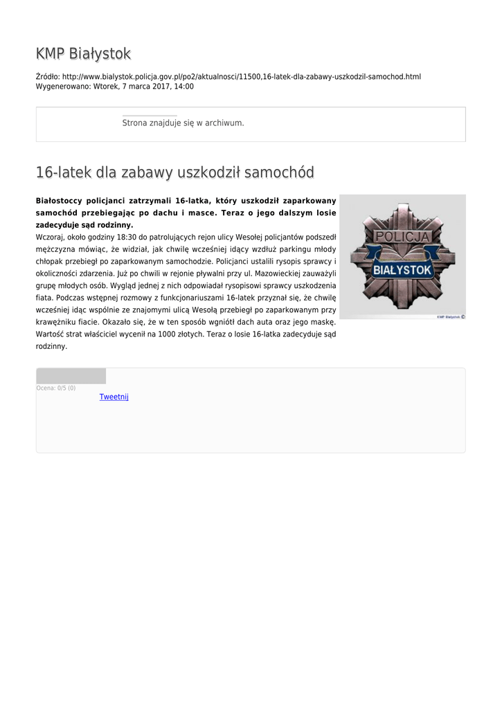 KMP Białystok Źródło: http://www.bialystok.policja.gov.pl/po2/aktualnosci/11500,16-latek-dla-zabawy-uszkodzil-samochod.html Wygenerowano: Wtorek, 7 marca 2017, 14:00 Strona znajduje się w archiwum. 16-latek dla zabawy uszkodził samochód Białostoccy policjanci zatrzymali 16-latka, który uszkodził zaparkowany samochód przebiegając po dachu i masce. Teraz o jego dalszym losie zadecyduje sąd rodzinny. Wczoraj, około godziny 18:30 do patrolujących rejon ulicy Wesołej policjantów podszedł mężczyzna mówiąc, że widział, jak chwilę wcześniej idący wzdłuż parkingu młody chłopak przebiegł po zaparkowanym samochodzie. Policjanci ustalili rysopis sprawcy i okoliczności zdarzenia. Już po chwili w rejonie pływalni przy ul. Mazowieckiej zauważyli grupę młodych osób. Wygląd jednej z nich odpowiadał rysopisowi sprawcy uszkodzenia fiata. Podczas wstępnej rozmowy z funkcjonariuszami 16-latek przyznał się, że chwilę wcześniej idąc wspólnie ze znajomymi ulicą Wesołą przebiegł po zaparkowanym przy krawężniku fiacie. Okazało się, że w ten sposób wgniótł dach auta oraz jego maskę. Wartość strat właściciel wycenił na 1000 złotych. Teraz o losie 16-latka zadecyduje sąd rodzinny. Ocena: 0/5 (0) Tweetnij