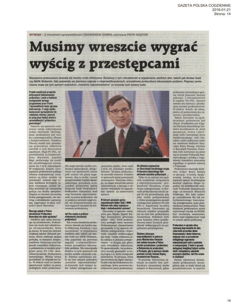 GAZETA POLSKA CODZIENNIE 2016-01-21 Strona: 14 WYWIAD \ Z ministrem sprawiedliwości ZBIGNIEWEM ZIOBRĄ rozmawia PIOTR NISZTOR Musimy wreszcie wygrać wyścig z przestępcami Niezależna prokuratura okazała się bardzo mało efektywna. Świadczy o tym nieudolność w wyjaśnianiu wielkich afer, takich jak Amber Gold czy SKOK Wołomin. Gdy pojawiały się pierwsze sygnały o nieprawidłowościach, początkowo prokuratura lekceważyła problem. Poprzez zanie chania stała się tym samym pośrednio „moralnie odpowiedzialna" za krzywdy tych tysięcy ludzi. Projekt nowelizacji przepisów dotyczących funkcjonowania prokuratury i zmian w kodeksie postępowania kamego przygotowany przez Prawo i Sprawiedliwość budzi ogromne kontrowersje. Z czego wynika konieczność wprowadzenia tak radykalnej reformy i powrotu do połączenia funkcji ministra sprawiedliwości i prokuratora generalnego? Państwo ma sprawnie reali zować swoje zobowiązania wobec obywateli. Obowiąz kiem prokuratury jest wal ka z przestępczością i dbanie o bezpieczeństwo Polaków. Obecny model tzw. niezależ nej prokuratury całkowicie zawiódł w tych kluczowych aspektach. Rząd PO-PSL, od powiedzialny za bezpieczeń stwo obywateli, popełni! błąd, pozbywając się narzę dzi umożliwiających wywią zanie się z tych zobowiązań. W większości krajów euro pejskich prokuratura podlega władzy wykonawczej. Oczy wiście są różne modele tej zależności. Jednak idąc to rem myślenia krytyków ta kich rozwiązań, można by łoby stworzyć np. niezależną policję czy służby specjalne. Organa te również prowadzą liczne postępowania, nie mó wiąc o działalności operacyj nej, ingerujące w sferę wol ności i praw obywateli. Dlaczego jednak w Polsce niezależność Prokuratury Generalnej nie zdała egzaminu? Wadliwa jest sama koncep cja tej niezależności. Prokura tura nie może być odizolowa na od rzeczywistości, która ją otacza. To musi być element większej całości. Element sys temu, który realizuje spójną politykę w obszarze bezpie czeństwa. Instytucja musi być przede wszystkim efektywna, a prokuratura w modelu przy jętym przez PO i PSL ubez własnowolniała Prokuratora Generalnego. Można wręcz powiedzieć, że wiązała mu rę ce. W efekcie miał on bardzo ograniczony wpływ na pracę podległych sobie prokuratur. fot. Zbyszek Kaczraarek/Gazeta Polska Nie mógł odwołać szefów pro kuratur apelacyjnych, okręgo wych czy rejonowych, nawet jeśli oceniał ich pracę nega tywnie. Aby to zrobić, musiał przeprowadzić bardzo skom plikowaną procedurę, m.in. uzyskać pozytywną opinię Krajowej Rady Prokuratury. Prokurator Generalny brał więc formalnie odpowiedzial ność za pracę prokuratur, ale w praktyce niewiele mógł zro bić, nie otrzymał bowiem wy starczających narzędzi do kie rowania prokuraturą. Jak Pan ocenia w praktyce efektywność niezależnej prokuratury? T&k zwana niezależna proku ratura okazała się bardzo ma ło efektywna. Świadczy o tym nieudolność w wyjaśnianiu wielkich afer, takich jak Am ber Gold czy SKOK Wołomin. Gdy pojawiały się pierwsze sygnały o nieprawidłowo ściach, początkowo lekcewa żyła problem. Nie wszczynała śledztw w tych sprawach lub bardzo szybko umarzała wąt ki. Poprzez zaniechania sta ła się tym samym pośrednio „moralnie odpowiedzialna" za krzywdy tych tysięcy lu dzi. Gdyby zareagowano od powiednio szybko, duża część z nich nie zostałaby poszko dowana. Ta sama prokuratu ra zawodzi również Polaków w sprawach mniej poważnych przestępstw. Wszystko dlate go, że rządzi statystyka spraw załatwionych, a decyzja o od mowie wszczęcia to najszyb szy sposób na załatwienie sprawy. W których sprawach oprócz wspomnianych Amber Gold i SKOK Wołomin było widać największe błędy i niedoskonałości systemu? Chociażby w sprawie zabój stwa gen. Marka Papały [by łego komendanta głównego policji - red.]. Dwie prokura tury podległe temu samemu Prokuratorowi Generalnemu prowadziły w tej sprawie od dzielne postępowania i forso wały zupełnie wykluczające się wizje. Osoba wskazana ja ko zabójca w jednym postępo waniu - w drugim jest głów nym świadkiem oskarżenia. To spowodowało, że prokura tury zaczęły prowadzić ze so bą wojnę o to, która wersja jest prawdziwa. To sytuacja, która nie powinna się nigdy zdarzyć. IU jest rola dla Prokuratora Ge neralnego, który powinien ko ordynować prace prokuratury. Ale głównym argumentem za stworzeniem niezależnego urzędu Prokuratora Generalnego było ukrócenie nacisków politycznych... Tylko że ta zmiana nie speł niła oczekiwań związanych z odpolitycznieniem pro kuratury. Świadczą o tym liczne postępowania, w któ rych prokuratorzy tracili za pał do ich prowadzenia, gdy jako osoby podejrzewane o różne przestępstwa zaczęli występować politycy PO lub PSL-u. Popatrzmy na aferę hazardową. Umorzenie jej różnych wątków przypadło już na czas tzw. prokuratury niezależnej. Podobnie było przy badaniu afery podsłu chowej mimo licznych prze słanek wskazujących na po pełnienie przestępstwa. prokurator prowadzący spra wę chciał postawić zarzuty jednemu z wiceministrów w rządzie PO-PSL. Sprawa została mu zabrana i przeka zana innemu prokuratorowi. W efekcie doszło do odstą pienia od postawienia mu za rzutów i przedawnienia. Takich dowodów na upoli tycznienie prokuratury jest więcej. Przykładem jest ściga nie Mariusza Kamińskiego [mi nistra koordynatora ds. służb specjalnych, twórcy i pierw szego szefa Centralnego Biura Antykorupcyjnego - red.]. Cha rakter czysto polityczny miało też niedawne śledztwo doty czące Beaty Kempy, minister w Kancelarii Premiera. Powo dem było zwrócenie się przez nią do prezesa Trybunału Kon stytucyjnego z prośbą o wyja śnienie charakteru orzeczenia zapadłego w sprawie ustawy o Trybunale. Prokuratura wszczęła śledz two wobec Beaty Kempy w sytuacji, w której dyspo nowała wiedz
