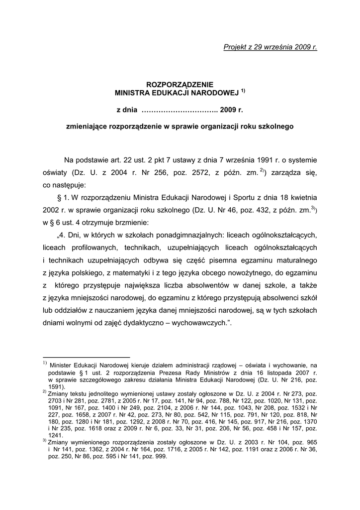 Projekt z 29 września 2009 r. ROZPORZĄDZENIE MINISTRA EDUKACJI NARODOWEJ 1) z dnia ………………………….. 2009 r. zmieniające rozporządzenie w sprawie organizacji roku szkolnego Na podstawie art. 22 ust. 2 pkt 7 ustawy z dnia 7 września 1991 r. o systemie oświaty (Dz. U. z 2004 r. Nr 256, poz. 2572, z późn. zm. 2)) zarządza się, co następuje: § 1. W rozporządzeniu Ministra Edukacji Narodowej i Sportu z dnia 18 kwietnia 2002 r. w sprawie organizacji roku szkolnego (Dz. U. Nr 46, poz. 432, z późn. zm.3)) w § 6 ust. 4 otrzymuje brzmienie: „4. Dni, w których w szkołach ponadgimnazjalnych: liceach ogólnokształcących, liceach profilowanych, technikach, uzupełniających liceach ogólnokształcących i technikach uzupełniających odbywa się część pisemna egzaminu maturalnego z języka polskiego, z matematyki i z tego języka obcego nowoŜytnego, do egzaminu z którego przystępuje największa liczba absolwentów w danej szkole, a takŜe z języka mniejszości narodowej, do egzaminu z którego przystępują absolwenci szkół lub oddziałów z nauczaniem języka danej mniejszości narodowej, są w tych szkołach dniami wolnymi od zajęć dydaktyczno – wychowawczych.”. 1) Minister Edukacji Narodowej kieruje działem administracji rządowej – oświata i wychowanie, na podstawie § 1 ust. 2 rozporządzenia Prezesa Rady Ministrów z dnia 16 listopada 2007 r. w sprawie szczegółowego zakresu działania Ministra Edukacji Narodowej (Dz. U. Nr 216, poz. 1591). 2) Zmiany tekstu jednolitego wymienionej ustawy zostały ogłoszone w Dz. U. z 2004 r. Nr 273, poz. 2703 i Nr 281, poz. 2781, z 2005 r. Nr 17, poz. 141, Nr 94, poz. 788, Nr 122, poz. 1020, Nr 131, poz. 1091, Nr 167, poz. 1400 i Nr 249, poz. 2104, z 2006 r. Nr 144, poz. 1043, Nr 208, poz. 1532 i Nr 227, poz. 1658, z 2007 r. Nr 42, poz. 273, Nr 80, poz. 542, Nr 115, poz. 791, Nr 120, poz. 818, Nr 180, poz. 1280 i Nr 181, poz. 1292, z 2008 r. Nr 70, poz. 416, Nr 145, poz. 917, Nr 216, poz. 1370 i Nr 235, poz. 1618 oraz z 2009 r. Nr 6, poz. 33, Nr 31, poz. 206, Nr 56, poz. 458 i Nr 157, poz. 1241. 3) Zmiany wymienionego rozporządzenia zostały ogłoszone w Dz. U. z 2003 r. Nr 104, poz. 965 i Nr 141, poz. 1362, z 2004 r. Nr 164, poz. 1716, z 2005 r. Nr 142, poz. 1191 oraz z 2006 r. Nr 36, poz. 250, Nr 86, poz. 595 i Nr 141, poz. 999. § 2. Rozporządzenie wchodzi w Ŝycie po upływie 14 dni od dnia ogłoszenia. Minister Edukacji Narodowej Uzasadnienie Zgodnie z obowiązującym rozporządzeniem Ministra Edukacji Narodowej i Sportu z dnia 18 kwietnia 2002 r. w sprawie organizacji roku szkolnego (Dz. U. Nr 46, poz. 432, z późn. zm.) dniami wolnymi od zajęć dydaktyczno – wychowawczych są dni, w których odbywa się część pisemna egzaminu maturalnego z języka polskiego i z tego przedmiotu obowiązkowego, do egzaminu z którego przystępuje największa liczba absolwentów w danej szkole, a takŜe z języka mniejszości narodowej, do egzaminu z którego przystępują absolwenci szkół lub oddziałów z nauczaniem języka danej mniejszości. W związku z tym, Ŝe od roku szkolnego 2009/2010 zmieniły się zasady egzaminu maturalnego i obowiązkowym przedmiotem dla wszystkich absolwentów w części pisemnej egzaminu maturalnego obok języka polskiego i języka obcego nowoŜytnego będzie równieŜ matematyka, konieczne jest wprowadzenie proponowanej zmiany. Dniami wolnymi od zajęć dydaktyczno – wychowawczych będą zatem dni, w których przeprowadzana będzie część pisemna egzaminu maturalnego z: języka polskiego, matematyki, języka obcego nowoŜytnego, do którego przystępuje największa liczba absolwentów w danej szkole, a w przypadku szkół lub oddziałów z nauczaniem języka danej mniejszości narodowej, takŜe dzień w którym absolwenci przystępują do egzaminu z tego języka. W porównaniu z obecnym stanem prawnym wprowadza się zatem dodatkowy dzień wolny od zajęć dydaktyczno-wychowawczych. Zgodnie z art. 5 ustawy z dnia 7 lipca 2005 r. o działalności lobbingowej w procesie stanowienia prawa (Dz. U. Nr 169, poz. 1414 i z 2009 r. Nr 42, poz. 337) projekt ww. rozporządzenia zostanie udostępniony w Biuletynie Informacji Publicznej na stronie internetowej Ministerstwa Edukacji Narodowej (www.men.gov.pl). Rozporządzenie nie zawiera przepisów technicznych w rozumieniu rozporządzenia Rady Ministrów z dnia 23 grudnia 2002 r. w sprawie sposobu funkcjonowania krajowego sytemu notyfikacji norm i aktów prawnych (Dz. U. Nr 239, poz. 2039 i z 2004 r. Nr 65, poz. 597), w związku z tym nie podlega notyfikacji. Przedmiot regulacji nie jest objęty zakresem prawa Unii Europejskiej. Ocena Skutków Regulacji (OSR) 1. Podmioty, na które oddziałuje projektowana regulacja Projekt rozporządzenia dotyczy uczniów, nauczycieli, rodziców, organów prowadzących szkoły i organów sprawujących nadzór pedagogiczny. 2. Konsultacje społeczne Projekt rozporządzenia zostanie przekazany do zaopiniowania następującym związkom zawodowym i partnerom społecznym: 1) Chrześcijańskiemu Związkowi Zawodowemu „Solidarność im. ks. Jerzego Popiełuszki”; 2) Zarządowi Głównemu Związku Nauczycielstwa Polskiego; 3) Sekcji Krajowej Oświaty i Wychowania NSZZ „Solidarność”; 4) Komisji Krajowej Wolnego Związku Zawodowego „Sierpień 80”; 5) Komisji Krajowej NSZZ „Solidarność”; 6) Zarządowi Krajowego Związku Zawodowego Nauczycieli Średnich Szkół Leśnych w Polsce; 7) Związkowi Zawodowemu Pracowników Oświaty i Wychowania „Oświata”; 8) Krajowej Sekcji Oświaty NSZZ „Solidarność 80”; 9) NiezaleŜnemu Samorządnemu Związkowi Zawodowemu Schronisk dla Nieletnich i Zakładów Poprawczych; 10) Związkowi Zawodowemu „Rada Poradnictwa”; 11) Sekretariatowi Konferencji Episkopatu Polski; 12) Polskiej Radzie Ekumenicznej; 13) Radzie Szkół Katolickich; 14) Społecznemu Towarzystwu Oświatowemu; 15) Krajowemu Forum Oświaty Niepublicznej; 16) Krajowemu Porozumieniu Rodz