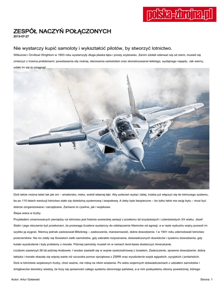 ZESPÓŁ NACZYŃ POŁĄCZONYCH 2013-07-27 Nie wystarczy kupić samoloty i wykształcić pilotów, by stworzyć lotnictwo. Wilburowi i Orvillowi Wrightom w 1903 roku wystarczyły długa płaska łąka i prosty szybowiec. Zanim zdołali oderwać się od ziemi, musieli się zmierzyć z trzema problemami: powstawania siły nośnej, sterowania samolotem oraz skonstruowania lekkiego, wydajnego napędu. Jak wiemy, udało im się to osiągnąć. Dziś także można latać tak jak oni – amatorsko, nisko, wokół własnej łąki. Aby polecieć wyżej i dalej, trzeba już włączyć się do lotniczego systemu, bo po 110 latach ewolucji lotnictwo stało się dziedziną systemową i zespołową. A żeby było bezpieczne – bo tylko takie ma rację bytu – musi być dobrze zorganizowane i zarządzane. Zarówno to cywilne, jak i wojskowe. Ślepa wiara w liczby Przykładem zmarnowanych pieniędzy na lotnictwo jest historia sowieckiej awiacji z przełomu lat trzydziestych i czterdziestych XX wieku. Józef Stalin i jego otoczenie byli przekonani, że przewaga liczebna wystarczy do odstręczenia Niemców od agresji, a w razie wybuchu wojny pozwoli im szybko ją wygrać. Niemcy jednak zastosowali Blitzkrieg – zaskoczenie, manewrowość, dobre dowodzenie. I w 1941 roku zdemolowali lotnictwo przeciwników. Na nic zdały się Sowietom setki samolotów, gdy zabrakło rozpoznania, doświadczonych dowódców i systemu dowodzenia, gdy kulało wyszkolenie i były problemy z morale. Później samoloty musieli im w ramach lend-lease dostarczyć Amerykanie. Liczbom zawierzyli 26 lat później Arabowie. I srodze zawiedli się w wojnie sześciodniowej z Izraelem. Zaskoczenie, sprawne dowodzenie, dobra taktyka i morale okazały się więcej warte niż szczodra pomoc sprzętowa z ZSRR oraz wyszkolenie wojsk egipskich, syryjskich i jordańskich. Dziś w lotnictwie wojskowym liczby, choć ważne, nie robią na nikim wrażenia. Po wielu wojennych doświadczeniach z udziałem samolotów i śmigłowców dowódcy wiedzą, że liczy się sprawność całego systemu obronnego państwa, a w nim podsystemu obrony powietrznej, którego Autor: Artur Goławski Strona: 1 lotnictwo jest główną częścią. By system i wszystkie jego elementy były efektywne, muszą działać sprawnie, szybko i precyzyjnie. Niełatwo to osiągnąć, bo na lotnictwo składają się nie tylko samoloty i śmigłowce, lotniska oraz piloci i technicy. Tworzą je także centra dowodzenia, służby meteorologiczne, ruchu lotniczego, wysokościowo-ratownicze, pododdziały utrzymania czystości i ochrony, jednostki radiotechniczne i rozpoznawcze, ośrodki szkolenia, placówki medycyny lotniczej i odnowy kondycyjnej, strażacy lotniskowi, pododdziały inżynieryjne i remontowe, jednostki chemiczne, specjalistyczna logistyka zapewniająca paliwo, środki bojowe, żywieniei kwaterunek oraz sztabowcy – wśród nich oficerowie operacyjni, planiści, fachowcy od morale i dyscypliny. Wszyscy ci ludzie, wyposażeni w coraz bardziej skomplikowany i drogi sprzęt, muszą tworzyć zgrany zespół, potrafiący działać w czasie rzeczywistym, doskonale rozumiejący swoje zadania i świadomy elitarności lotniczej profesji. Jeśli to się im udaje, piloci mogą latać dużo i bezpiecznie. Morale „Elita” – to słowo wydaje się patetyczne, niedzisiejsze i nieco skompromitowane. Wciąż jest jednak konieczne w opisie zawodu pilota. Choćby dlatego, że trudno jest zostać wojskowym pilotem. Na studia do Wyższej Szkoły Oficerskiej Sił Powietrznych przyjmowanych jest do 50 kandydatów rocznie, a bywały już lata, w których wstrzymano rekrutację. Aby dostać się do Szkoły Orląt, maturzysta musi pokonać wielu rywali i już ta pierwsza selekcja daje mu przedsmak tego, co czeka go w przyszłości. Samo przyjęcie do WSOSP nie gwarantuje dotrwania do promocji i zdobycia lotniczej gapy. Wymagania stawiane pilotom są wysokie i takie pozostaną. Podchorążowie słyszą, że muszą godzić się z tym, że uczniami pozostaną przez całe zawodowe życie i ciągle będą poddawani sprawdzianom. Nie mogą zawieść, prowadząc warte kilkanaście czy kilkadziesiąt milionów złotych maszyny. W naszych stutysięcznych siłach zbrojnych mamy około 700 pilotów, a zatem mniej niż jeden na stu żołnierzy może nosić gapę na mundurze. W Siłach Powietrznych, co zrozumiałe, odsetek ten jest większy, tu na jednego pilota przypada 31 żołnierzy. To kolejny wyznacznik elitarności tego fachu. Następny wynika z kontaktu z najnowocześniejszą techniką. Piloci muszą wiedzieć, jak ich samolot czy śmigłowiec działa, by w razie potrzeby umieć go samemu przygotować do startu. Dlatego studia na kierunku pilotaż mają charakter inżynierski. Absolwenci kierunków pilotażowych WSOSP muszą umieć podejmować trafne decyzje nawet w deficycie czasu. Muszą bezwzględnie poddać się dyscyplinie i rozkazom, a jednocześnie wymaga się od nich asertywności. Muszą sprawnie porozumiewać się w języku angielskim z kontrolerami i pilotami w różnych krajach, przyswajać szybko i trwale nowe instrukcje, regulaminy i procedury. Muszą dbać o zdrowie i kondycję, bo uprawianie tej profesji nie sprzyja utrzymaniu zdrowych kręgosłupów, a normy testu z WF-u dla personelu latającego są zbliżone do wymagań stawianych żołnierzom Wojsk Specjalnych. Autor: Artur Goławski Strona: 2 Bez względu na to, czy wojskowi piloci latają wysoko czy nisko, w dzień czy w nocy, w dobrych czy złych warunkach atmosferycznych, bojowo czy szkoleniowo, muszą być odważni, odpowiedzialni, rzetelni i zawsze prawdomówni, czyli respektować zyskującą ostatnio również w wojsku popularność zasadę „just culture” (w uproszczeniu chodzi o dobrowolne przyznawanie się do własnych błędów zaraz po ich popełnieniu, w trosce o bezpieczeństwo własne i kolegów). A po kilku latach pozostawania w roli ucznia, potem samodzielnego pilota powinni przejąć pracę instruktora. I w 