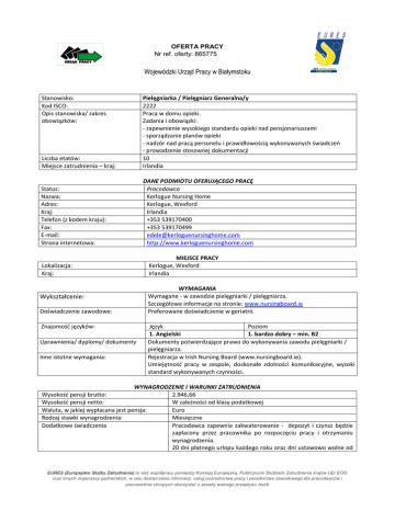 OFERTA PRACY Nr ref. oferty: 865775 Wojewódzki Urząd Pracy w Białymstoku Stanowisko: Kod ISCO: Opis stanowiska/ zakres obowiązków: Liczba etatów: Miejsce zatrudnienia – kraj: Pielęgniarka / Pielęgniarz Generalna/y 2222 Praca w domu opieki. Zadania i obowiązki: - zapewnienie wysokiego standardu opieki nad pensjonariuszami - sporządzanie planów opieki - nadzór nad pracą personelu i prawidłowością wykonywanych świadczeń - prowadzenie stosownej dokumentacji 10 Irlandia Status: Nazwa: Adres: Kraj: Telefon (z kodem kraju): Fax: E-mail: Strona internetowa: DANE PODMIOTU OFERUJĄCEGO PRACĘ Pracodawca Kerlogue Nursing Home Kerlogue, Wexford Irlandia +353 539170400 +353 539170499 [email protected] http://www.kerloguenursinghome.com Lokalizacja: Kraj: Wykształcenie: Doświadczenie zawodowe: Znajomość języków: Uprawnienia/ dyplomy/ dokumenty Inne istotne wymagania: MIEJSCE PRACY Kerlogue, Wexford Irlandia WYMAGANIA Wymagane - w zawodzie pielęgniarki / pielęgniarza. Szczegółowe informacje na stronie: www.nursingboard.ie Preferowane doświadczenie w geriatrii. Język Poziom 1. Angielski 1. bardzo dobry – min. B2 Dokumenty potwierdzające prawo do wykonywania zawodu pielęgniarki / pielęgniarza. Rejestracja w Irish Nursing Board (www.nursingboard.ie). Umiejętność pracy w zespole, doskonałe zdolności komunikacyjne, wysoki standard wykonywanych czynności. WYNAGRODZENIE I WARUNKI ZATRUDNIENIA Wysokość pensji brutto: 2.946,66 Wysokość pensji netto: W zależności od klasy podatkowej Waluta, w jakiej wypłacana jest pensja: Euro Rodzaj stawki wynagrodzenia: Miesięczne Dodatkowe świadczenia Pracodawca zapewnia zakwaterowanie - depozyt i czynsz będzie zapłacony przez pracownika po rozpoczęciu pracy i otrzymaniu wynagrodzenia. 20 dni płatnego urlopu każdego roku oraz dni ustawowo wolne od EURES (Europejskie Służby Zatrudnienia) to sieć współpracy pomiędzy Komisją Europejską, Publicznymi Służbami Zatrudnienia krajów UE/ EOG oraz innych organizacji partnerskich, w celu dostarczania informacji, usług pośrednictwa pracy i poradnictwa zawodowego dla pracodawców i pracowników chcących skorzystać z zasady wolnego przepływu osób Nazwa firmy, z którą zostanie podpisana umowa: Rodzaj umowy: Wymiar czasu pracy pracy. W razie potrzeby – pracodawca zapewnia szkolenie w zakresie gerontologii, przezskórnej endoskopowej gastrostomii i innych zabiegów Kerlogue Nursing Homes Czas trwania umowy: Liczba godzin tygodniowo: Umowa o pracę Pełen etat zgodnie z harmonogramem dyżurów. Praca na zmiany (12 godz. dziennie) oraz w porze nocnej. Na czas nieokreślony 40 Data rozpoczęcia pracy: Od zaraz Wymagane dokumenty SPOSÓB SKŁADANIA WNIOSKU CV Język, w którym muszą być sporządzone przedkładane dokumenty: Do kogo należy wysłać dokumenty: angielski Gdzie należy wysłać dokumenty: [email protected] z dopiskiem pielęgniarka generalna/pielęgniarz generalny tel. 85 7497 235 Dane kontaktowe do przedstawiciela pracodawcy: [email protected] Data publikacji: Termin przedkładania podań o pracę / zakończenia ważności oferty: Do doradcy EURES WAŻNOŚĆ 20.08.2014 Do odwołania Uprzejmie informujemy, że skontaktujemy się wyłącznie z wybranymi kandydatami. UWAGA: 1. Umowa z zagranicznym pracodawcą zostanie zawarta zgodnie z prawem kraju zatrudnienia. Oznacza to, że wszystkie roszczenia odnośnie do warunków, które obejmuje umowa, można kierować wyłącznie do odpowiedniego sądu w kraju zatrudnienia. Publiczne służby zatrudnienia (EURES) nie mogą pośredniczyć ani reprezentować pracownika w sądzie kraju zatrudnienia w przypadku sporu z pracodawcą. 2. Publiczne służby zatrudnienia (EURES) dokładają wszelkich starań, aby zapewnić rzetelność i wiarygodność ofert pracy zgłoszonych w lokalnym urzędzie pracy. Należy wyjaśnić, że oferta pracy została zgłoszona przez stronę trzecią i EURES nie odpowiada za ewentualne rozbieżności między warunkami pracy określonymi w ofercie pracy i warunkami oferowanymi przez potencjalnego pracodawcę. 3. Publiczne służby zatrudnienia (EURES) informują, że będą zbierać, przetwarzać i przekazywać potencjalnym pracodawcom zgodnie z przepisami dotyczącymi ochrony danych osobowych wszystkie dane osobowe dostarczone przez osoby poszukujące pracy. EURES (Europejskie Służby Zatrudnienia) to sieć współpracy pomiędzy Komisją Europejską, Publicznymi Służbami Zatrudnienia krajów UE/ EOG oraz innych organizacji partnerskich, w celu dostarczania informacji, usług pośrednictwa pracy i poradnictwa zawodowego dla pracodawców i pracowników chcących skorzystać z zasady wolnego przepływu osób
