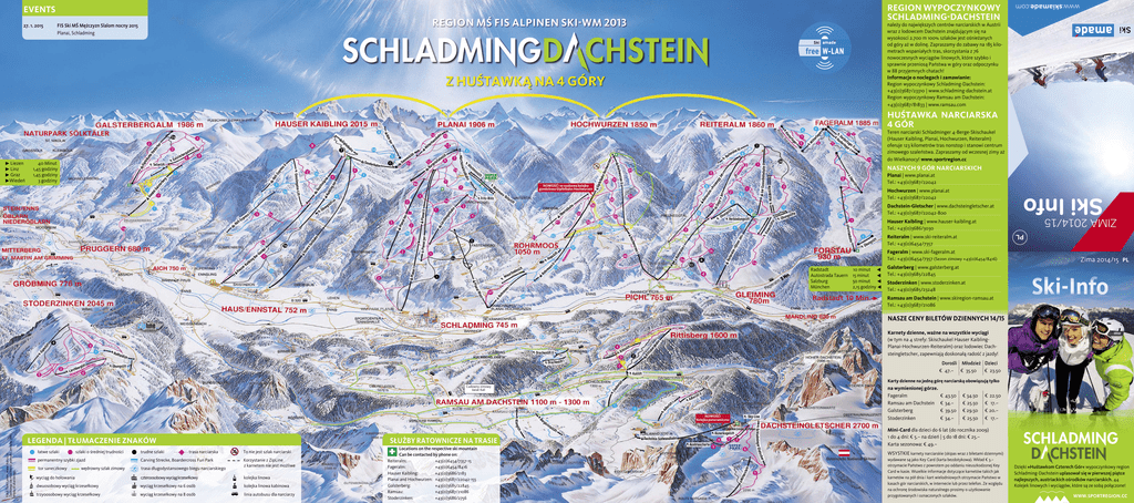 w w w. s k i a m a d e . c o m Region MŚ FIS Alpinen Ski-WM 2013 27. 1. 2015 FIS Ski MŚ Mężczyzn Slalom nocny 2015 Planai, Schladming www.skiamade.com Region wypoczynkowy Schladming-Dachstein Events należy do największych centrów narciarskich w Austrii wraz z lodowcem Dachstein znajdującym się na wysokosci 2.700 m 100% szlaków jest ośnieżanych od góry aż w dolinę. Zapraszamy do zabawy na 185 kilometrach wspaniałych tras, skorzystania z 76 nowoczesnych wyciągów linowych, które szybko i sprawnie przeniosą Państwa w góry oraz odpoczynku w 88 przyjemnych chatach! Informacje o noclegach i zamawianie: Region wypoczynkowy Schladming-Dachstein: +43(0)3687/23310 | www.schladming-dachstein.at Region wypoczynkowy Ramsau am Dachstein: +43(0)3687/81833 | www.ramsau.com Z huśtawką na 4 góry et p ’n J ge r t te g Übun lif t e Has Rei tera lm I ift Hauser Kaibling | www.hauser-kaibling.at Tel.: +43(0)3686/3030 ift gsl n Übu P lan e st ai W Ro hrm o o mo sI lift den rbo e s Mo h Ro r Reiteralm | www.ski-reiteralm.at Tel.: +43(0)6454/7357 Fageralm | www.ski-fageralm.at Tel.: +43(0)6454/7357 (Sezon zimowy +43(0)6454/8416) I sil Reit era lm » Silv er J et« Pl a n a i 3 e r H op Pl a n a i I el Tau ern Se ilb a hn ibl nd Dachstein-Gletscher | www.dachsteingletscher.at Tel.: +43(0)3687/22042-800 slifte hn Ka Go r fa Muldenlifte 6 e r G a sselh öh e b a h n I I « Je t egg reu n »P Sep Re ite ral m li f t ng s Übu Verbindungslift eck Lär chk oge lba hn ahn alb ert b O I rzen hwu Hoc Ha er us ing r8e Mi n urz e o ch w hn H G i pf el b a er ina g6 b l in Hö f-E xpr ess Ga lst erb erg Qu att ral p Kai Planai II if t Hochwurzen | www.planai.at Tel.: +43(0)3687/22042 a Forstaub Plan ai 6 er erl D -Te ll DE PL ift NOWOŚĆ! 10-osobowa kolejka gondolowa Gipfelbahn Hochwurzen WINTER ZIMA 2014/15 2014/15 Ski-Info Fritz-Blitz oos W i nt er 2 0 1 0 / 1 1 Ski Info sI g sl itm t We Naszych 9 gór narciarskich Planai | www.planai.at Tel.: +43(0)3687/22042 rlif un Üb Teren narciarski Schladminger 4-Berge-Skischaukel (Hauser Kaibling, Planai, Hochwurzen, Reiteralm) oferuje 123 kilometrów tras nonstop i stanowi centrum zimowego szaleństwa. Zapraszamy od wczesnej zimy aż do Wielkanocy! www.sportregion.cc Vo Vo rder rde fa rfa ger ge II rI e Jäg el e nd fa g We itm oo sli ft hn Go ter ift lml lla a t rgs Bu eba res rb a h n Hin II lift eck n n So r III alm iter e R w ies xp f-E Hö S ende rh tte Mi urzen II Hochw Tellerlift hn hn ba s au Märchen erg 6 er terb Alm 40 Minut 1,45 godziny 1,45 godziny 3 godziny G al s Gip fel ba lift alm if t Ennslingalm-L ˘ Liezen ˘ Linz ˘ Graz ˘Wiedeń Gip fel bah nV ord erk ar huśtawka narciarska 4 gór Radstadt 10 minut ¯ Autostrada Tauern 15 minut ¯ Salzburg 50 minut ¯ München 2,15 godziny ¯ I os Zima 2014/15 PL Galsterberg | www.galsterberg.at Tel.: +43(0)3685/22845 Stoderzinken | www.stoderzinken.at Tel.: +43(0)3685/23248 Ramsau am Dachstein | www.skiregion-ramsau.at Tel.: +43(0)3687/21086 Nasze ceny biletów dziennych 14/15 lift berg Lärch rgb be tis Ri t Gip fe ll i f t ft isli R i tt Drachenlift II Roßf eldlif t ah n Karnety dzienne, ważne na wszystkie wyciągi (w tym na 4 strefy: Skischaukel Hauser KaiblingPlanai-Hochwurzen-Reiteralm) oraz lodowiec Dachsteingletscher, zapewniają doskonałą radość z jazdy! Drachenlift I Übungslift Kalilift Karty dzienne na jedną górę narciarską obowiązują tylko Zau be rli ft Cudowny zimowy świat Kali r li f t Adle na wymienionej górze. Fageralm Ramsau am Dachstein Galsterberg Stoderzinken II Ad l I ift erl dwuosobowy wyciąg krzesełkowy trzyoosobowy wyciąg krzesełkowy wyciąg krzesełkowy na 6 osób wyciąg krzesełkowy na 8 osób kolejka linowa kolejka linowa kabinowa linia autobusu dla narciarzy t Hunerkogellift Dachstein Südwandbahn Austriascharte te i n Korzystanie z ZipLine z karnetem nie jest możliwe trasa długodystansowego biegu narciarskiego czteroosobowy wyciąg krzesełkowy To nie jest szlak narciarski llif ter s wędrowny szlak zimowy wyciąg do holowania trasa narciarska Carving Strecke, Boardercross Fun Park ta l er tor saneczkowy , trudne szlaki Sky-Line NOWOŚĆ! Kolejka panoramiczna M it szlaki o średniej trudności permanentny szybki zjazd r is t sc h Foto: Tom Lamm, www.ikarus.cc Zastrzega się możliwość pomyłki, zmiany cen i błędu drukarskiego. ft łatwe szlaki Locations on the respective ski mountain Can be contacted by phone on: Reiteralm: +43(0)6454/7357-15 Fageralm: +43(0)6454/8416 Hauser Kaibling: +43(0)3686/2183 Planai and Hochwurzen: +43(0)3687/22042-155 Galsterberg: +43(0)3685/22845 Ramsau: +43(0)3687/21086 Stoderzinken: +43(0)3686/2756 rgk Schla dm i n g e r G l e Kl a n g li Służby ratownicze na trasie LegendA | Tłumaczenie znaków Be Dorośli Młodzież Dzieci € 47.– € 35.50 € 23.50 € 43.50 €34.– € 39.50 €34.– €34.50 €25.50 €29.50 €25.50 € 22.50 € 17.– €20.– € 17.– Mini-Card dla dzieci do 6 lat (do rocznika 2009) 1 do 4 dni: € 5.– na dzień | 5 do 18 dni: € 25.– Karta sezonowa: € 49.– WSYSTKIE karnety narciarskie (skipas wraz z biletami dziennymi) wydawane są jako Key Card (karta bezdotykowa). Wkład € 3.– otrzymacie Państwo z powrotem po oddaniu nieuszkodzonej Key Card w kasie. Wszelkie informacje dotyczące karnetów takich jak karnetów na pół dnia i kart wielodniowych otrzymacie Państwo w kasach gór narciarskich, w internecie lub przez telefon. Ze względu na ochronę środowiska naturalnego prosimy o użytkowanie przygotowanych i oznaczonych szlaków. Dzięki »Huśtawkom Czterech Gór« wypoczynkowy region Schladming-Dachstein uplasował się w pierwszej piątce najlepszych, austriackich ośrodków narciarskich. 44 Kolejek linowych i wyciągów, które są ze sobą połączone! WWW.SPORTREGION.CC