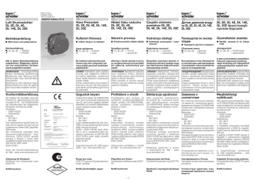 Elster GmbH Postfach 2809 49018 Osnabrück D 03250191 Edition 12.12 Luft-Druckwächter GB DL 2E, DL 4E, F DL 14E, DL 35E D TR Hava Prezostatı CZ DL 2E, DL 4E, DL 14E, PL DL 35E NL RUS I H D TR D TR CZ D TR CZ PL TR CZ PL RUS CZ PL Hlídač tlaku vzduchu PL DL 2E, DL 4E, RUS DL 14E, DL 35E RUS Czujniki ciśnienia RUS powietrza DL 2E, H DL 4E, DL 14E, DL 35E Датчик давления воздуH ха DL 2E, DL 4E, DL 14E, DL 35E Instrukcja obsługi Руководство по эксплу- H DL 2E, DL 4E, DL 14E, DL 35E típusú levegőnyomás-kapcsoló H Üzemeltetési utasítás Betriebsanleitung Kullanım Kılavuzu Návod k provozu Bitte lesen und aufbewahren Lütfen okuyun ve saklayın Prosíme pročíst a dobře odložit Instrukcję przeczytać i prze атации chować Пожалуйста, прочтите и сохраните Zeichenerklärung , , , ...= Tätigkeit ➔ = Hinweis İşaret açıklaması , , , ...= Çalışma ➔ = Uyarı Vysvětlení značek , , , ...= činnost ➔ = upozornění Objaśnienie oznaczeń , , , ...= czynność ➔ = wskazówka Объяснение знаков , , , ... = Действие ➔ = Указание Jelmagyarázat , , , ...= tevékenység ➔ = tájékoztatás Alle in dieser Betriebsanleitung aufgeführten Tätigkeiten dürfen nur von autorisiertem Fachper sonal ausgeführt werden! Bu kullanım kılavuzunda açıklanmış olan tüm çalışmalar yalnızca yetkili personel tarafından yapılacaktır! Všechny v tomto návodu k provozu uvedené činnosti smí provádět jen odborný, autorizovaný personál! Wszystkie czynności opisane w niniejszej instrukcji obsługi mogą być wykonywane wyłącznie przez autoryzowany serwis! Все указанные в этом «Руководстве по эксплуатации» действия разрешается проводить только уполномоченным на это специалистам! A jelen üzemeltetési utasításban felsorolt valamennyi tevékenységet kizárólag erre feljogosított szakszemélyzettel szabad elvégeztetni! WARNUNG! Unsachgemäßer Einbau, Einstellung, Veränderung, Bedienung oder Wartung kann Verletzungen oder Sachschäden verursachen. Anleitung vor dem Gebrauch lesen. Dieses Gerät muss nach den gelten den Vorschriften installiert werden. UYARI! Talimatlara aykırı yapılan montaj, ayar, değiştirme, kullanım ve bakım çalışmaları, yaralanma veya maddi hasarların oluşmasına neden olabilir. Cihazı kullanmadan önce kullanım kılavuzunu okuyun. Bu cihaz geçerli olan teknik yönetmeliklere göre monte edilmelidir. VÝSTRAHA! Neodborné zabudování, nastavení, změny, obsluha nebo údržba mohou vést k ohrožení zdraví a věcným škodám. Před použitím si pročíst návod. Přístroj musí být instalován podle platných předpisů. UWAGA! Niefachowy montaż, regulacja, przeróbki, obsługa lub konserwacja mogą być przyczyną wypadków i szkód materialnych. Przed wykorzystaniem urządzenia należy przeczytać instrukcję obsługi. Montaż urządzenia należy przeprowadzić zgodnie z obowiązującymi przepisami. ПРЕДУПРЕЖДЕНИЕ! Неправильные монтаж, наладка, применение, управ ление и техническое обслуживание могут привести к несчастному случаю и аварии. Перед применением прочесть «Руко водство». Прибор должен быть смонтирован согласно действующих предписаний и норм. E Konformitätserklärung Uygunluk beyanı Prohlášení o shodě Deklaracja zgodności Wir erklären als Hersteller, dass das Produkt DL, gekennzeichnet mit der Produkt-ID-Nr. CE-0085AP0466, die Anforderungen der aufgeführten Richtlinien und Normen erfüllt. Richtlinien: –2009/142/EG –2006/95/EG Normen: – EN 13611 – EN 1854 Das entsprechend bezeichnete Produkt stimmt überein mit dem bei der zugelassenen Stelle 0085 geprüften Baumuster. Die Herstellung unterliegt dem Überwachungsverfahren nach Richtlinie 2009/142/EG gemäß Anhang II Absatz 3 sowie dem Qualitätsmanagementsystem nach DIN EN ISO 9001:2008. Elster GmbH İmalatçı firma olarak, CE-0085AP0466 ürün kod numarasıyla işaretlenmiş olan DL tipi ürünün aşağıda belirtilen direktiflerin ve normların beklentilerine uygun olduğunu beyan ederiz. Direktifler: –2009/142/AB –2006/95/AB Normlar: – EN 13611 – EN 1854 Uygun şekilde işaretlenmiş olan ürün, 0085 numaralı yetkili mercinin kontrol ettiği numune ile aynıdır. Üretim, 2009/142/AB sayılı direktifin II. eki 3. paragrafına göre denetleme yöntemine ve DIN EN ISO 9001:2008’e göre kalite yönetim sistemine tabidir. Elster GmbH Prohlašujeme jako výrobce, že výrobek DL, označený identifikačním číslem výrobku CE-0085AP0466, splňuje požadavky uvedených směrnic a norem. Směrnice: –2009/142/ES –2006/95/ES Normy: – EN 13611 – EN 1854 Odpovídajíc označený výrobek souhlasí s konstrukčním vzorkem přezkoušeným notifikovanou zkušebnou 0085. Výrobce podléhá dozorní metodě podle směrnice 2009/142/ES, příloha II, odst. 3 jakož i systému jištění jakosti podle DIN EN ISO 9001:2008. Elster GmbH Uygunluk beyanının (D, GB) tarayıcı çıktısı – bkz. www.docuthek.com Oskenované prohlášení o shodě (D, GB) – viz www.docuthek.com Jako producent oświadczamy, że produkt DL, oznaczony numerem identyfikacyjnym produktu CE-0085AP0466, spełnia wymagania następujących dyrektyw i norm. Dyrektywy: –2009/142/WE –2006/95/WE Normy: – EN 13611 – EN 1854 Odpowiednio oznakowany produkt odpowiada wzorowi konstrukcyjnemu poddanemu próbie przez dopuszczoną placówkę 0085. Produkcja podlega procedurze kontrolnej zgodnie z dyrektywą 2009/142/WE wg załącznika II, ustęp 3 oraz systemowi zarządzania jakością wg DIN EN ISO 9001:2008. Elster GmbH Scan der