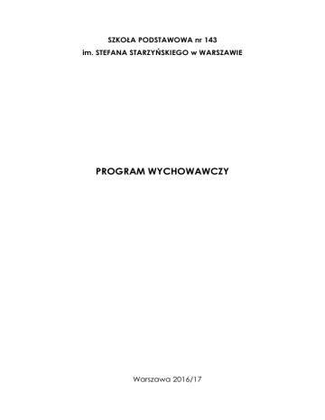 SZKOŁA PODSTAWOWA nr 143 im. STEFANA STARZYŃSKIEGO w WARSZAWIE PROGRAM WYCHOWAWCZY Warszawa 2016/17 PODSTAWA PROGRAMU WYCHOWAWCZEGO SZKOŁY Konstytucja Rzeczpospolitej Polskiej. Ustawa z 26 stycznia 1982 r. Karta Nauczyciela (tekst jednolity: Dz. U. z 2006r. nr 97, poz. 674 ze zm.). Ustawa z 7 września 1991 r. o systemie oświaty (tekst jednolity 2015. Rozporządzenie Ministra Edukacji Narodowej i Sportu z dnia 23 grudnia 2008 r. w sprawie podstawy kształcenia ogólnego w poszczególnych typach szkół Rozporządzenie Ministra Edukacji Narodowej i Sportu z dnia 21 maja 2001 r. w sprawie ramowych statutów publicznego przedszkola oraz publicznych szkół (Dz. U. z 2001r. Nr 61, poz. 624) ze zmianami. Konwencja o Prawach Dziecka Statut Szkoły Podstawowej nr 143 im. Stefana Starzyńskiego w Warszawie. MISJA SZKOŁY W Szkole Podstawowej nr 143 im. Stefana Starzyńskiego uczymy dzieci szacunku do uczenia się i wysiłku intelektualnego. Cenimy i dostrzegamy pracę, wysiłek i zaangażowanie ucznia i nauczyciela. Wychowujemy dzieci w duchu patriotyzmu, dumni z polskiej kultury, tradycji i historii. Uczymy szacunku do innych osób, różnych religii i kultur. Wspieramy wychowawczą rolę rodziny. Szkoła jest naszym wspólnym dobrem. WIZJA Działamy po to, aby uczniowie naszej szkoły: szanowali historię, kulturę i tradycję narodową z jednoczesnym poszanowaniem innych kultur i narodowości, byli przygotowani do życia w nowoczesnym społeczeństwie. Cele priorytetowe w obszarze wychowania na rok szkolny 2016/17 Dążymy do tego, by kształtować: - szacunek do uczenia się - postawy prospołeczne poprzez wzajemne wspieranie w uczeniu się, działalność na rzecz środowiska lokalnego Nasze zadania: Nauczyciele i pracownicy szkoły: okazują szacunek samodzielności, uczniom i dbają o rozwój ich promują atmosferę wysokich osiągnięć i wzajemnego wsparcia, kształtują postawę szacunku dla siebie i innych rozwój (zmianę) organizowanie poprzez kultury osobistej uczniów, m.in. poprzez zajęć poświęconych dobremu wychowaniu, ze szczególnym uwzględnieniem aktywności uczniów, uczą patriotyzmu, m.in. różnorodne działania związane z Patronem szkoły, jej historią. monitorują frekwencję, spóźnienia, systematycznie udzielają informacji zwrotnych, dowartościowujących i wspierających, stwarzają okazję do samooceny ucznia, uśmiechają się do uczniów, dają im do zrozumienia, że wierzą w ich możliwości , wspierają w pokonywaniu trudności, uczą demokracji, .in. poprzez stwarzanie uczniom możliwości wyrażania opinii, uczestnictwa w dyskusjach dotyczących organizacji życia szkolnego wspieranie samorządności, partycypacji w decyzjach, organizują pracę zespołową, pracę w parach, pracę metodą projektów przy współudziale rodziców, umożliwiają wybór pracy domowej; świętują osiągnięcia uczniów – imprezy klasowe, nagrody, organizują wycieczki. Rodzice: dają dziecku do zrozumienia, że rodzic wierzy w możliwości ucznia, wspierają w pokonywaniu trudności, poprzez własny przykład modelują zachowanie dzieci, okazują szacunek samodzielności, uczniom i dbają o rozwój ich promują atmosferę wysokich osiągnięć i wzajemnego wsparcia, współorganizują z nauczycielami imprezy i uroczystości szkolne , kiermasze, organizują konkursy , przyznają nagrody , pobudzają dzieci do refleksji nad zachowaniem, uczeniem, budują więzi z rodziną, uczą szacunku dla wszystkich ludzi, pomagają przy organizacji zajęć, które dają szansę uczniom na spotkania z ludźmi, organizacjami spoza szkoły, świętują osiągnięcia uczniów – imprezy klasowe, nagrody, współorganizują „Noc z testami”, sprawdzian kompetencji w obecności rodziców , monitorują frekwencję, spóźnienia, uczestniczą w “lekcjach otwartych dla obserwując dziecko podczas pracy w szkole. rodziców”, Uczniowie: umieją samodzielnie rozwiązywać zadania. Potrafią się uczyć. W razie trudności potrafią szukać pomocy u kolegów, nauczyciela, są zaangażowani w swoją naukę, uważni na lekcji. Mają poczucie odpowiedzialności za to, co robią, nie spóźniają się na lekcje. Potrafią dotrzymać przyjętego zobowiązania lub umowy. Można im zaufać, są twórczy, z pomysłem, oryginalni. Aktywni w klasie. Umieją pracować w grupie, potrafią stawiać wobec siebie wymagania. Dokładnie, sumiennie i systematycznie uczą się w domu. Uczą się tak dobrze, jak tylko potrafią, cechuje ich kultura osobista w relacjach z innymi. Okazują wszystkim szacunek. Pomagają swoim kolegom, zgłaszają pomysły, jak chcieliby pracować na zajęciach, co chcieliby zrobić dla szkoły, rozmawiają z nauczycielem o tym, w jaki sposób się uczyć, uczą się patriotyzmu poprzez poznawanie sylwetki Patrona, dziedzictwa kulturowego oraz uczestnictwo w uroczystościach patriotycznych, uczą się szacunku wobec ludzi innych wyznań, narodowości, starają się przestrzegać norm i dbają o kulturę języka. W celu monitorowania rozwoju ucznia wprowadza się KARTĘ OCENY PRACY DZIECKA, która jest załącznikiem do niniejszego programu. Program Wychowawczy Szkoły w Warszawie podlega ewaluacji. Podstawowej nr 143 im. Stefana Starzyńskiego