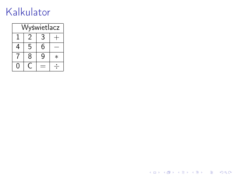 Kalkulator Wyświetlacz 1 2 3 + 4 5 6 − 7 8 9 ∗ 0 C = ÷ Kalkulator Wyświetlacz 1 2 3 + 4 5 6 − 7 8 9 ∗ 0 C = ÷ I Wyobraźmy sobie kalkulator. Taki najprostszy, czterodziałaniowy. Kalkulator Wyświetlacz 1 2 3 + 4 5 6 − 7 8 9 ∗ 0 C = ÷ I I Wyobraźmy sobie kalkulator. Taki najprostszy, czterodziałaniowy. Na pierwszy rzut oka widać klawiaturę (z cyframi i podstawowe klawisze operacji) oraz wyświetlacz. Kalkulator Wyświetlacz 1 2 3 + 4 5 6 − 7 8 9 ∗ 0 C = ÷ I I I Wyobraźmy sobie kalkulator. Taki najprostszy, czterodziałaniowy. Na pierwszy rzut oka widać klawiaturę (z cyframi i podstawowe klawisze operacji) oraz wyświetlacz. Gdy zaczynamy naciskać klawisze cyfr (123) odpowiednie informacje pojawiają się na wyświetlaczu Kalkulator 1 2 4 5 7 8 0 C 1 3 + 6 − 9 ∗ = ÷ I I I Wyobraźmy sobie kalkulator. Taki najprostszy, czterodziałaniowy. Na pierwszy rzut oka widać klawiaturę (z cyframi i podstawowe klawisze operacji) oraz wyświetlacz. Gdy zaczynamy naciskać klawisze cyfr (123) odpowiednie informacje pojawiają się na wyświetlaczu Kalkulator 1 2 4 5 7 8 0 C 3 6 9 = 12 + − ∗ ÷ I I I Wyobraźmy sobie kalkulator. Taki najprostszy, czterodziałaniowy. Na pierwszy rzut oka widać klawiaturę (z cyframi i podstawowe klawisze operacji) oraz wyświetlacz. Gdy zaczynamy naciskać klawisze cyfr (123) odpowiednie informacje pojawiają się na wyświetlaczu Kalkulator 1 2 4 5 7 8 0 C 3 6 9 = 123 + − ∗ ÷ I I I Wyobraźmy sobie kalkulator. Taki najprostszy, czterodziałaniowy. Na pierwszy rzut oka widać klawiaturę (z cyframi i podstawowe klawisze operacji) oraz wyświetlacz. Gdy zaczynamy naciskać klawisze cyfr (123) odpowiednie informacje pojawiają się na wyświetlaczu Kalkulator 1 2 4 5 7 8 0 C 3 6 9 = 123 + − ∗ ÷ I I I I Wyobraźmy sobie kalkulator. Taki najprostszy, czterodziałaniowy. Na pierwszy rzut oka widać klawiaturę (z cyframi i podstawowe klawisze operacji) oraz wyświetlacz. Gdy zaczynamy naciskać klawisze cyfr (123) odpowiednie informacje pojawiają się na wyświetlaczu I tu pojawia się podejrzenie, że wprowadzana liczba jest gdzieś zapamiętywana. Jak oderwiemy palec od klawiatury — wartości nie znikają. Pamięć ta jest (jakoś) powiązana z wyświetlaczem (i klawiaturą). Kalkulator 1 2 4 5 7 8 0 C 3 6 9 = 123 + − ∗ ÷ I I I I I Wyobraźmy sobie kalkulator. Taki najprostszy, czterodziałaniowy. Na pierwszy rzut oka widać klawiaturę (z cyframi i podstawowe klawisze operacji) oraz wyświetlacz. Gdy zaczynamy naciskać klawisze cyfr (123) odpowiednie informacje pojawiają się na wyświetlaczu I tu pojawia się podejrzenie, że wprowadzana liczba jest gdzieś zapamiętywana. Jak oderwiemy palec od klawiatury — wartości nie znikają. Pamięć ta jest (jakoś) powiązana z wyświetlaczem (i klawiaturą). Musimy zmodyfikować nasz schemat. Kalkulator Wyświetlacz Akumulator 1 2 3 + 4 5 6 − 7 8 9 ∗ 0 C = ÷ I Na pierwszy rzut oka widać klawiaturę (z cyframi i podstawowe klawisze operacji) oraz wyświetlacz. Kalkulator Wyświetlacz Akumulator 1 2 3 + 4 5 6 − 7 8 9 ∗ 0 C = ÷ I I Na pierwszy rzut oka widać klawiaturę (z cyframi i podstawowe klawisze operacji) oraz wyświetlacz. Nie widać pamięci nazwanej tu akumulatorem, ale chyba ona tam jest. Kalkulator Wyświetlacz Akumulator 1 2 3 + 4 5 6 − 7 8 9 ∗ 0 C = ÷ I I I Na pierwszy rzut oka widać klawiaturę (z cyframi i podstawowe klawisze operacji) oraz wyświetlacz. Nie widać pamięci nazwanej tu akumulatorem, ale chyba ona tam jest. Gdy zaczynamy naciskać klawisze cyfr (123) odpowiednie informacje pojawiają się na wyświetlaczu i w akumulatorze. Kalkulator 1 2 4 5 7 8 0 C 1 1 3 + 6 − 9 ∗ = ÷ I I I Na pierwszy rzut oka widać klawiaturę (z cyframi i podstawowe klawisze operacji) oraz wyświetlacz. Nie widać pamięci nazwanej tu akumulatorem, ale chyba ona tam jest. Gdy zaczynamy naciskać klawisze cyfr (123) odpowiednie informacje pojawiają się na wyświetlaczu i w akumulatorze. Kalkulator 1 2 4 5 7 8 0 C 3 6 9 = 12 12 + − ∗ ÷ I I I Na pierwszy rzut oka widać klawiaturę (z cyframi i podstawowe klawisze operacji) oraz wyświetlacz. Nie widać pamięci nazwanej tu akumulatorem, ale chyba ona tam jest. Gdy zaczynamy naciskać klawisze cyfr (123) odpowiednie informacje pojawiają się na wyświetlaczu i w akumulatorze. Kalkulator 1 2 4 5 7 8 0 C 3 6 9 = 123 123 + − ∗ ÷ I I I Na pierwszy rzut oka widać klawiaturę (z cyframi i podstawowe klawisze operacji) oraz wyświetlacz. Nie widać pamięci nazwanej tu akumulatorem, ale chyba ona tam jest. Gdy zaczynamy naciskać klawisze cyfr (123) odpowiednie informacje pojawiają się na wyświetlaczu i w akumulatorze. Kalkulator 1 2 4 5 7 8 0 C 3 6 9 = 123 123 + − ∗ ÷ I I I I Na pierwszy rzut oka widać klawiaturę (z cyframi i podstawowe klawisze operacji) oraz wyświetlacz. Nie widać pamięci nazwanej tu akumulatorem, ale chyba ona tam jest. Gdy zaczynamy naciskać klawisze cyfr (123) odpowiednie informacje pojawiają się na wyświetlaczu i w akumulatorze. Naciskamy klawisz operacji. Niech to będzie + Kalkulator 1 2 4 5 7 8 0 C 3 6 9 = 123 123 + − ∗ ÷ I I I I Na pierwszy rzut oka widać klawiaturę (z cyframi i podstawowe klawisze operacji) oraz wyświetlacz. Nie widać pamięci nazwanej tu akumulatorem, ale chyba ona tam jest. Gdy zaczynamy naciskać klawisze cyfr (123) odpowiednie informacje pojawiają się na wyświetlaczu i w akumulatorze. Naciskamy klawisz operacji. Niech to będzie + Kalkulator 1 2 4 5 7 8 0 C 3 6 9 = 123 123 + − ∗ ÷ I Na wyświetlaczu nic się nie zmieniło, ale zmieniło się zachowanie kalkulatora: kolejne wprowadzane wartości powodują skasowanie i zastąpienie wyświetlanej liczby na wyświetlaczu. Kalkulator 1 2 4 5 7 8 0 C 3 6 9 = 123 123 + − ∗ ÷ I I Na wyświetlaczu nic się nie zmieniło, ale zmieniło się zachowanie kalkulatora: kolejne wprowadzane wartości powodują skasowanie i zastąpienie wyświetlanej liczby na wyświetl