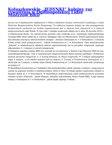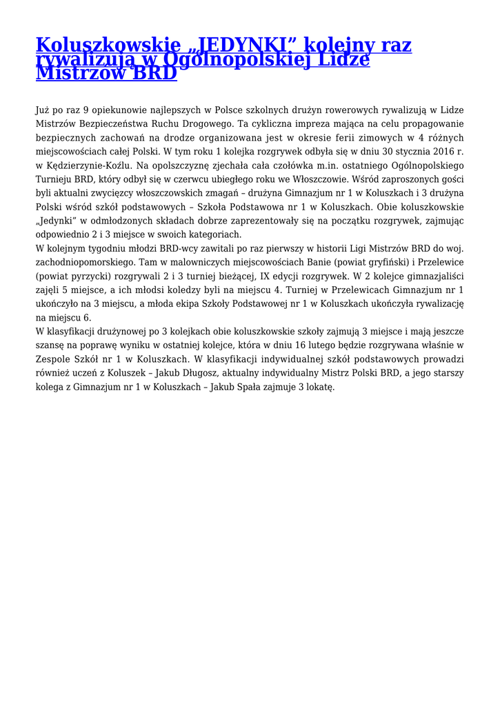 Koluszkowskie „JEDYNKI” kolejny raz rywalizują w Ogólnopolskiej Lidze Mistrzów BRD Już po raz 9 opiekunowie najlepszych w Polsce szkolnych drużyn rowerowych rywalizują w Lidze Mistrzów Bezpieczeństwa Ruchu Drogowego. Ta cykliczna impreza mająca na celu propagowanie bezpiecznych zachowań na drodze organizowana jest w okresie ferii zimowych w 4 różnych miejscowościach całej Polski. W tym roku 1 kolejka rozgrywek odbyła się w dniu 30 stycznia 2016 r. w Kędzierzynie-Koźlu. Na opolszczyznę zjechała cała czołówka m.in. ostatniego Ogólnopolskiego Turnieju BRD, który odbył się w czerwcu ubiegłego roku we Włoszczowie. Wśród zaproszonych gości byli aktualni zwycięzcy włoszczowskich zmagań – drużyna Gimnazjum nr 1 w Koluszkach i 3 drużyna Polski wśród szkół podstawowych – Szkoła Podstawowa nr 1 w Koluszkach. Obie koluszkowskie „Jedynki” w odmłodzonych składach dobrze zaprezentowały się na początku rozgrywek, zajmując odpowiednio 2 i 3 miejsce w swoich kategoriach. W kolejnym tygodniu młodzi BRD-wcy zawitali po raz pierwszy w historii Ligi Mistrzów BRD do woj. zachodniopomorskiego. Tam w malowniczych miejscowościach Banie (powiat gryfiński) i Przelewice (powiat pyrzycki) rozgrywali 2 i 3 turniej bieżącej, IX edycji rozgrywek. W 2 kolejce gimnazjaliści zajęli 5 miejsce, a ich młodsi koledzy byli na miejscu 4. Turniej w Przelewicach Gimnazjum nr 1 ukończyło na 3 miejscu, a młoda ekipa Szkoły Podstawowej nr 1 w Koluszkach ukończyła rywalizację na miejscu 6. W klasyfikacji drużynowej po 3 kolejkach obie koluszkowskie szkoły zajmują 3 miejsce i mają jeszcze szansę na poprawę wyniku w ostatniej kolejce, która w dniu 16 lutego będzie rozgrywana właśnie w Zespole Szkół nr 1 w Koluszkach. W klasyfikacji indywidualnej szkół podstawowych prowadzi również uczeń z Koluszek – Jakub Długosz, aktualny indywidualny Mistrz Polski BRD, a jego starszy kolega z Gimnazjum nr 1 w Koluszkach – Jakub Spała zajmuje 3 lokatę.
