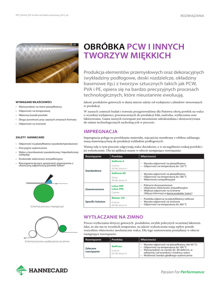 ROZWIĄZANIA APP_FilmFoil_PVC & other soft plastics processing_0415_po OBRÓBKA PCW I INNYCH TWORZYW MIĘKKICH Produkcja elementów przemysłowych oraz dekoracyjnych (wykładziny podłogowe, deski rozdzielcze, okładziny basenowe itp.) z tworzyw sztucznych takich jak PCW, PVA i PE, opiera się na bardzo precyzyjnych procesach technologicznych, które nieustannie ewoluują. WYMAGANE WŁAŚCIOWŚCI • Wytrzymałość na różne plastyfikatory • Odporność na temperaturę • Właściwy kształt powłoki • Długa żywotność przy częstych zmianach formatu • Odporność na ścieranie Jakość produktów gotowych w dużej mierze zależy od wydajności cylindrów stosowanych w produkcji. W naszych centrach badań i rozwoju przygotowaliśmy dla Państwa ofertę powłok na walce o wysokiej wydajności, przeznaczonych do produkcji folii, nadruku, wytłaczania oraz lakierowania. Gama naszych rozwiązań jest nieustannie udoskonalana i dostosowywana do zmian technologicznych zachodzących w procesie. IMPREGNACJA ZALETY HANNECARD • Odporność na plastyfikatory wysokotemperaturowe • Precyzyjne wykończenia • Walce o bombiastości parabolicznej i hiperbolicznej (wklęsłej) • Doskonałe właściwości antyadhezyjne Impregnacja polega na powlekaniu materiału, najczęściej membrany z włókna szklanego, masą stanowiącą bazę do produkcji wykładzin podłogowych. Ważną rolę w tym procesie odgrywają walce dociskowe, a w szczególności rodzaj powłoki i jej wykończenie. Dla tej aplikacji mamy w ofercie następujące rozwiązania: Rozwiązanie Powłoka GelForm-S • Rozwiązania łączące sprężystość elastomerów z chemiczną odpornością powłoki Teflon® Standardowe Zaawansowane Specific Solution Schemat procesu impregnacji Czarna 50-80 shore A GelForm-XP Właściwości • Wysoka odporność na plastyfikatory • Odporność na temperaturę do 120 °C Szara 40-80 shore A • Wysoka odporność na plastyfikatory • Odporność na temperaturę do 180 °C • Właściwości antyadhezyjne Lotus-FEP Lotus-PFA Czarna • Pokrycie dwuwarstwowe • Ulepszone właściwości antyadhezyjne • Większa odporność na ścieranie (Więcej informacji w karcie produktu ‘Lotus’) Meteor-CH • Powłoka odporna na plastyfikatory naftowe • Wysoka odporność na ścieranie • Odporność na temperaturę do 200 °C Czarna 60-80 shore A WYTŁACZANIE NA ZIMNO Proces wytłaczania dotyczy gotowych produktów, zwykle pokrytych wcześniej lakierem. Jako, że nie ma tu wysokich temperatur, na jakość wykończenia mają wpływ przede wszystkim właściwości mechaniczne walca. Dla tego zastosowania posiadamy w ofercie następujące rozwiązanie: Schemat procesu wytłaczania na zimno Rozwiązanie Zalecane rozwiązanie Powłoka GelPress Czarna 65-80 shore A Właściwości • Wysoka odporność na plastyfikatory (do 60 °C) • Odporność na temperaturę do 100 °C • Wytrzymałość na naciski do 80 daN/cm, w zależności od twardości I średnicy walca • Możliwość bardzo gładkiego wykończenia Passion For Performance KALANDROWANIE, LAMINOWNIE & WYTŁACZANIE NA GORĄCO W zależności od specyfiki produktu oraz rodzaju maszyny proponujemy Państwu zastosowanie następujących rozwiązań : Rozwiązanie Standardowe Powłoka Właściwości GelForm-S • Doskonała odporność na plastyfikatory • Odporność na temperaturę do 120 °C • Odporność na naciski do 50 daN/cm* Czarna 50-80 shore A GelForm-XP Zaawansowane Szara 40-80 shore A Schemat procesu laminacji Lotus-FEP Lotus-PFA Czarna Specjalistyczne Edelweiss Biała Meteor-CH Czarna 60-90 shore A * Schemat procesu kalandrowania • • • • Doskonała odporność na plastyfikatory Odporność na temperaturę do 180 °C Odporność na naciski do 30 daN/cm* Antyadhezyjne • • • • Powłoka dwuwarstwowa Ulepszone właściwości antyadhezyjne Odporność na naciski do 50 daN/cm* Podwyższona odporność na ścieranie (Więcej informacji w karcie produktu ‘Lotus’) • • • • Powłoka dwuwarstwowa Wysokie właściwości antyadhezyjne Twardość zewnętrznej warstwy 55 shore A Odporność na naciski do 15 daN/cm* (Więcej informacji w karcie produktu ‘Edelweiss’) • • • • Pokrycie odporne na plastyfikatory naftowe Wysoka odporność na ścieranie Odporność na naciski do 50 daN/cm* Odporność na temperaturę do 200 °C W zależności od średnicy walca NADRUK Najdoskonalszą techniką nadruku na wykładzinach podłogowych jest wklęsłodruk (rotograwiura). Do tego zastosowania posiadamy w ofercie powłoki na walce o różnorodnej twardości oraz rękawy stosowane w technologii NIPCO. Rozwiązanie Powłoka GelPrint-S Standardowe Zaawansowane Czarna/Szara 50 -80 shore A Lotus-FEP Lotus-PFA Czarna Właściwości • Wysoka odporność na rozpuszczalniki • Dobra równomierność docisku • Pokrycie dwuwarstwowe • Nie wchłania farby, łatwo się czyści (Więcej informacji w karcie produktu ‘Lotus’) POWLEKANIE - LAKIEROWANIE Dla sekcji powlekania końcowego oferujemy różne rozwiązania w zależności od technologii nakładania PCW, poliuretanu i innych warstw wierzchnich. W przypadku lakierowania podłoża strukturyzowanego, zalecamy używanie powłok o niskiej twardości lub powłok gąbczastych. Schemat procesu powlekania Rozwiązanie Powłoka MultiCoat-SB DODATKOWE INFORMACJE? Dokładniejsze informacje są dostępne u miejscowego przedstawiciela Hannecard i na stronie internetowej: www.hannecard.com Gumowe Czarna 35-65 shore A Monkal-4 Poliuretanowe Beżowy 40-65 shore A Właściwości • Wysoka odporność na rozpuszczalniki • Dobra równomierność docisku • Powłoka przeznaczona do lakierów wodnorozcienczalnych • Wysoka odpornośc na ścieranie • Doskonałe krycie oraz zwilżalność Passion For Performance