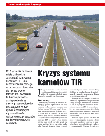 Pracodawca transportu drogowego Kryzys systemu karnetów TIR Od 1 grudnia br. Rosja miała całkowicie zaprzestać uznawania karnetów TIR, jako zabezpieczenia celnego w przewozach towarów ak się jednak okazało Rosjanie częściowo do i przez swoje wycofali się z zadeklarowanych wcześniej działań. Nie oznacza to jednak, że kryzys terytorium. Wywołało systemu karnetów TIR został zażegnany. to bardzo poważne Skąd karnety? zaniepokojenie ze Obecna sytuacja kształtuje się bowiem w nastrony przedsiębiorców stępujący sposób: w przewozach do Rosji centralnej realizowanych w tranzycie przez działających na tym Białoruś karnety TIR nadal mają być uznarynku, obawiających wane najprawdopodobniej do końca czerwca 2014 r. Jazda na karnetach TIR jest nadal się o możliwość możliwa przy wjeździe od strony Finlandii wykonywania przewozów i Turcji. Niestety wjazd pod zabezpieczeniem karnetem TIR od strony Łotwy, Estonii, na dotychczasowych Ukrainy oraz innych rosyjskich granic nie zasadach. będzie możliwy. W tym przypadku władze J celne Federacji Rosyjskiej żądają gwarancji 42 oferowanych przez wybrane rosyjskie firmy działające na zasadach komercyjnych i oferujących gwarancje i ubezpieczenia głównie na przejściach granicznych. Istnieją obawy, że takie gwarancje nie zabezpieczają w pełni interesów przewoźnika i mogą być wręcz niebezpieczne. Podnoszone jest, że w przypadku stosowania niektórych z tych gwarancji lub ubezpieczeń możliwe jest dochodzenie przez rosyjskie służby celne nieuiszczonych należności celnych od przewoźnika także w sytuacji przez niego niezawinionej. Ponieważ kryzys systemu karnetów TIR może poważnie zagrażać interesom polskiej gospodarki narodowej w sprawę tę zaangażowała się nasza administracja rządowa, a w szczególności Zbigniew Rynasiewicz, sekretarz stanu w Ministerstwie Infrastruktury i Rozwoju. Podejmowane są także działania na poziomie Komisji Europejskiej oraz Organizacji Narodów Zjednoczonych, a także IRU. Aktywne działania podejmuje na tym polu Zrzeszenie Międzynarodowych Przewoźników Drogowych, jako właściwa w sprawach Konwencji TIR organizacja polskich przewoźników wykonujących międzynarodowy transport drogowy. Także nasz związek zaanagażowany Ponieważ część członków Ogólnopolskiego Związku Pracodawców Transportu Drogowego wykonuje przewozy na kierunku Unia Europejska – Rosja, w sprawę kryzysu zaangażował się także nasz związek. Kolejno w dniach 28 listopada i następnie 4 grudnia br. przedstawiciele OZPTD, obok przedstawicieli ZMPD, brali udział w posiedzeniach rządowego sztabu kryzysowego kierowanego przez wspomnianego wyżej ministra Rynasiewicza. Na uwagę zasługuje fakt pełnej reprezentatywności sztabu ze strony administracji rządowej. W jego skład weszli przedstawiciele Ministerstwa Infrastruktury i Rozwoju, Ministerstwa Spraw Zagranicznych, Ministerstwa Gospodarki, Ministerstwa Finansów, Ministerstwa Spraw Wewnętrznych, Inspekcji Transportu Drogowego, Służby Celnej, Straży Granicznej i Policji. Sprawie kryzysu systemu karnetów TIR poświęcone było także posiedzenie Forum Transportu Drogowego w dniu 3 grudnia br., w którym ze strony administracji rządowej udział wzięli: dyrektor Departamentu Transportu Drogowego Łukasz Twardowski, dyrektor Biura Nadzoru GITD Michał Rzemieniewski, dyrektor BTM GITD Anna Brzezińska-Rybicka, dyrektor Departamentu Polityki Celnej w Ministerstwie Finansów Tomasz Michalak. W trakcie obrad forum po przedstawieniu sytuacji przez ZMPD rozpoczęła się dyskusja. W jej trakcie przedstawiciel OZPTD – dyrektor Biura Prawnego Maciej Wroński – zadeklarował pełne poparcie dla ustaleń podjętych przez Forum Transportu Drogowego, mających na celu przeciwdziałanie nielegalnym z punktu widzenia prawa międzynarodowego ograniczeniom wprowadzanym przez władze rosyjskie w zakresie stosowania Konwencji TIR. Zdaniem związku przewoźnik powinien mieć możliwość stosowania wszelkich legalnych i korzystnych z jego punktu widzenia zabezpieczeń celnych przewidzianych prawem międzynarodowy. Po burzliwej dyskusji uczestnicy forum postanowili m. in.: • Zwrócić się do Inspekcji Transportu Drogowego, Policji, Straży Granicznej i Służby Celnej o rozpoczęcie zintensyfikowanych kontroli przestrzegania prawa przez przewoźników rosyjskich. • Skierować apel do ministra infrastruktury i rozwoju Elżbiety Bieńkowskiej, aby zwróciła się do min. Szuwałowa o wyegzekwowanie ustaleń dotyczących funkcjonowania Konwencji TIR. • Zaapelować do International Road Transport Union o zintensyfikowanie działań w sprawie zażegnania kryzysu systemu TIR. • Wystąpić do Komisji Europejskiej w UE o ochronę Konwencji TIR. List do wicepremier Niezależnie od wspólnych działań podejmowanych wspólnie z ZMPD i z innymi organizacjami przewoźników, przewodniczący OZPTD Bolesław Milewski w dniu 2 grudnia br. wystosował pismo w tej sprawie do Elżbiety Bieńkowskiej, wiceprezesa Rady Ministrów. W swoim wystąpieniu przewodniczący Milewski zaznaczył, że choć od strony formalnej utrudnienia dotyczą wyłącznie kwestii celnych a nie transportowych, to faktycznie Federacja Rosyjska uniemożliwia polskim firmom transportowym wykonywanie międzynarodowego transportu drogowego do, z i przez terytorium Rosji, zgodnie z zawartą polsko-rosyjską dwustronną umową o międzynarodowym przewozie drogowym. W piśmie wskazano także, że polskim przewoźnikom brakuje rzetelnej i pełnej informacji. Brak tej informacji, a także jednostronne i nieprzewidywalne działania strony rosyjskiej uniemożliwiają naszym przedsiębiorcom planowanie przewozów, wykonywanie długoterminowych umów przewozowych, przyjmowanie zleceń i określanie stawek frachtów, które uwzględniałyby wymagane i dostępne na terenie Federacji Rosyjskiej sposoby zabezpieczenia należności celnych. Maciej Wroński dyrektor Biura Prawnego OZPT