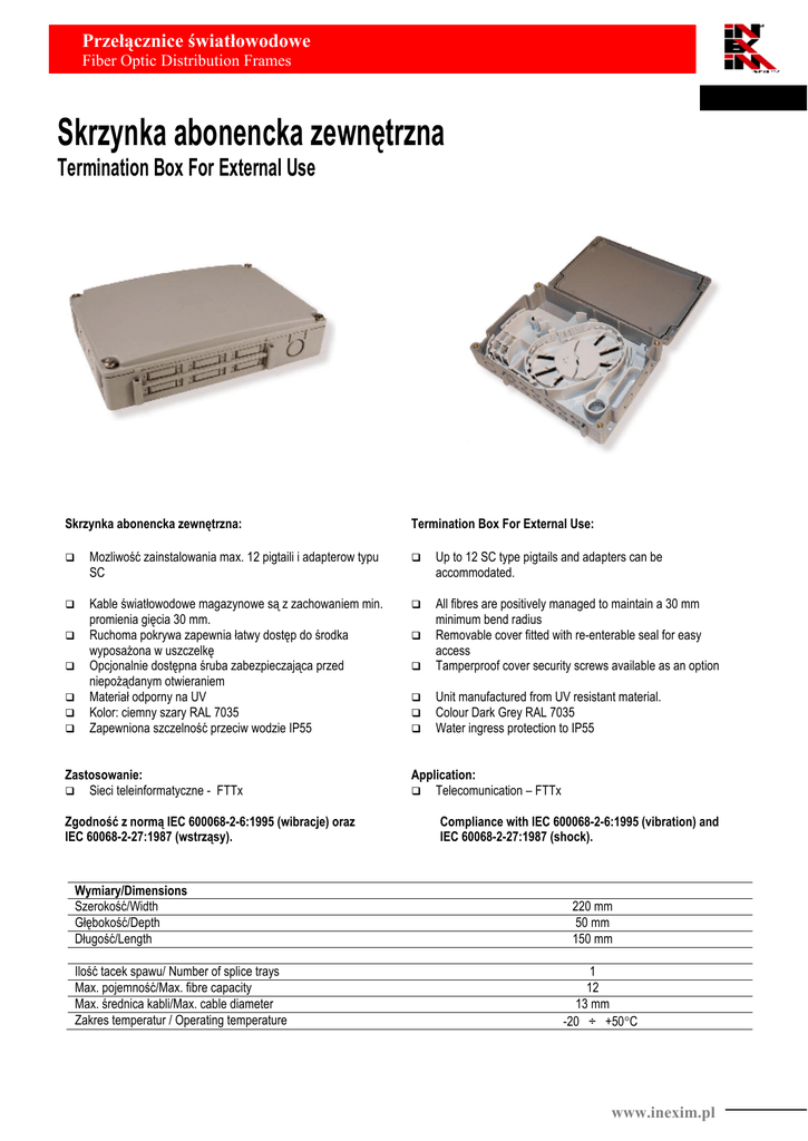 Przełącznice światłowodowe Fiber Optic Distribution Frames Skrzynka abonencka zewnętrzna Termination Box For External Use Skrzynka abonencka zewnętrzna: Termination Box For External Use: Mozliwość zainstalowania max. 12 pigtaili i adapterow typu SC Up to 12 SC type pigtails and adapters can be accommodated. Kable światłowodowe magazynowe są z zachowaniem min. promienia gięcia 30 mm. Ruchoma pokrywa zapewnia łatwy dostęp do środka wyposaŜona w uszczelkę Opcjonalnie dostępna śruba zabezpieczająca przed niepoŜądanym otwieraniem Materiał odporny na UV Kolor: ciemny szary RAL 7035 Zapewniona szczelność przeciw wodzie IP55 All fibres are positively managed to maintain a 30 mm minimum bend radius Removable cover fitted with re-enterable seal for easy access Tamperproof cover security screws available as an option Unit manufactured from UV resistant material. Colour Dark Grey RAL 7035 Water ingress protection to IP55 Zastosowanie: Sieci teleinformatyczne - FTTx Zgodność z normą IEC 600068-2-6:1995 (wibracje) oraz IEC 60068-2-27:1987 (wstrząsy). Wymiary/Dimensions Szerokość/Width Głębokość/Depth Długość/Length Ilość tacek spawu/ Number of splice trays Max. pojemność/Max. fibre capacity Max. średnica kabli/Max. cable diameter Zakres temperatur / Operating temperature Application: Telecomunication – FTTx Compliance with IEC 600068-2-6:1995 (vibration) and IEC 60068-2-27:1987 (shock). 220 mm 50 mm 150 mm 1 12 13 mm -20 ÷ +50°C www.inexim.pl