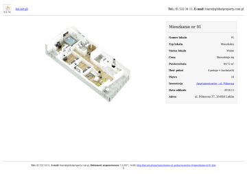 luk.net.pl Tel.: 81 532 34 11, E-mail: [email protected] Mieszkanie nr 91 Numer lokalu 91 Typ lokalu Mieszkalny Status lokalu Wolne Cena Skonaktuje się Powierzchnia Ilość pokoi 84.72 m2 4 pokoje + kuchnia(4) Piętro Inwestycja 10 Apartamentowiec - ul. Północna Data oddania Adres 2018-11 ul. Północna 37, 20-064 Lublin Tel.: 81 532 34 11, E-mail: [email protected], Dokument wygenerowano 7.3.2017, 14:09, http://luk.net.pl/apartamentowiec-ul.-polnocna-pietro-10-mieszkanie-nr-91.htm 1 Tel.: 81 532 34 11, E-mail: luk.net.pl [email protected] RZUT TECHNICZNY LOKALU Tel.: 81 532 34 11, E-mail: [email protected], Dokument wygenerowano 7.3.2017, 14:09, http://luk.net.pl/apartamentowiec-ul.-polnocna-pietro-10-mieszkanie-nr-91.htm 2 Tel.: 81 532 34 11, E-mail: [email protected] luk.net.pl RZUT TECHNICZNY KONDYGNACJI Tel.: 81 532 34 11, E-mail: [email protected], Dokument wygenerowano 7.3.2017, 14:09, http://luk.net.pl/apartamentowiec-ul.-polnocna-pietro-10-mieszkanie-nr-91.htm 3 Tel.: 81 532 34 11, E-mail: [email protected] luk.net.pl OPIS INWESTYCJI Miło nam poinformować, iż ruszyła nasza kolejna wyjątkowa inwestycja. Rozpoczęliśmy sprzedaż wspaniałych mieszkań w apartamentowcu położonym przy ul. Północnej w Lublinie. Ze względu na swoją fantastyczną lokalizację blisko centrum apartamenty cieszą się ogromnym zainteresowaniem. Warto się śpieszyć w swoich decyzjach. Sprzedaż mieszkań już trwa. Zapraszamy do kontaktu z naszym biurem. SZCZEGÓŁY Nowoczesny budynek o niskim zapotrzebowaniu energetycznym < 90kWh/m2/rok, z oświetleniem ledowym na klatkach schodowych i w garażu. Obiekt będzie miał unikalną, jak na warunki lubelskie infrastrukturę. Na parterze budynku zlokalizowana będzie siłownia, a na zewnątrz budynku park z kortem tenisowym i placem zabaw. Atrakcyjności dodaje położenie inwestycji z jednej strony bliskość ścisłego Centrum i Starego Miasta, a z drugiej Uniwersytetu Medycznego. Tel.: 81 532 34 11, E-mail: [email protected], Dokument wygenerowano 7.3.2017, 14:09, http://luk.net.pl/apartamentowiec-ul.-polnocna-pietro-10-mieszkanie-nr-91.htm 4 Tel.: 81 532 34 11, E-mail: [email protected] luk.net.pl LOKALIZACJA Tel.: 81 532 34 11, E-mail: [email protected], Dokument wygenerowano 7.3.2017, 14:09, http://luk.net.pl/apartamentowiec-ul.-polnocna-pietro-10-mieszkanie-nr-91.htm 5