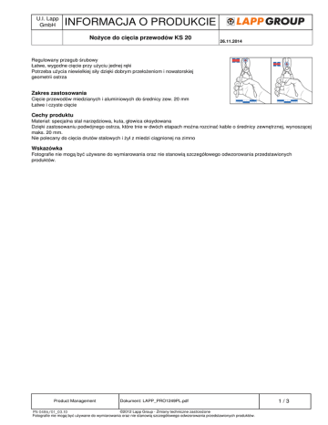 U.I. Lapp GmbH INFORMACJA O PRODUKCIE Nożyce do cięcia przewodów KS 20 26.11.2014 Regulowany przegub śrubowy Łatwe, wygodne cięcie przy użyciu jednej ręki Potrzeba użycia niewielkiej siły dzięki dobrym przełożeniom i nowatorskiej geometrii ostrza Zakres zastosowania Cięcie przewodów miedzianych i aluminiowych do średnicy zew. 20 mm Łatwe i czyste cięcie Cechy produktu Materiał: specjalna stal narzędziowa, kuta, głowica oksydowana Dzięki zastosowaniu podwójnego ostrza, które tnie w dwóch etapach można rozcinać kable o średnicy zewnętrznej, wynoszącej maks. 20 mm. Nie polecany do cięcia drutów stalowych i żył z miedzi ciągnionej na zimno Wskazówka Fotografie nie mogą być używane do wymiarowania oraz nie stanowią szczegółowego odwzorowania przedstawionych produktów. Product Management Dokument: LAPP_PRO1249PL.pdf ©2012 Lapp Group - Zmiany techniczne zastrzeżone PN 0486/01_03.10 Fotografie nie mogą być używane do wymiarowania oraz nie stanowią szczegółowego odwzorowania przedstawionych produktów. 1/3 Powered by TCPDF (www.tcpdf.org) Do średnicy zewnętrznej [mm] Waga [kg] Długość [mm] Liczba sztuk w opakowaniu 62120045 KS 20 20.0 0.3 200 1 INFORMACJA O PRODUKCIE Dokument: LAPP_PRO1249PL.pdf Nożyce do cięcia przewodów KS 20 Product Management U.I. Lapp GmbH Oznaczenie wyrobu 26.11.2014 ©2012 Lapp Group - Zmiany techniczne zastrzeżone PN 0486/01_03.10 Fotografie nie mogą być używane do wymiarowania oraz nie stanowią szczegółowego odwzorowania przedstawionych produktów. Numer artykułu 2/3 Powered by TCPDF (www.tcpdf.org) U.I. Lapp GmbH INFORMACJA O PRODUKCIE Nożyce do cięcia przewodów KS 20 Product Management 26.11.2014 Dokument: LAPP_PRO1249PL.pdf ©2012 Lapp Group - Zmiany techniczne zastrzeżone PN 0486/01_03.10 Fotografie nie mogą być używane do wymiarowania oraz nie stanowią szczegółowego odwzorowania przedstawionych produktów. 3/3