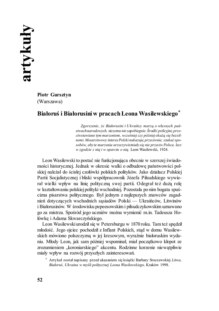 artykuły Piotr Gursztyn (Warszawa) Białoruś i Białorusini w pracach Leona Wasilewskiego* Zgorszenie, że Białorusini i U kraińcy marzą o własnych państwach narodowych, niczemu nie zapobiegnie. Środki policyjne, przeciwstawiane tym marzeniom, wcześniej czy później okażą się bezsilnemi. Mocarstwowy interes Polski nakazuje, przeciwnie, szukać sposobów, aby te marzenia urzeczywistniały się nie przeciw Polsce, lecz w zgodzie z nią i w oparciu o nią. Leon Wasilewski, 1924. Leon Wasilewski to postać nie funkcjonująca obecnie w szerszej świadomości historycznej. Jednak w okresie walki o odbudowę państwowści polskiej należał do ścisłej czołówki polskich polityków. Jako działacz Polskiej Partii Socjalistycznej i bliski współpracownik Józefa Piłsudskiego wywierał wielki wpływ na linię polityczną swej partii. Odegrał też dużą rolę w kształtowaniu polskiej polityki wschodniej. Pozostała po nim bogata spuścizna pisarstwa politycznego. Był jednym z najlepszych znawców zagadnień dotyczących wschodnich sąsiadów Polski — Ukraińców, Litwinów i Białorusinów. W środowisku pepeesowskim i piłsudczykowskim uznawano go za mistrza. Spośród jego uczniów można wymienić m.in. Tadeusza Hołówkę i Adama Skwarczyńskiego. Leon Wasilewski urodził się w Petersburgu w 1870 roku. Tam też spędził młodość. Jego ojciec pochodził z Inflant Polskich, stąd w domu Wasilewskich mówiono polszczyzną w jej kresowym, wyraźnie białoruskim wydaniu. Młody Leon, jak sam później wspominał, miał początkowo kłopot ze zrozumieniem „koroniarskiego” akcentu. Rodzinne korzenie niewątpliwie miały wpływ na rozwój przyszłych zainteresowań. * 52 Artykuł został napisany przed ukazaniem się książki Barbary Stoczewskiej Litwa, Białoruś, Ukraina w myśli politycznej Leona Wasilewskiego, Kraków 1998. W 1893 roku Wasilewski wyjechał do Galicji, gdzie, po krótkim epizodzie przynależności do Ligi Narodowej, wstąpił do PPS. Poznał wtedy Towarzysza Wiktora — Józefa Piłsudskiego, którego współpracownikiem pozostał na całe życie. Parę lat spędził w Londynie, wydając tam „Przedświt”. Później osiadł w Galicji, gdzie zajmował się redagowaniem „Robotnika”. Po rozłamie w PPS pozostał w grupie „starych” tworzących Frakcję Rewolucyjną. Przed I wojną światową włączył się do działalności wojskowej Józefa Piłsudskiego. Był członkiem Komisji Tymczasowej Skonfederowanych Stronnictw Niepodległościowych i Polskiego Skarbu Wojskowego. W czasie wojny pracował w Naczelnym Komitecie Narodowym, od 1917 r. należał do Polskiej Organizacji Wojskowej. W listopadzie 1918 roku Wasilewski został mianowany ministrem spraw zagranicznych w rządzie Jędrzeja Moraczewskiego. Po dymisji tego rządu wyjechał do Paryża, by uczestniczyć w pracach Komitetu Narodowego Polskiego. W latach 1920-21 był posłem RP w Estonii. Później brał udział w negocjacjach pokojowych z Rosją Sowiecką w Rydze. P o zawarciu pokoju szefował polskiej komisji do spraw delimitacji granicy wschodniej. W niepodległej Rzeczypospolitej zajmował się głównie pracą naukową — w 1924 r. został prezesem Instytutu Badania Najnowszej Historii Polski, pięć lat później założył pismo „Niepodległość”, wydawał pisma i korespondencje Józefa Piłsudskiego, od 1931 był prezesem Instytutu Badań Narodowościowych. Nadal działał w PPS, w 1931 został wiceprezesem Rady Naczelnej partii. Zmarł w Warszawie w 1936 roku. Obraz wschodnich sąsiadów Polski — Białorusi, Ukrainy i Litwy — w pismach Leona Wasilewskiego cechuje dbałość o obiektywizm i rzeczowość. Trudno tam znaleźć ślady szowinizmu, choć przedstawiony tam został niewątpliwie punkt widzenia polskiego działacza niepodległościowego. O Białorusi Wasilewski pisał sporo, choć nie tyle, co o kwestii ukraińskiej, czy nawet litewskiej. Stopień zainteresowania był wyraźnie związany z siłą, jaką reprezentowały poszczególne ruchy narodowe. Białoruś była widziana przez Wasilewskiego (szczególnie przed I wojną światową) jako część Litwy „historycznej”, tj. teren byłego Wielkiego Księstwa Litewskiego. Wielokrotnie zaznaczał, że chodzi mu o Litwę „historyczną”, bądź tylko jej część — Białoruś lub Litwę „etnograficzną”1 . Zdaniem Wasilewskiego spośród trzech głównych grup narodowych zamieszkujących byłe Wielkie Księstwo — Białorusinów, Litwinów i Polaków (Rosjan pomijał, traktując ich jako element napływowy) — Białorusini, choć najliczniejsi, nie odgrywali tam znaczącej roli. Słabość ta, według autora, miała wiele przyczyn — jedną z podstawowych Wasilewski widział w ogromnym podobieństwie języka białoruskiego do języków sąsiednich 1 L. Wasilewski, Litwa i Białoruś. Przeszłość — Teraźniejszość — Tendencje rozwojowe, Kraków 1912, s. 111. 53 — rosyjskiego i polskiego. Czynnik ten powodował szybką asymilację Białorusinów, szczególnie wykształconych (katolicy polonizowali się, prawosławni ruszczyli). To niewątpliwie utrudniało powstanie własnych elit. Również lud białoruski zamieszkujący pogranicza etniczne był narażony na wynarodowienie. Podobieństwo językowe, jako przyczyna asymilacji, było tym bardziej widoczne po porównaniu sytuacji Białorusinów z rozwojem litewskiego ruchu narodowego, który korzystał ze swoistego atutu, jakim była odrębność języka litewskiego. Ruch białoruski, gdy porównywało się z nim aktywność sąsiednich narodów — ukraińskiego i litewskiego — prezentował się mizernie. Wasilewski twierdził (jeszcze przed I wojną światową), że nie istniała de facto literatura białoruska. Po rewolucji 1905 roku szkolnictwo białoruskie ledwie wegetowało, organizacje polityczne były słabe i pozbawione realnego poparcia społeczeństwa. To wszystko powodowało, że Wasilewski nie widział wtedy poważniejszych persp