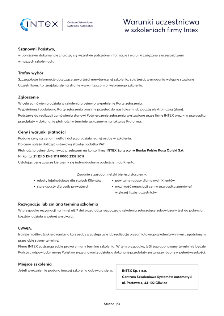 Warunki uczestnicwa Centrum Szkoleniowe Systemów Automatyki w szkoleniach firmy Intex Szanowni Państwo, w poniższym dokumencie znajdują się wszystkie potrzebne informacje i warunki związane z uczestnictwem w naszych szkoleniach. Trafny wybór Szczegółowe informacje dotyczące zawartości merytorycznej szkolenia, spis treści, wymagania wstępne stawiane Uczestnikom, itp. znajdują się na stronie www.intex.com.pl wybranego szkolenia. Zgłoszenie W celu zamówienia udziału w szkoleniu prosimy o wypełnienie Karty zgłoszenia. Wypełnioną i podpisaną Kartę zgłoszenia prosimy przesłać do nas faksem lub pocztą elektroniczną (skan). Podstawę do realizacji zamówienia stanowi Potwierdzenie zgłoszenia wystawione przez firmę INTEX oraz – w przypadku przedpłaty – dokonanie płatności w terminie wskazanym na fakturze Proforma. Ceny i warunki płatności Podane ceny są cenami netto i dotyczą udziału jednej osoby w szkoleniu. Do ceny należy doliczyć ustawową stawkę podatku VAT. Płatności prosimy dokonywać przelewem na konto firmy INTEX Sp. z o.o. w Banku Polska Kasa Opieki S.A. Nr konta: 21 1240 1343 1111 0000 2337 5017 Ustalając cenę zawsze kierujemy się indywidualnym podejściem do Klienta. Zgodnie z zasadami etyki biznesu stosujemy: • rabaty lojalnościowe dla stałych Klientów • powitalne rabaty dla nowych Klientów • stałe upusty dla osób prywatnych • możliwość negocjacji cen w przypadku zamówień większej liczby uczestnictw Rezygnacja lub zmiana terminu szkolenia W przypadku rezygnacji na mniej niż 7 dni przed datą rozpoczęcia szkolenia zgłaszający zobowiązany jest do pokrycia kosztów udziału w pełnej wysokości. UWAGA: Istnieje możliwość skierowania na kurs osoby w zastępstwie lub realizacja przedmiotowego szkolenia w innym uzgodnionym przez obie strony terminie. Firma INTEX zastrzega sobie prawo zmiany terminu szkolenia. W tym przypadku, jeśli zaproponowany termin nie będzie Państwu odpowiadał, mogą Państwo zrezygnować z udziału, a dokonane przedpłaty zostaną zwrócone w pełnej wysokości. Miejsce szkolenia Jeżeli wyraźnie nie podano inaczej szkolenia odbywają się w: INTEX Sp. z o.o. Centrum Szkoleniowe Systemów Automatyki ul. Portowa 4, 44-102 Gliwice Strona 1/3 Warunki uczestnicwa Centrum Szkoleniowe Systemów Automatyki w szkoleniach firmy Intex Dojazd i zakwaterowanie INTEX mieści się w wydzielonej części hotelu MALINOWSKI. Na III piętrze - wejście przez recepcję hotelu. W celu ułatwienia wyboru zakwaterowania oraz ustalenia trasy dojazdu zachęcamy do skorzystania z listy polecanych hoteli gliwickich i planu dojazdu. Ze względu na lokalizację naszej firmy szczególnie polecamy zakwaterowanie w hotelu „MALINOWSKI”. Dla Klientów INTEX bardzo atrakcyjne ceny za nocleg oraz rabat na usługi restauracyjne. Koszty dojazdu i zakwaterowania oraz częściowego wyżywienia (śniadanie i kolacja) pokrywa Uczestnik we własnym zakresie. Dokumentacja szkoleniowa Na wszystkich naszych szkoleniach zapewniamy obszerną i przejrzystą dokumentację szkoleniową w języku polskim. Uczestnicy wybranych szkoleń po ich zakończeniu otrzymują dodatkowo wzorcowe rozwiązania zadań. Bezpłatne zajęcia dodatkowe Na większości szkoleń oferujemy możliwość bezpłatnego udziału w zajęciach dodatkowych od poniedziałku do czwartku w godzinach 16.00 – 18.00. Uczestnik zajęć dodatkowych może samodzielnie ćwiczyć oraz powtarzać zagadnienia omawiane na szkoleniu lub indywidualnie skorzystać z pomocy wykładowcy Wyżywienie Każdego dnia szkolenia zapewniamy obiad z deserem w restauracji PORTOWA w hotelu MALINOWSKI oraz ciepłe i zimne napoje w naszej kawiarni otwartej w godzinach trwania szkolenia. System ocen Nasz wewnętrzny, elektroniczny system ankietowania wspomaga nadzorowanie jakości wszystkich prowadzonych szkoleń. W ankiecie wypełnianej na rozpoczęcie szkolenia prosimy Uczestnika o informacje na temat posiadanej wiedzy i doświadczenia w zakresie tematycznym szkolenia. Po zakończeniu szkolenia Uczestnik ocenia umiejętności zdobyte w trakcie kursu, zakres merytoryczny, dokumentację, organizację szkolenia i sposób prowadzenia zajęć. Zebrane dane służą wyłącznie doskonaleniu jakości naszych szkoleń i nie będą przekazywane osobom trzecim. Zaświadczenie o uczestnictwie w szkoleniu Wszyscy uczestnicy szkoleń po ich zakończeniu otrzymują dwujęzyczne (polsko-angielskie) Zaświadczenia o uczestnictwie w szkoleniu. Wyjątek stanowią szkolenia zgodne z wymogami PROFIBUS&PROFINET INTERNATIONAL (PI), które kończą się egzaminem teoretycznym i praktycznym. Zdanie egzaminu potwierdzane jest certyfikatem wydanym przez PI i umożliwia posługiwanie się logo CERTIFIED EXPERT oraz wpisanie na listę certyfikowanych inżynierów/instalatorów. Strona 2/3 Warunki uczestnicwa Centrum Szkoleniowe Systemów Automatyki w szkoleniach firmy Intex Informacje dodatkowe: • na większości szkoleń gwarantujemy indywidualne stanowiska pracy dla każdego uczestnika. • Na pozostałych szkoleniach zapewniamy dwuosobowe stanowiska szkoleniowe (nie dotyczy szkoleń jednodniowych i/lub warsztatów) • szkolenia prowadzone są przez zespół doświadczonych wykładowców wywodzących się z działów utrzymania ruchu renomowanych firm, integratorów systemów oraz uczelni technicznych • dopuszcza się realizację szkolenia przez podmioty trzecie wskazane przez INTEX • dzięki dużej ilości ćwiczeń zapewniamy zdobycie umiejętności praktycznych, jakich oczekuje nowoczesny przemysł • szkolenia odbywają się w siedzibie INTEX, gdzie do dyspozycji kursantów oddajemy nowoczesne sale szkoleniowe wyposażone w profesjonalny sprzęt oraz wszelkie niezbędne pomoce dydaktyczne, dokumentacje szkoleniową i materiały biurowe • system kształcenia INTEX opiera się na modularnej koncepcji szkoleń umożliwiającej rozpoczęcie nauki w zależności od poziomu posiadanej wiedzy. Materiały dod