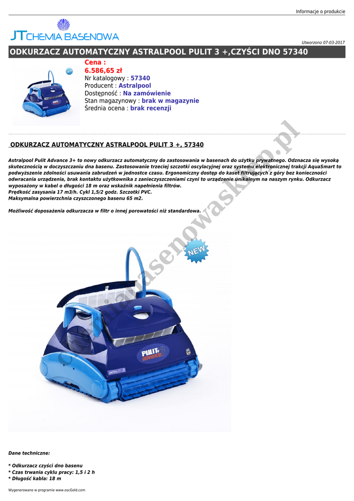 Informacje o produkcie Utworzono 07-03-2017 ODKURZACZ AUTOMATYCZNY ASTRALPOOL PULIT 3 +,CZYŚCI DNO 57340 Cena : 6.586,65 zł .p l Nr katalogowy : 57340 Producent : Astralpool Dostępność : Na zamówienie Stan magazynowy : brak w magazynie Średnia ocena : brak recenzji kl ep ODKURZACZ AUTOMATYCZNY ASTRALPOOL PULIT 3 +, 57340 as Astralpool Pulit Advance 3+ to nowy odkurzacz automatyczny do zastosowania w basenach do użytku prywatnego. Odznacza się wysoką skutecznością w doczyszczaniu dna basenu. Zastosowanie trzeciej szczotki oscylacyjnej oraz systemu elektronicznej trakcji AquaSmart to podwyższenie zdolności usuwania zabrudzeń w jednostce czasu. Ergonomiczny dostęp do kaset filtrujących z góry bez konieczności odwracania urządzenia, brak kontaktu użytkownika z zanieczyszczeniami czyni to urządzenie unikalnym na naszym rynku. Odkurzacz wyposażony w kabel o długości 18 m oraz wskaźnik napełnienia filtrów. Prędkość zasysania 17 m3/h. Cykl 1,5/2 godz. Szczotki PVC. Maksymalna powierzchnia czyszczonego basenu 65 m2. ch em ia ba se no w Możliwość doposażenia odkurzacza w filtr o innej porowatości niż standardowa. Dane techniczne: * Odkurzacz czyści dno basenu * Czas trwania cyklu pracy: 1,5 i 2 h * Długość kabla: 18 m Wygenerowano w programie www.oscGold.com em ia ba se no w as kl ep .p l Prędkość zasysania: 17 m3/h Szczotki czyszczące: PVC Dodatkowy system doczyszczania: Szczotki oscylacyjne Napięcie pracy silnika: 24V DC Dane elektryczne: 100-259 V/50-60 Hz/210W Waga: 17 kg Gwarancja: 24 m-ce ch * * * * * * *