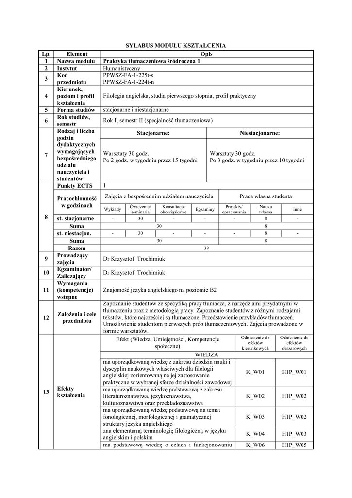Lp. 1 2 3 4 5 6 7 Element Nazwa modułu Instytut Kod przedmiotu Kierunek, poziom i profil kształcenia Forma studiów Rok studiów, semestr Rodzaj i liczba godzin dydaktycznych wymagających bezpośredniego udziału nauczyciela i studentów Punkty ECTS Pracochłonność w godzinach 8 9 10 11 st. stacjonarne Suma st. niestacjon. Suma Razem Prowadzący zajęcia Egzaminator/ Zaliczający Wymagania (kompetencje) wstępne 12 Założenia i cele przedmiotu 13 Efekty kształcenia SYLABUS MODUŁU KSZTAŁCENIA Opis Praktyka tłumaczeniowa śródroczna 1 Humanistyczny PPWSZ-FA-1-225t-s PPWSZ-FA-1-224t-n Filologia angielska, studia pierwszego stopnia, profil praktyczny stacjonarne i niestacjonarne Rok I, semestr II (specjalność tłumaczeniowa) Stacjonarne: Niestacjonarne: Warsztaty 30 godz. Po 2 godz. w tygodniu przez 15 tygodni Warsztaty 30 godz. Po 3 godz. w tygodniu przez 10 tygodni 1 Zajęcia z bezpośrednim udziałem nauczyciela Wykłady - Ćwiczenia/ seminaria 30 Konsultacje obowiązkowe - Praca własna studenta Egzaminy Projekty/ opracowania - - 30 - 30 Nauka własna 8 Inne - 8 - - 30 - 8 - 8 38 Dr Krzysztof Trochimiuk Dr Krzysztof Trochimiuk Znajomość języka angielskiego na poziomie B2 Zapoznanie studentów ze specyfiką pracy tłumacza, z narzędziami przydatnymi w tłumaczeniu oraz z metodologią pracy. Zapoznanie studentów z różnymi rodzajami tekstów, które najczęściej są tłumaczone. Przedstawienie przykładów tłumaczeń. Umożliwienie studentom pierwszych prób tłumaczeniowych. Zajęcia prowadzone w formie warsztatów. Odniesienie do Odniesienie do Efekt (Wiedza, Umiejętności, Kompetencje efektów efektów społeczne) kierunkowych obszarowych WIEDZA ma uporządkowaną wiedzę z zakresu dziedzin nauki i dyscyplin naukowych właściwych dla filologii K_W01 H1P_W01 angielskiej zorientowaną na jej zastosowanie praktyczne w wybranej sferze działalności zawodowej ma uporządkowaną wiedzę podstawową z zakresu literaturoznawstwa, językoznawstwa, K_W02 H1P_W02 kulturoznawstwa oraz przekładoznawstwa ma uporządkowaną wiedzę podstawową na temat fonologicznej, morfologicznej i gramatycznej K_W03 H1P_W02 struktury języka angielskiego zna elementarną terminologię filologiczną w języku K_W04 H1P_W03 angielskim i polskim ma podstawową wiedzę o celach i funkcjonowaniu K_W06 H1P_W05 instytucji związanych z działalnością zawodową filologa ma podstawową wiedzę o prawnych i ekonomicznych uwarunkowaniach funkcjonowania instytucji związanych z działalnością zawodową filologa ma podstawową wiedzę o metodyce wykonywania zadań, normach, procedurach i dobrych praktykach stosowanych w obszarach działalności związanej ze specjalnością studiów ma podstawową wiedzę na temat diagnozowania potrzeb odbiorców usług świadczonych zgodnie ze specjalnością studiów. Ma wiedzę z zakresu oceny jakości świadczonych usług zna i rozumie podstawowe pojęcia i zasady z zakresu ochrony własności intelektualnej, technologii informacyjnej i prawa autorskiego UMIEJĘTNOŚCI potrafi wyszukiwać, analizować, oceniać, selekcjonować i użytkować informacje z zakresu filologii angielskiej z wykorzystaniem różnych źródeł i sposobów umie samodzielnie zdobywać wiedzę, doskonalić umiejętności profesjonalne związane z wybranym obszarem działalności zawodowej odnoszącej się do specjalności studiów w typowych sytuacjach zawodowych potrafi samodzielnie planować i realizować projekty związane z wybraną działalnością zawodową filologa posiada podstawowe umiejętności organizacyjne pozwalające na planowanie i realizację zadań związanych ze specjalnością zawodową potrafi zdiagnozować potrzeby odbiorców usług świadczonych przez filologa (np. nauczyciela, tłumacza) i przeprowadzić badania społeczne niezbędne do opracowania diagnoz posiada umiejętności i kompetencje niezbędne do oceny jakości usług związanych ze swoją działalnością zawodową potrafi w podstawowym zakresie stosować przepisy prawa odnoszącego się do instytucji związanych z wybraną sferą działalności zawodowej, w szczególności ochrony własności intelektualnej potrafi dobrać i zastosować odpowiednie metody i procedury do realizacji wybranych zadań i rozwiązywania ewentualnych problemów pojawiających się w pracy zawodowej filologa ma podstawowe umiejętności tłumaczeń pisemnych i ustnych K_W07 H1P_W06 K_W08 H1P_W07 K_W09 H1P_W08 K_W11 H1P_W10 K_U01 H1P_U01 K_U02 H1P_U02 K_U03 H1P_U03 K_U04 H1P_U04 K_U05 H1P_U05 K_U06 H1P_U06 K_U07 H1P_U07 K_U09 H1P_U09 K_U13 H1P_U03 H1P_U11 H1P_U12 H1P_U13 KOMPETENCJE SPOŁECZNE rozumie konieczność rozwoju zawodowego i K_K01 osobistego przez całe życie potrafi współdziałać i pracować w grupie, przyjmując K_K02 w niej różne role prawidłowo identyfikuje i rozstrzyga dylematy K_K04 związane z wykonywaniem zawodu uczestniczy w życiu kulturalnym, korzystając z K_K06 H1P_K01 H1P_K02 H1P_K04 H1P_K06 różnych mediów i różnych jego form; potrafi świadomie wybrać odpowiednie dla swoich zainteresowań oraz istotne w pracy zawodowej obszary i formy kultury 14 Forma i warunki potwierdzenia efektu kształcenia Efekt kształcenia Wiedza Umiejętności Kompetencje społeczne 15 16 17 18 19 Sposób potwierdzenia (weryfikacji) Zapisy w dzienniku praktyk, arkusze z tłumaczeniami studentów. Zapisy w dzienniku praktyk, arkusze z tłumaczeniami studentów. Obserwacja, konsultacje Stosowane metody dydaktyczne Metoda podawcza, praca indywidualna, praca w parach, praca w grupach. Treści merytoryczne przedmiotu 1. Specyfika pracy tłumacza. 2. Narzędzia przydatne w tłumaczeniu. 3. Metodologia pracy tłumacza (rozpoznanie rodzaju tekstu, zapoznanie się z zagadnieniem zawartym w tekście do tłumaczenia, przygotowanie narzędzi wspierających tłumaczenie, rozpoczęcie tłumaczenia, odpoczynek, weryfikacja poprawności tłumaczenia). 4. Rodzaje tekstów, które najczęściej są tłumaczone. 5. Przedstawienie i om