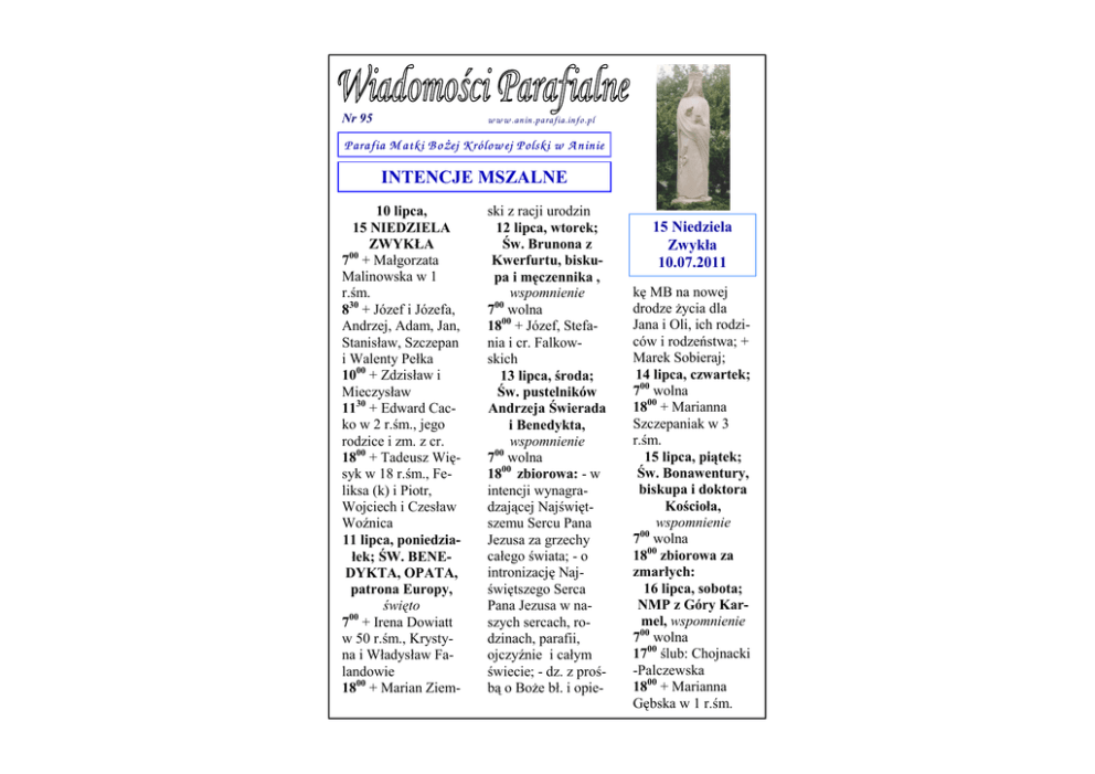 Nr 95 w w w .anin.parafia.info.pl Parafia M atki Bożej K rólow ej Polski w A ninie INTENCJE MSZALNE 10 lipca, 15 NIEDZIELA ZWYKŁA 700 + Małgorzata Malinowska w 1 r.śm. 830 + Józef i Józefa, Andrzej, Adam, Jan, Stanisław, Szczepan i Walenty Pełka 1000 + Zdzisław i Mieczysław 1130 + Edward Cacko w 2 r.śm., jego rodzice i zm. z cr. 1800 + Tadeusz Więsyk w 18 r.śm., Feliksa (k) i Piotr, Wojciech i Czesław Woźnica 11 lipca, poniedziałek; ŚW. BENEDYKTA, OPATA, patrona Europy, święto 700 + Irena Dowiatt w 50 r.śm., Krystyna i Władysław Falandowie 1800 + Marian Ziem- ski z racji urodzin 12 lipca, wtorek; Św. Brunona z Kwerfurtu, biskupa i męczennika , wspomnienie 700 wolna 1800 + Józef, Stefania i cr. Falkowskich 13 lipca, środa; Św. pustelników Andrzeja Świerada i Benedykta, wspomnienie 700 wolna 1800 zbiorowa: - w intencji wynagradzającej Najświętszemu Sercu Pana Jezusa za grzechy całego świata; - o intronizację Najświętszego Serca Pana Jezusa w naszych sercach, rodzinach, parafii, ojczyźnie i całym świecie; - dz. z prośbą o Boże bł. i opie- 15 Niedziela Zwykła 10.07.2011 kę MB na nowej drodze życia dla Jana i Oli, ich rodziców i rodzeństwa; + Marek Sobieraj; 14 lipca, czwartek; 700 wolna 1800 + Marianna Szczepaniak w 3 r.śm. 15 lipca, piątek; Św. Bonawentury, biskupa i doktora Kościoła, wspomnienie 700 wolna 1800 zbiorowa za zmarłych: 16 lipca, sobota; NMP z Góry Karmel, wspomnienie 700 wolna 1700 ślub: Chojnacki -Palczewska 1800 + Marianna Gębska w 1 r.śm. Liturgia Słowa Bożego Iz 55,10-11 Na żyznej ziemi ziarno wyda plony Rz 8,18-23 Mt 13,1-23 Tego dnia Jezus wyszedł z domu i usiadł nad jeziorem. Wnet zebrały się koło Niego tłumy tak wielkie, że wszedł do łodzi i usiadł, a cały lud stał na brzegu. I mówił im wiele w przypowieściach tymi słowami: Oto siewca wyszedł siać. A gdy siał niektóre [ziarna] padły na drogę, nadleciały ptaki i wydziobały je. Inne padły na miejsca skaliste, gdzie niewiele miały ziemi; i wnet powschodziły, bo gleba nie była głęboka. Lecz gdy słońce wzeszło, przypaliły się i uschły, bo nie miały korzenia. Inne znowu padły między ciernie, a ciernie wybujały i zagłuszyły je. Inne w końcu padły na ziemię żyzną i plon wydały, jedno stokrotny, drugie sześćdziesięciokrotny, a inne trzydziestokrotny. Kto ma uszy, niechaj słucha! Przystąpili do Niego uczniowie i zapytali: Dlaczego w przypowieściach mówisz do nich? On im odpowiedział: Wam dano poznać tajemnice królestwa niebieskiego, im zaś nie dano. Bo kto ma, temu będzie dodane, i nadmiar mieć będzie; kto zaś nie ma, temu zabiorą również to, co ma. (…) Wy zatem posłuchajcie przypowieści o siewcy! Do każdego, kto słucha słowa o królestwie, a nie rozumie go, przychodzi Zły i porywa to, co zasiane jest w jego sercu. Takiego człowieka oznacza ziarno posiane na drodze. Posiane na miejsce skaliste oznacza tego, kto słucha słowa i natychmiast z radością je przyjmuje; ale nie ma w sobie korzenia, lecz jest niestały. Gdy przyjdzie ucisk lub prześladowanie z powodu słowa, zaraz się załamuje. Posiane między ciernie oznacza tego, kto słucha słowa, lecz troski doczesne i ułuda bogactwa zagłuszają słowo, tak że zostaje bezowocne. Posiane w końcu na ziemię żyzną oznacza tego, kto słucha słowa i rozumie je. On też wydaje plon: jeden stokrotny, drugi sześćdziesięciokrotny, inny trzydziestokrotny. Ogłoszenia na 15 Niedzielę Zwykłą 10.07.2011 r. • Wszystkim udającym się na wakacje życzymy dobrej i słonecznej pogody oraz udanego wypoczynku. Podczas wakacji nie zapominajmy o obowiązku uczestnictwa we Mszy św. w niedziele oraz uroczystości kościelne. • W okresie wakacyjnym, od lipca do końca sierpnia, nie będzie Mszy św. w niedziele o godz. 13.00, oraz Mszy św. w tygodniu o godz. 8.00. • Na terenie kościelnym, tzw. cmentarzu obowiązuje zakaz wprowadzania psów i jeżdżenia na rolkach i deskorolkach. Przypominają o tym plansze przy bramie i furtkach. • Są jeszcze wolne intencje mszalne w tym tygodniu. Lektura na wakacje Jaki wpływ na realny los, mają nasze myśli i słowa; czy „ktoś” podsłuchuje i je spełnia? Czy „ktoś” słyszał jak mówiłam do Karoliny: „wstawaj z łóżka. Nie szkoda Ci życia, jest za krótkie żeby je przespać!?”, albo „Karolina, ja będę przez całe życie przez Ciebie płakać”, albo „jak trudno jest o 3-osobowy pokój hotelowy”, albo „Boże, zrób coś, żebym przestała żyć jak bydlę: od stołu, do biurka, od biurka do łóżka i tak w kółko; gdzie jakaś duchowość”. No i zostałam wysłuchana. W zeszłym roku, w maju podczas burzy, moja córka jadąc ulicami miasta zginęła w samochodzie, przygnieciona ogromnym drzewem. Samochód prowadził jej kolega a drzewo złamało się akurat wtedy, gdy oni przejeżdżali. Czy „ktoś” słyszał, jak Karolina mówiła: „nie chcę obchodzić 18-tki”, „co zrobić, żeby nie mieć 18-tki?”, „Mamo, czy ja mogę wyjechać gdzieś daleko i zacząć samodzielne życie?”, „Ja chcę być zkremowana” – trzy dni przed śmiercią tak powiedziała. Ja wiem, że to przypadek. Ale: Śmierć jest zbyt poważną rzeczą, żeby mogła być dziełem przypadku... Że przez nasze usta przechodzą dobre, ale i złe słowa i życzenia, i że oba są spełniane (lub nie). Wiem, że jest takie przysłowie: uważaj o co prosisz, bo może się spełnić. Ale te zdania teraz mnie nie opuszczają i mam wielkie poczucie winy, że to ja „sprawiłam”, że nie odczytałam znaków, że coś zaniedbałam. Że nie pojechałam wtedy po Karolinę, że się ten jeden jedyny raz nie dosyć zatroszczyłam, jak wróci do domu. To są absurdalne myśli, ale realne. Wszystko się sprowadza do pytania: czy Opatrzność ingeruje w drobiazgi, w los pojedynczego człowieka, czy tylko globalnie, w wielkiej skali, przynajmniej w życie jako całość (choć „włosy na głowie