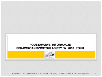 PODSTAWOWE INFORMACJE SPRAWDZIAN SZÓSTOKLASISTY W 2016 ROKU Okręgowa Komisja Egzaminacyjna w Gdańsku, tel. (058) 320 55 92, e-mail: [email protected] 1 SŁOWNICZEK • Część I sprawdzianu – j. polski z treściami z historii, matematyka z treściami z przyrody • Część II sprawdzianu – język angielski • Czas regulaminowy dla uczniów – obowiązuje wszystkich uczniów, którzy nie mają zaleceń PPP, nie mają wskazań zdrowotnych • Uczniowie uprawnieni – uczniowie, którzy mają zalecenia PPP, zaświadczenia lekarskie Okręgowa Komisja Egzaminacyjna w Gdańsku, tel. (058) 320 55 92, e-mail: [email protected] 2 HARMONOGRAM SPRAWDZIANU W 2016 r. Data 5 kwietnia (wtorek) 2 czerwca – termin dodatkowy Część egzaminu część I Godzina rozpoczęcia Czas trwania regulaminowy wydłużony dla uprawnionych 9.00 80 min 120 min 11.45 45 min 70 min język polski i matematyka część II język obcy CZY MOGĘ SIĘ SPÓŹNIĆ? • W uzasadnionych przypadkach spóźniony uczeń może być wpuszczony do sali – o ile nie zakończyły się w niej czynności organizacyjne. • Uczeń taki kończy pracę razem ze wszystkimi uczniami. Okręgowa Komisja Egzaminacyjna w Gdańsku, tel. (058) 320 55 92, e-mail: [email protected] 4 ZWOLNIENIE ZE SPRAWDZIANU • Laureaci – zwolnieni z pisania odp. części sprawdzianu – maksymalna liczba punktów • Jeżeli uczeń nie przystąpił do sprawdzianu (lub jego części) z przyczyn zdrowotnych/losowych w kwietniu oraz czerwcu, to dyrektor składa wniosek do OKE o zwolnienie. • Uczniowie zwolnieni ze sprawdzianu decyzją dyrektora OKE, otrzymują informację wynikach sprawdzianu z adnotacją „zwolniony”. Tacy uczniowie nie otrzymują zaświadczenia. Okręgowa Komisja Egzaminacyjna w Gdańsku, tel. (058) 320 55 92, e-mail: [email protected] 5 SERWIS DLA UCZNIÓW Adres: www.oke.gda.pl Logowanie się: Serwis OKE LOGIN nadany przez OKE, przekazany przez dyrektora szkoły Serwis dla uczniów HASŁO – PESEL zdającego Uczeń korzysta z Serwisu dla uczniów, aby sprawdzić poprawność swoich danych osobowych i ewentualne błędy zgłosić dyrektorowi szkoły*. W marcu *Dyrektor szkoły wprowadza zmiany w aplikacji Hermes uzyskać informacje o indywidualnych wynikach egzaminu gimnazjalnego 6 INFORMACJE DLA UCZNIÓW O WARUNKACH PRZEBIEGU SPRAWDZIANU • • • • • przydział do sal egzaminacyjnych wyznaczenie miejsca i czasu zgłoszenia się przez uczniów do szkoły przebieg egzaminu (w tym organizacja przerw) Serwis dla uczniów Informacja dla ucznia prawa i obowiązki zdającego dotycząca przebiegu egzaminu • • • zasady kodowania arkusza egzaminacyjnego zasady postępowania z arkuszem zasady wypełniania karty odpowiedzi Instrukcja/Informacja zamieszczona na pierwszej stronie arkusza egzaminacyjnego Okręgowa Komisja Egzaminacyjna w Gdańsku, tel. (058) 320 55 92, e-mail: [email protected] 7 W DNIU EGZAMINU • godz. 8. 30 - uczniowie zgłaszają się do szkoły • godz. 8.40 - wpuszczanie uczniów do sal • godz. 8.50 – delegacja uczniów z każdej sali wraz z nauczycielem odbierają w gabinecie dyrektora testy Po napisaniu I etapu sprawdzianu uczniowie nie opuszczają terenu szkoły. Czas między częściami sprawdzianu spędzają w stołówce • 11.30 - wpuszczanie uczniów do sal na II etap sprawdzianu Okręgowa Komisja Egzaminacyjna w Gdańsku, tel. (058) 320 55 92, e-mail: [email protected] 8 PRZYDZIAŁ MIEJSC W SALI EGZAMINACYJNEJ • Zdający wchodzą do sali egzaminacyjnej pojedynczo według kolejności na liście i losują numery stolików, przy których będą pracowali. • Losowanie w danym dniu odbywa się jednokrotnie, przed rozpoczęciem pierwszego z zakresów sprawdzianu. • Zdający powinni mieć przy sobie dokument stwierdzający tożsamość Od losowania można odstąpić w przypadku uczniów rozwiązujących zestawy dostosowane, korzystających z leków/ opieki medycznej lub w innych uzasadnionych przypadkach. Okręgowa Komisja Egzaminacyjna w Gdańsku, tel. (058) 320 55 92, e-mail: [email protected] 9 CO UCZNIOWIE WNOSZĄ DO SALI EGZAMINACYJNEJ • W przypadku każdej części sprawdzianu - długopis (lub pióro) z czarnym atramentem przeznaczony do zapisywania rozwiązań (odpowiedzi). • Dodatkowo w przypadku I części sprawdzianu – linijkę. • Rysunki – jeżeli trzeba je wykonać – zdający wykonują długopisem. Nie wykonuje się rysunków ołówkiem. • Małą butelkę wody - szkoła zabezpieczy (podczas pracy z arkuszem butelka powinna stać przy nodze stolika) Okręgowa Komisja Egzaminacyjna w Gdańsku, tel. (058) 320 55 92, e-mail: [email protected] 10 CZYNNOŚCI ORGANIZACYJNE Uczeń: • Zapoznaje się z Instrukcją z pierwszej strony arkusza • Sprawdza liczbę stron arkusza i jakość wydruku • Zgłasza braki i usterki w celu wymiany arkusza (w razie potrzeby) • Koduje arkusz: zeszyt zadań egzaminacyjnych, kartę odpowiedzi oraz kartę rozwiązań zadań egzaminacyjnych zgodnie z oznaczeniami • Pracę z arkuszem rozpoczyna na znak ZN 11 KODOWANIE PRAC Zdający bez uprawnień do dostosowania warunków sprawdzianu Zdający ze specyficznymi trudnościami w uczeniu się – dysleksja (w naszej szkole tylko takie przypadki) Koduje umieszczając w wyznaczonych miejscach o trzyznakowy kod o numer PESEL o naklejki przygotowane przez OKE Arkusze tych uczniów kodują członkowie zespołu nadzorującego w ramach czynności organizacyjnych W tych dwóch polach uczeń umieszcza naklejki ze swoim numerem PESEL 13 PRZYKŁADOWA KARTA ODPOWIEDZI Kod kreskowy arkusza Nie zaklejać Nalepkę z kodem kreskowym ucznia należy umieścić w miejscu na nią przeznaczonym, nie na kodzie kreskowym arkusza. ! Nalepka z kodem kreskowym ucznia ! 14 Budowa arkuszy sprawdzianu DO CZĘŚCI PIERWSZEJ DO CZĘŚCI DRUGIEJ 15 Uczeń nie podpisuje arkusza i karty odpowiedzi oraz • rozpoczyna pracę z arkuszem na znak nauczyciela • samodzielnie pracuje z arkuszem • wypełnia karty odpowiedzi wyłą