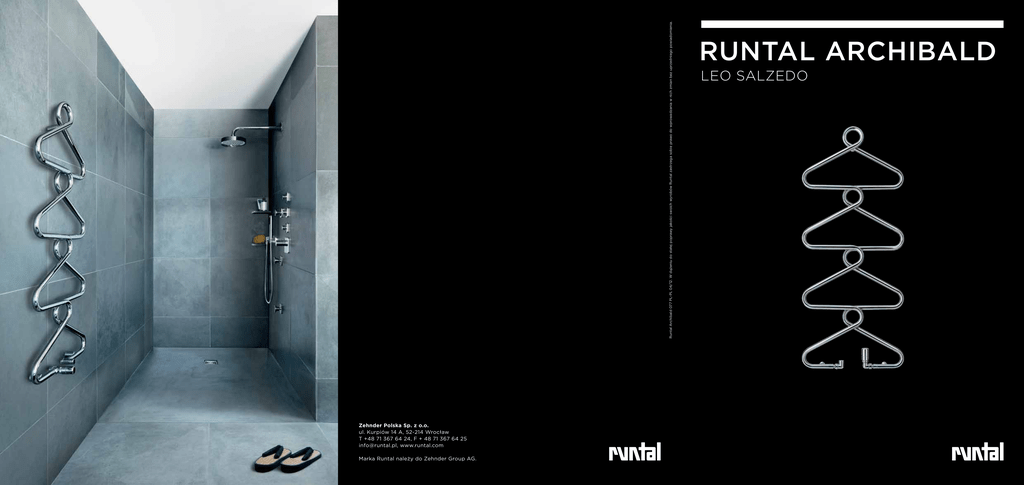 Runtal Archibald 077 PL-PL 04/12. W dążeniu do stałej poprawy jakości swoich wyrobów Runtal zastrzega sobie prawo do wprowadzania w nich zmian bez uprzedniego powiadomienia. Zehnder Polska Sp. z o.o. ul. Kurpiów 14 A, 52-214 Wrocław T +48 71 367 64 24, F + 48 71 367 64 25 [email protected], www.runtal.com Marka Runtal należy do Zehnder Group AG. RUNTAL ARCHIBALD LEO SALZEDO RUNTAL ARCHIBALD. Zawsze do usług. Ten jedyny w swoim rodzaju grzejnik o wyjątkowym designie jest elegancki, a przy tym wysoce funkcjonalny. RUNTAL ARCHIBALD jest idealnym i praktycznym elementem wyposażenia łazienki, który ogrzewa i suszy ręczniki oraz tworzy przyjemną i przytulną atmosferę. Uformowany z jednego Leo Salzedo urodził się w 1977 r. w Padwie we Włoszech. Studiował wzornictwo przemysłowe w Scuola Italiana Design w Padwie. Po zdobyciu dyplomu w 2002 r. przez kilka lat był projektantem w szwedzkiej grupie Electrolux. Od 2008 r. mieszka w Sztokholmie, gdzie jako członek grupy projektantów przemysłowych NoPicnic projektuje wzory dla wielonarodowych przedsiębiorstw, takich jak Sony Ericsson, Electrolux i Absolut Company. Wyjątkowo oryginalny projekt Leo, jakim jest grzejnik RUNTAL ARCHIBALD, zdobył pierwszą nagrodę w międzynarodowym konkursie wzornictwa „Radical Radiators of the Future”. SPECYFIKACJA TECHNICZNA 525 104–108 1240 RUNTAL ARCHIBALD LEO SALZEDO 104–108 WIDOK Z PRZODU WIDOK Z BOKU WIDOK Z GÓRY fragmentu wygiętej rury stalowej wyróżnia się wyjątkowym kształtem i niepowtarzalną konstrukcją. Projektant Leonardo Salzedo stworzył stylowy i nowoczesny element wyposażenia, który łączy funkcjonalność i wyjątkowe wzornictwo. Przyłącze OPIS Nowatorski grzejnik RUNTAL ARCHIBALD o wyjątkowym designie przeznaczony jest do łazienki i kuchni. Elementom grzejnym nadano elegancki kształt kolumny wieszaków ubraniowych, przy czym całość jest wykonana z jednego fragmentu wygiętej rury stalowej. Ten dekoracyjny grzejnik, zaprojektowany w taki sposób, aby zajmował jak najmniej miejsca, jest przeznaczony do suszenia i ogrzewania aż czterech ręczników. RUNTAL ARCHIBALD jest wyposażony w dwa przyłącza o średnicy ½" do instalacji centralnego ogrzewania; jest dostępny w wersji chromowanej lub lakierowanej proszkowo na kolor biały. DANE TECHNICZNE Nazwa ARBR/ARBRC Wysokość 1240 mm Szerokość 525 mm Przyłącza 2×½" przyłącza środkowe, 1×¼" odpowietrzenie u góry ZaworyPatrz cennik Akcesoria KolorPowierzchnia lakierowana proszkowo na kolor biały (RAL 9016) lub chromowana Moc grzewcza 305 W (RAL 9016), 244 W (chromowany) Norma
