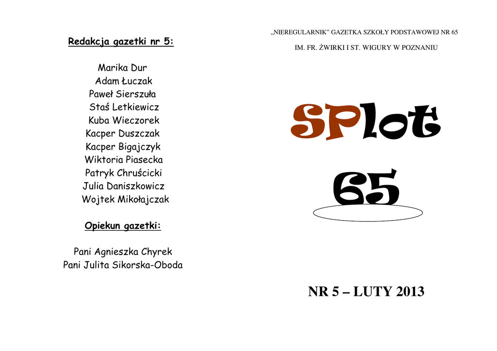 „NIEREGULARNIK” GAZETKA SZKOŁY PODSTAWOWEJ NR 65 Redakcja gazetki nr 5: Marika Dur Adam Łuczak Paweł Sierszuła Staś Letkiewicz Kuba Wieczorek Kacper Duszczak Kacper Bigajczyk Wiktoria Piasecka Patryk Chruścicki Julia Daniszkowicz Wojtek Mikołajczak IM. FR. ŻWIRKI I ST. WIGURY W POZNANIU SPlot 65 Opiekun gazetki: Pani Agnieszka Chyrek Pani Julita Sikorska-Oboda NR 5 – LUTY 2013 Życzenia walentynkowe od redakcji. WSTĘPNIAK Witajcie! Już po raz piąty witamy wszystkich czytelników szkolnej gazetki „SPlot65”. Tym razem mamy coś dla znawców motoryzacji oraz miłośników pewnych czworonogów. Czy wiecie o kogo chodzi? Odpowiedz znajdziecie … oczywiście wewnątrz czasopisma. I coś dla dziewczyn i nie tylko. Święty Walenty nadchodzi i już nam serduszko szybciej bije… Bo która z nas nie chciałaby otrzymać kartki w kształcie serca czy słodkiej czekolady??? I jeszcze szczypta humoru dla lubiących się śmiać. A co jeszcze w tym numerze? Oczywiście SPORT i nie tylko! Dzień szczęśliwy, dzień jedyny, dzień Św. Walentego, a więc pragniemy złożyć Wam życzenia: zdrowia, szczęścia, powodzenia. W każdej chwili i godzinie niech Wam słodko życie płynie. Takie to Tobie, Drogi Czytelniku, śle redakcja życzenia. Zespół „SPlot65” Miłej lektury! ☺ REDAKCJA KUPON Po odbiór nagrody prosimy zgłosić się, wraz z tym numerem gazetki, do pani Agnieszki Chyrek. MIERZYMY WYSOKO Uwaga artykuł tylko dla dziewczyn!!! Nasi studenci Kolorowego Uniwersytetu, uczniowie klasy III a, pod opieką wychowawczyni pani Barbary Plucińskiej wysłuchali kolejnego wykładu. Tym razem odwiedzili Wydział Studiów Edukacyjnych UAM i uczestniczyli w zajęciach prowadzonych przez prof. dr hab. Kingę Kuszak na temat "Pełen słodyczy czas zabawy. Dlaczego dzieci (i nie tylko) lubią się bawić?". W czasie wykładu poruszona została kwestia, czym jest zabawa, jakie funkcje pełni w życiu człowieka. Młodzi studenci dowiedzieli się też, jak bawili się ich pradziadkowie i dziadkowie, czy w zabawy lubiane kiedyś bawimy się dzisiaj. Walentynki KLASA III A na uczelni UAM Dzień zakochanych to dzień, gdzie każda z nas czeka na drobiazg od swojego ukochanego ☺. Jak to przyjemnie jest dostać niespodziankę… A oto kilka pomysłów, jak ucieszyć swoją sympatię. Słodki prezent w postaci czekoladek na pewno osłodzi życie każdemu. Czekolada to podobno afrodyzjak, prawda? Dla zapalonego sportowca, jeśli chcesz go totalnie zaskoczyć, możesz wystarać się o autograf znanego zawodnika. Uciesz go również nowa frotka albo rękawice bramkarskie. Oczywiście pamiętamy, że każdy ma inne hobby i należy prezent dopasować do zainteresowań wybranka. Mamy nadzieję, że wszyscy tego dnia zostaną uszczęśliwieni przez drugą połówkę. REDAKCJA Zwycięskie prace w konkursie na najlepsze wypracowanie pt. „Moja szkoła jest najlepsza”. Autobus Jelcz W latach 70-tych najbardziej popularnym pojazdem jeżdżącym po ulicach naszego miasta był autobus Jelcz nazywany pieszczotliwie „ogórkiem”. Produkcja tego autobusu rozpoczęła się w 1958r. w Jelczańskich Zakładach Samochodowych. Była to konstrukcja licencyjna budowana na podwoziu Skody i nadwoziu Karosa. Autobusy posiadały ręcznie otwierane drzwi i podwójne siedzenia na całej długości. W 1963r. drzwi zyskały napęd pneumatyczny. Mogły przewieźć 51 pasażerów i dwóch członków obsługi. Zużycie paliwa 35 litrów na 100 km. Pierwsze „ogórki” dotarły do Poznania w 1959r. Obecnie odrestaurowany pojazd wraz z przyczepką, potocznie nazwaną „korniszonem”, użytkowany jest przez Klub Miłośników Pojazdów Szynowych na trasach turystycznych. „Ogórek” kursuje dumnie z numerem linii 100. Kto jeszcze nim nie jechał, koniecznie musi wybrać się na wycieczkę po mieście. Nasz „ogórek” kursuje w okresie letnim. Trasę rozpoczyna z ulicy Gajowej (okolice starej zajezdni tramwajowej). Patryk Chruścicki VI a Moja szkoła jest najlepsza Moja szkoła naprawdę jest najlepsza. Mam bardzo miłą Panią wychowawczynię oraz fajne koleżanki i śmiesznych kolegów. W szkole mogę nauczyć się wielu rzeczy, np. czytać i pisać, a to pomaga mi korzystać z Internetu. Uwielbiam chodzić do biblioteki, bo jest tam wiele ciekawych książek, a pani bibliotekarka zawsze pomoże znaleźć to, czego szukam. Często odwiedzam sklepik szkolny, zwłaszcza wtedy, gdy mam ochotę na słodycze. Lubię chodzić na śniadanie do stołówki, bo mogę tam spotkać koleżanki z innych klas. Każda lekcja jest ciekawa i za to też lubię moją szkołę. A najfajniejsze są wycieczki, na które często jeździmy. Dzięki temu możemy poznawać nasz kraj. A najbardziej lubię moją szkołę a to, bo chodziła do niej moja mama i mój tata. Za moją szkołą tęsknię nawet podczas wakacji! Adrianna Wielechowska II b * * * Moja szkoła jest najlepsza Moja szkoła jest najlepsza, kolorowa i wesoła – no po prostu wymarzona. Ogrom wiedzy w niej zdobywam. Miejscem wrażeń dla mnie bywa. Nauczyciel – autorytet, który uczy i wyjaśnia. W mojej szkole jest konkursów wiele, każdy znajdzie coś dla siebie. W bibliotece Pani miła siedzi nad stosami książek, a w nich wiedzy i fantazji jest bez liku. Dziewczyny w koszykówkę grają i dla kibiców często wygrywają. W naszej szkole jest dużo radości, bo na twarzy Pani dyrektor uśmiech zawsze gości. Gdy nuda przerwę zajmie, to poczytać zawsze można, no bo w szkole jest gazetka, co ciekawą niesie treść. Nawet w soboty się spotykamy, nornic walking uprawiamy. Wiktoria Piasecka V a KARNAWAŁ Karnawał, zapusty to okres zimowych balów, maskarad, pochodów i zabaw. Rozpoczyna się najczęściej w dniu Trzech Króli, a kończy we wtorek przed Środą Popielcową, która oznacza początek wielkiego postu i oczekiwania na Wielkanoc. Nazwa karnawał pochodzi od włoskiego słowa carne vale, co oznacza pożegnanie miesiąca przed wielkim postem. Jest 