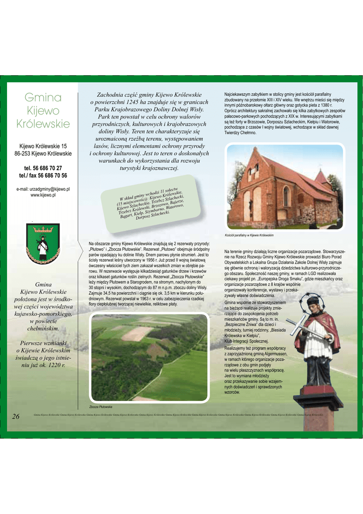 Gmina Kijewo Królewskie Kijewo Królewskie 15 86-253 Kijewo Królewskie tel. 56 686 70 27 tel./ fax 56 686 70 56 Zachodnia część gminy Kijewo Królewskie o powierzchni 1245 ha znajduje się w granicach Parku Krajobrazowego Doliny Dolnej Wisły. Park ten powstał w celu ochrony walorów przyrodniczych, kulturowych i krajobrazowych doliny Wisły. Teren ten charakteryzuje się urozmaiconą rzeźbą terenu, występowaniem lasów, licznymi elementami ochrony przyrody i ochrony kulturowej. Jest to teren o doskonałych warunkach do wykorzystania dla rozwoju turystyki krajoznawczej. e-mail: [email protected] www.kijewo.pl Najciekawszym zabytkiem w stolicy gminy jest kościół parafialny zbudowany na przełomie XIII i XIV wieku. We wnętrzu mieści się między innymi późnobarokowy ołtarz główny oraz gotycka pieta z 1380 r. Oprócz architektury sakralnej zachowało się kilka zabytkowych zespołów pałacowo-parkowych pochodzących z XIX w. Interesującymi zabytkami są też forty w Brzozowie, Dorposzu Szlacheckim, Kiełpiu i Watorowie, pochodzące z czasów I wojny światowej, wchodzące w skład dawnej Twierdzy Chełmno. ctw 11 sołewskie, chodzi miny w Kijewo Króle checki, g d ła k W s cowości): z Szla jerze, js Trzebc a (15 mie Szlacheckie, Brzozowo, B rowo, o i, k w s e ij w , Wato o K le n ó r r o K b z Trzebc t, Kiełp, Szymzlachecki. Bągar Dorposz S Kościół parafialny w Kijewie Królewskim Gmina Kijewo Królewskie położona jest w środkowej części województwa kujawsko-pomorskiego, w powiecie chełmińskim. Na obszarze gminy Kijewo Królewskie znajdują się 2 rezerwaty przyrody: „Płutowo” i „Zbocza Płutowskie”. Rezerwat „Płutowo” obejmuje śródpolny parów opadający ku dolinie Wisły. Dnem parowu płynie strumień. Jest to ścisły rezerwat leśny utworzony w 1956 r. Już przed II wojną światową ówczesny właściciel tych ziem zakazał wszelkich zmian w obrębie parowu. W rezerwacie występuje kilkadziesiąt gatunków drzew i krzewów oraz kilkaset gatunków roślin zielnych. Rezerwat „Zbocza Płutowskie” leży między Płutowem a Starogrodem, na stromym, nachylonym do 30 stopni i wysokim, dochodzącym do 87 m n.p.m. zboczu doliny Wisły. Zajmuje 34,5 ha powierzchni i ciągnie się ok. 3,5 km w kierunku południowym. Rezerwat powstał w 1963 r. w celu zabezpieczenia rzadkiej flory ciepłolubnej tworzącej niewielkie, reliktowe płaty. Pierwsze wzmianki o Kijewie Królewskim świadczą o jego istnieniu już ok. 1220 r. Na terenie gminy działają liczne organizacje pozarządowe. Stowarzyszenie na Rzecz Rozwoju Gminy Kijewo Królewskie prowadzi Biuro Porad Obywatelskich a Lokalna Grupa Działania Zakole Dolnej Wisły zajmuje się głównie ochroną i waloryzacją dziedzictwa kulturowo-przyrodniczego obszaru. Społeczność naszej gminy, w ramach LGD realizowała ciekawy projekt pn. „Europejska Droga Smaku”, gdzie mieszkańcy oraz organizacje pozarządowe z 8 krajów wspólnie organizowały konferencje, wystawy i przekazywały własne doświadczenia. Gmina wspólnie ze stowarzyszeniem na bieżąco realizuje projekty zmierzające do zaspokojenia potrzeb mieszkańców gminy. Są to m. in. „Bezpieczne Żniwa” dla dzieci i młodzieży, turniej rodzinny, „Biesiada Królewska w Kiełpiu”, Klub Integracji Społecznej. Realizujemy też program współpracy z zaprzyjaźnioną gminą Algermussen, w ramach którego organizacje pozarządowe z obu gmin podjęły na wielu płaszczyznach współpracę. Jest to wymiana młodzieży oraz przekazywanie sobie wzajemnych doświadczeń i sprawdzonych wzorców. Zbocza Płutowskie 26 Gmina Kijewo Królewskie Gmina Kijewo Królewskie Gmina Kijewo Królewskie Gmina Kijewo Królewskie Gmina Kijewo Królewskie Gmina Kijewo Królewskie Gmina Kijewo Królewskie Gmina Kijewo Królewskie Gmina Kijewo Królewskie Gmina Kijewo Królewskie Gmina Kijewo Królewskie Działalność stowarzyszenia opiera się na realizacji Lokalnej Strategii Rozwoju, mającej na celu podniesienie atrakcyjności turystycznej w oparciu o dziedzictwo przyrodniczo-kulturowe, integrację i aktywizację społeczności lokalnej oraz rozwój i wypromowanie produktów lokalnych i tradycyjnych obszaru Zakola Dolnej Wisły. tego d 16 lu tnieje oedstawicieli is ie n cz rz mie Porozur. zrzeszając plicznego, społe 2006 torów: pub arczego. od sek trzech nego i gosp LSR tworzyli członkowie grupy, osoby zaangażowane społecznie w rozwój lokalny, dostrzegające szanse, które niosły za sobą środki unijne kierowane na obszary wiejskie. Aktywność ludzi działających w strukturach LGD zaowocowała stworzeniem instytucji, wyposażonej w środki finansowe i techniczne oraz w przeszkoloną kadrę. Instytucji, która reprezentuje interesy lokalnych społeczności i służy pomocą mieszkańcom wsi. Przykłady dobrych praktyk Działalność Stowarzyszenia była wielokrotnie nagradzana w różnych konkursach regionalnych i ogólnopolskich, m.in. • I nagroda Ministra Rolnictwa i Rozwoju Wsi w ogólnopolskim konkursie na „Najlepszy projekt mający na celu promocję regionu za pomocą produktu regionalnego lub tradycyjnego” • „Odkrywca 2008” I miejsce w kategorii „Promocja Turystyczna Regionu” Udział w projektach międzynarodowych: • europejski projekt „European Taste Trail Network” (Europejska Sieć Drogi Smaku), który uczył promować i waloryzować produkty tradycyjne w 9 krajach europejskich • „Szlak Bursztynowy Greenways” biegnący przez Węgry, Słowację, Polskę do Bałtyku, zakładający promocję lokalnego dziedzictwa kulturowo-przyrodniczego i wykorzystanie go w celach turystycznych Publikacje: • „Przewodnik turystyczny” opisujący walory przyrodnicze – kulturalne regionu Zakola Dolnej Wisły • dwie edycje z serii „Produkty Lokalne i Tradycyjne” promujące produkty z Konkursu Marki Lokalnej Zakola Dolnej Wisły • folder „Kraina miodem i mlekiem płynąca” o tradycjach pszczelarskich Doliny Dolne