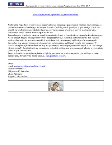 Dane pochodzą ze strony: http://www.jarocin.org/. Wygenerowano dnia: 07-03-2017. Przeszczep włosów, sposób na wypadanie włosów Nadmierne wypadanie włosów może doprowadzić do znacznego pogorszenia wyglądu zewnętrznego, a tym samym samopoczucia psychicznego człowieka. Należy jednak pamiętać o tym istnieje skuteczny sposób na wyeliminowanie skutków łysienia, czyli przeszczep włosów, o którym można się wiele dowiedzieć dzięki stronie przeszczep-wlosow.net. Transplantacja włosów to zabieg o małej inwazyjności, który wykonuje się w znieczuleniu miejscowym. W ten sposób pacjent ma zagwarantowane bezpieczeństwo, a także nie jest narażony na ból. Podczas zabiegu dokonuje się pobrania malutkich wycinków skóry owłosionej bądź mieszków włosowych. Pozwalają one na przywrócenie owłosienia tym partiom ciała, na których zostało ono utracone. W trakcie transplantacji lekarz dba o to, aby nie pozostawić na ciele pacjenta widocznych blizn. Po zabiegu nie ma potrzeby hospitalizacji, co oznacza, że człowiek poddawany przeszczepowi włosów wychodzi do domu w tym samym dniu. Przed poddanie się transplantacji dobrze byłoby zapoznać się z informacjami o tym zabiegu, a zatem namawiamy do wizyty na naszej stronie. transplantacja włosów Dane: email: [email protected] telefon: 695858125 Miejscowość: Wrocław ulica: Rajska 73 Region: Cały Powiat